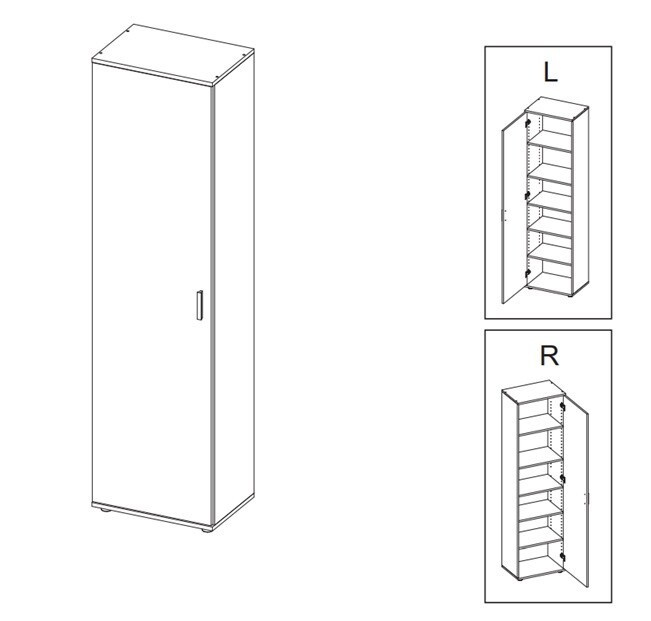 Skříň je vybavena plastovými rukojeťmi, které zajišťují pohodlné otevírání a zavírání. Standardní panty a výsuvné pojezdy zásuvek na standardních kolejnicích zajišťují hladký a tichý chod. Skříň je postavena na glides, což usnadňuje její přesun a chrání podlahu před poškrábáním.