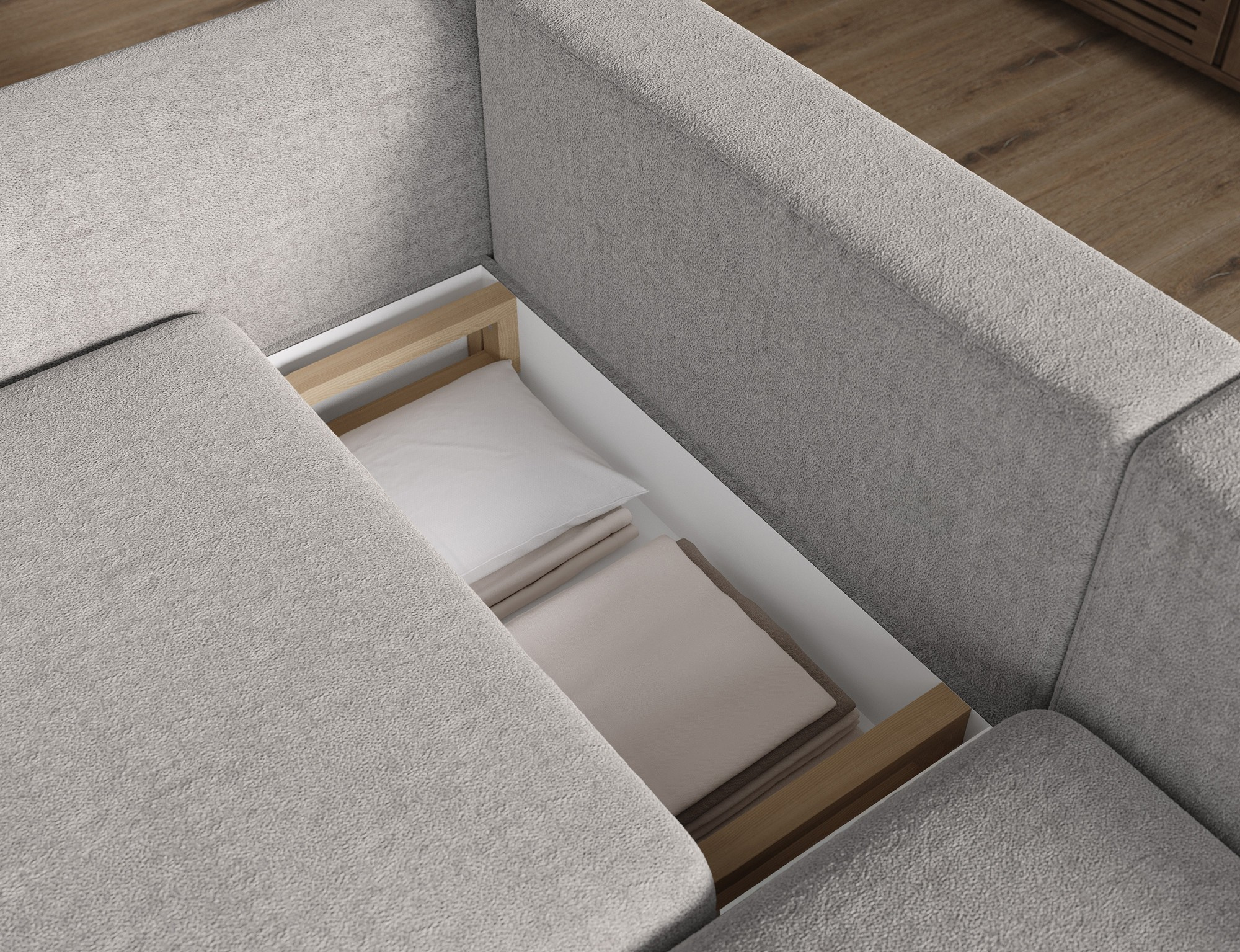 - Úložný prostor: Sedací souprava je vybavena praktickým úložným prostorem, který vám umožní snadno uschovat deky, polštáře nebo jiné předměty, které chcete mít po ruce, ale zároveň je mít úhledně uklizené.
