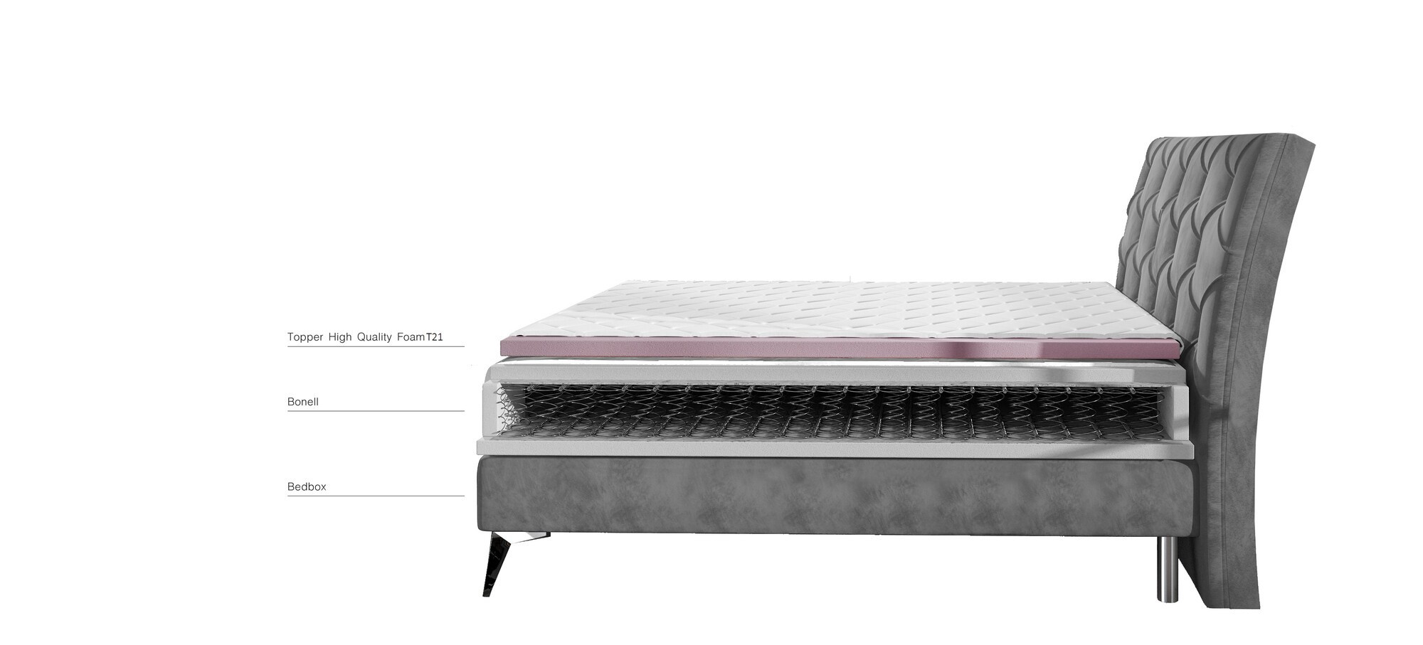 Adel je velmi stylová a mimořádně pohodlná kontinentální postel typu boxspring v glamour stylu. Tento model, dostupný ve třech velikostech: 145/165/185 x 215 x 118 cm, je dodáván s pevným 20 cm vysokým bonellovým matrací a robustním rámem čalouněným potahem, který je k dispozici v mnoha barvách. Kromě toho, díky mechanismu, který funguje pomocí automatické pružiny - horní část postele se zvedá, což uživateli nábytku umožňuje přístup ke dvěma prostorným úložným boxům na lůžkoviny, rozděleným na tři části. Dalšími charakteristickými rysy postele Adel jsou elegantní kovové nohy se stříbrným leskem, vysoké 13 cm, hluboké sedadlo a vysoké opěradlo nakloněné dozadu, zdobené prošíváním. Pokud máte zájem o pohodlnou, stejně jako flexibilní a pevnou postel, která si zachovává správnou pružnost a pevnost, a zároveň je funkční a pečlivě dokončená z hlediska designu - zveme vás, abyste se zajímali o naši Boxspring. S Eltapem je zaručena úplná spokojenost vyplývající z používání produktu.