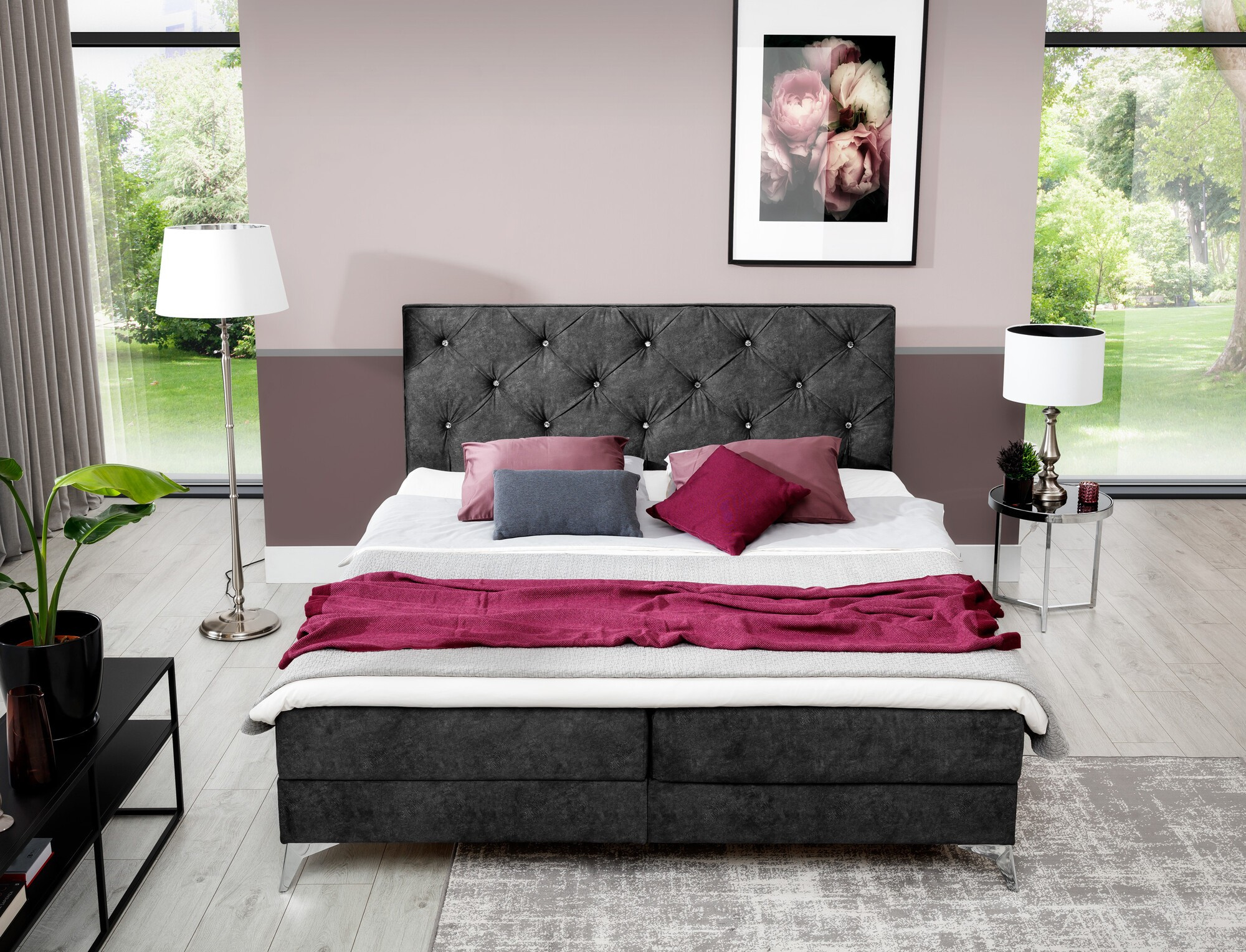 Adel je velmi stylová a mimořádně pohodlná kontinentální postel typu boxspring v glamour stylu. Tento model, dostupný ve třech velikostech: 145/165/185 x 215 x 118 cm, je dodáván s pevným 20 cm vysokým bonellovým matrací a robustním rámem čalouněným potahem, který je k dispozici v mnoha barvách. Kromě toho, díky mechanismu, který funguje pomocí automatické pružiny - horní část postele se zvedá, což uživateli nábytku umožňuje přístup ke dvěma prostorným úložným boxům na lůžkoviny, rozděleným na tři části. Dalšími charakteristickými rysy postele Adel jsou elegantní kovové nohy se stříbrným leskem, vysoké 13 cm, hluboké sedadlo a vysoké opěradlo nakloněné dozadu, zdobené prošíváním. Pokud máte zájem o pohodlnou, stejně jako flexibilní a pevnou postel, která si zachovává správnou pružnost a pevnost, a zároveň je funkční a pečlivě dokončená z hlediska designu - zveme vás, abyste se zajímali o naši Boxspring. S Eltapem je zaručena úplná spokojenost vyplývající z používání produktu.