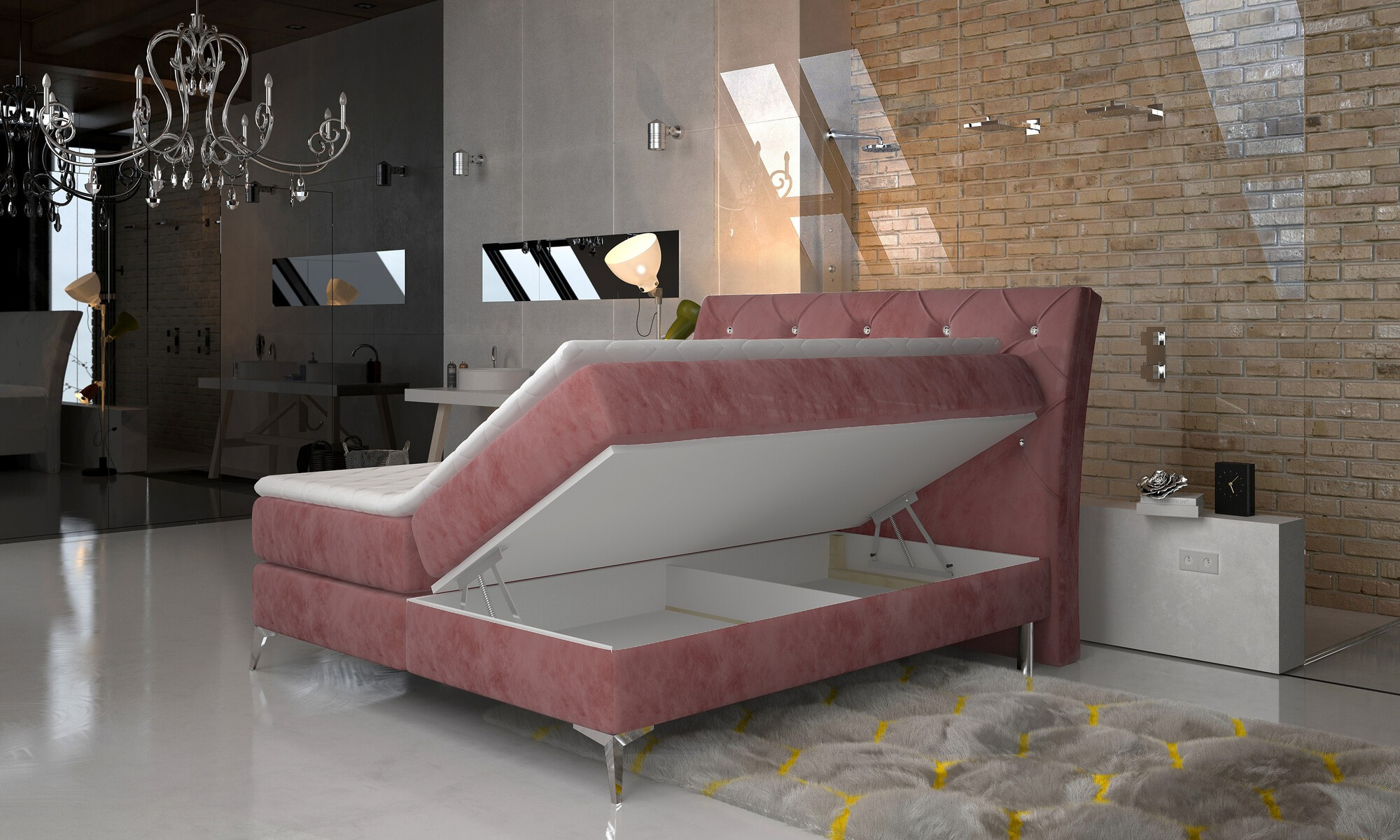 Adel je velmi stylová a mimořádně pohodlná kontinentální postel typu boxspring v glamour stylu. Tento model, dostupný ve třech velikostech: 145/165/185 x 215 x 118 cm, je dodáván s pevným 20 cm vysokým bonellovým matrací a robustním rámem čalouněným potahem, který je k dispozici v mnoha barvách. Kromě toho, díky mechanismu, který funguje pomocí automatické pružiny - horní část postele se zvedá, což uživateli nábytku umožňuje přístup ke dvěma prostorným úložným boxům na lůžkoviny, rozděleným na tři části. Dalšími charakteristickými rysy postele Adel jsou elegantní kovové nohy se stříbrným leskem, vysoké 13 cm, hluboké sedadlo a vysoké opěradlo nakloněné dozadu, zdobené prošíváním. Pokud máte zájem o pohodlnou, stejně jako flexibilní a pevnou postel, která si zachovává správnou pružnost a pevnost, a zároveň je funkční a pečlivě dokončená z hlediska designu - zveme vás, abyste se zajímali o naši Boxspring. S Eltapem je zaručena úplná spokojenost vyplývající z používání produktu.