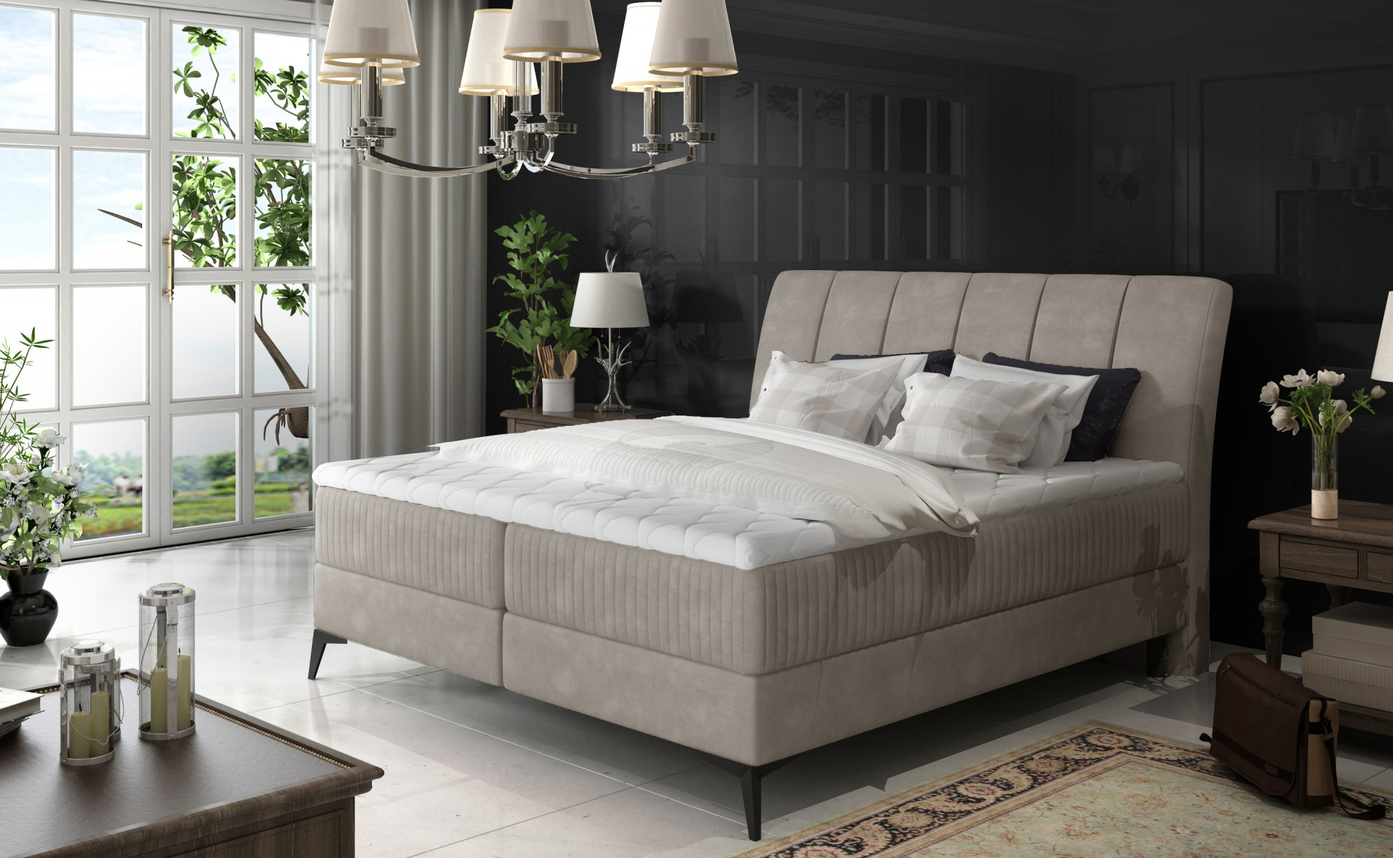 Popisujeme-li naši postel Boxspring Aderito několika slovy, můžeme říci, že je to kombinace modernosti, elegance, dobrého stylu a maximálního pohodlí s velkou funkčností. Prostorná postel s rozměry: 140/160/180 x 200 cm je ideálním místem pro spánek i odpočinek kdykoli jindy. Mezi další výhody tohoto modelu můžeme zařadit pevnou matraci a robustní čalouněný rám, doplněné o prostorné 2 úložné prostory na ložní prádlo. Vysoká úroveň pohodlí je ovlivněna výplní sedáku postele, která kombinuje bonelovou matraci s pružnou pěnou T25 a 4 cm topperem z pěny T30. Další odlišení je také ovlivněno původním designem postele ve formě: vkusného čalounění s jemným dotykem, šikmého čela a černých kovových nohou o výšce 14 cm. Aderito je ztělesněním řemeslného designu, elegance a třídy - stojí za to mít takovou postel ve své ložnici.
