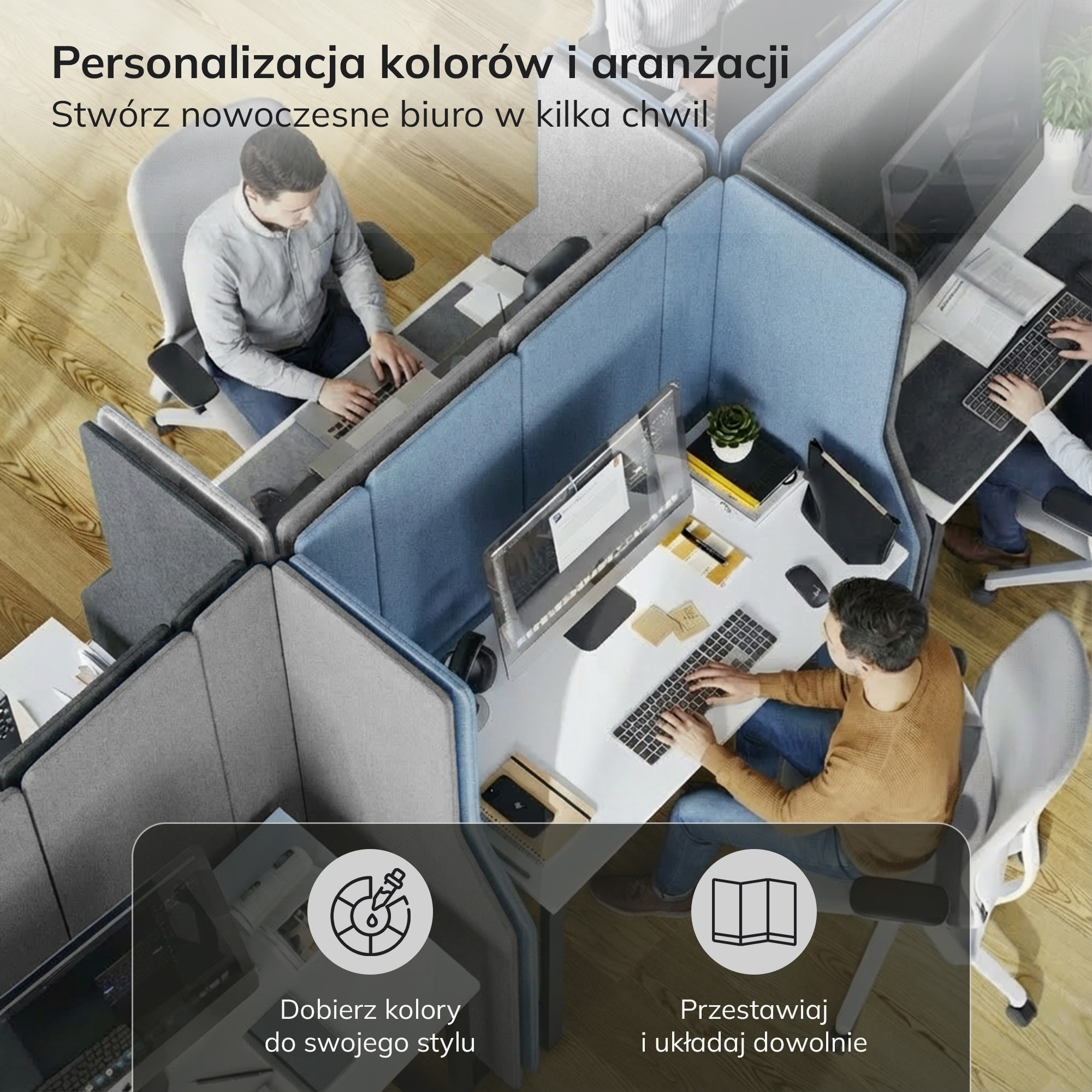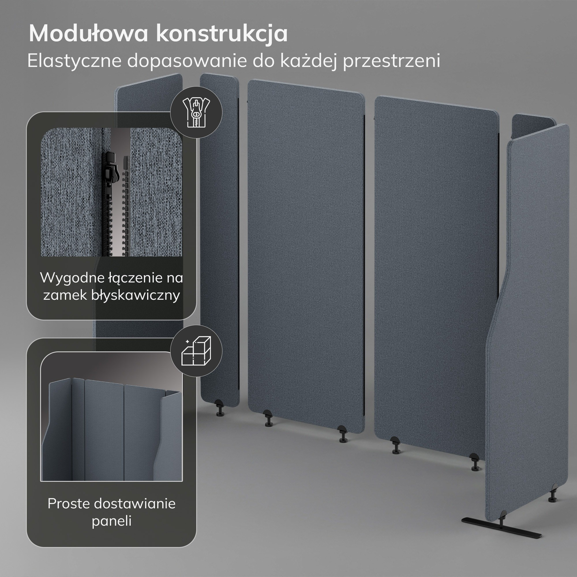 Modulární systém spojování panelů pomocí zipu umožňuje snadnou konfiguraci a přizpůsobení prostoru vašim potřebám. Můžete libovolně kombinovat barvy a přidávat další panely. Během několika okamžiků zvětšíte zónu klidu nebo ji přesunete na jiné místo. Flexibilita uspořádání je klíčem k moderní a efektivní kanceláři.
