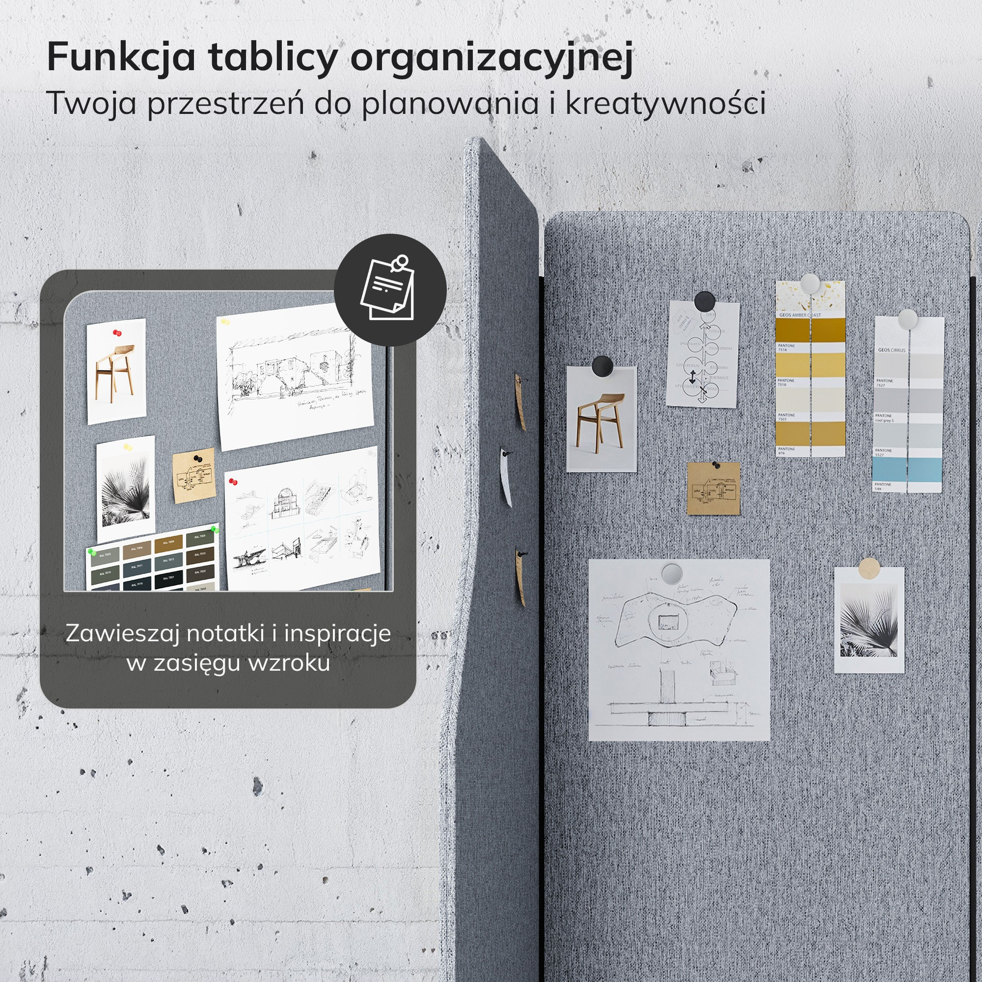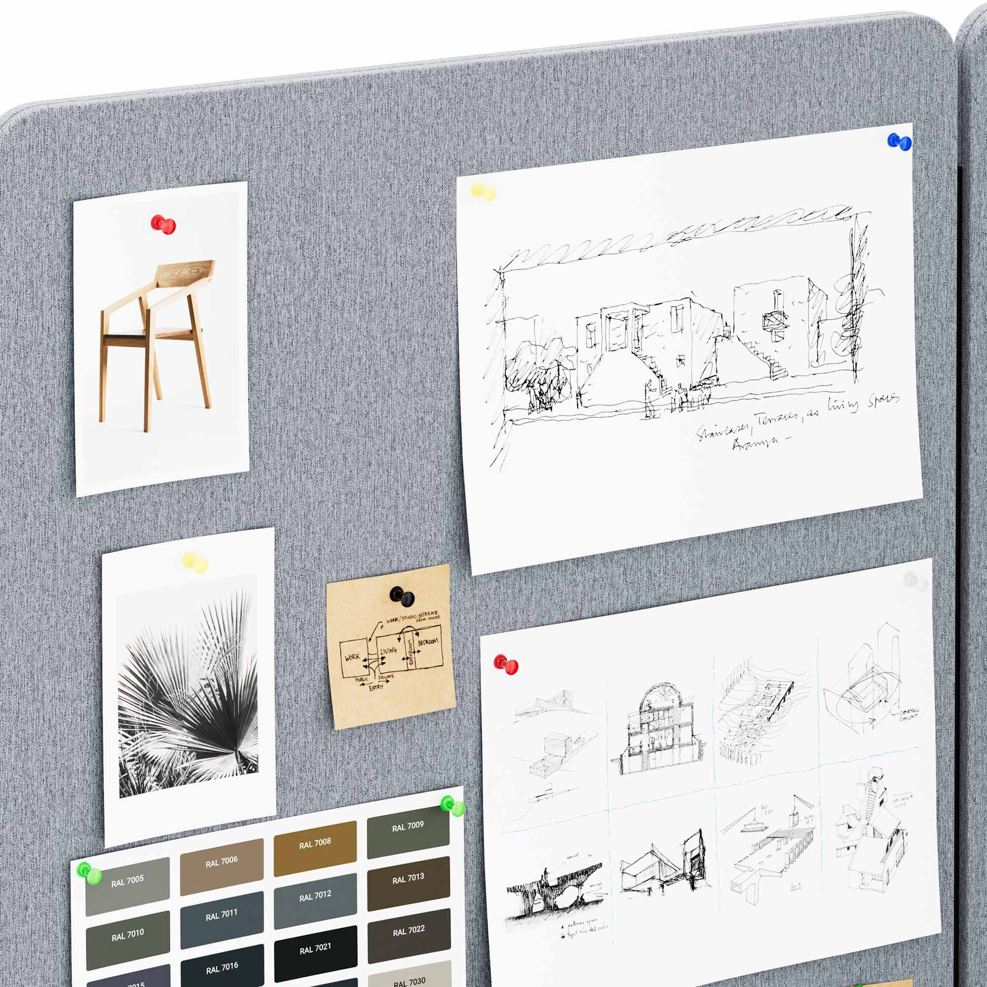 Akustická stěna SADIE vám pomůže zorganizovat prostor a ušetřit místo. Povrch stěny lze využít jako organizační tabuli pro připínání poznámek a důležitých informací. Můžete si tak snadno vytvořit přehledné a uspořádané pracovní prostředí.