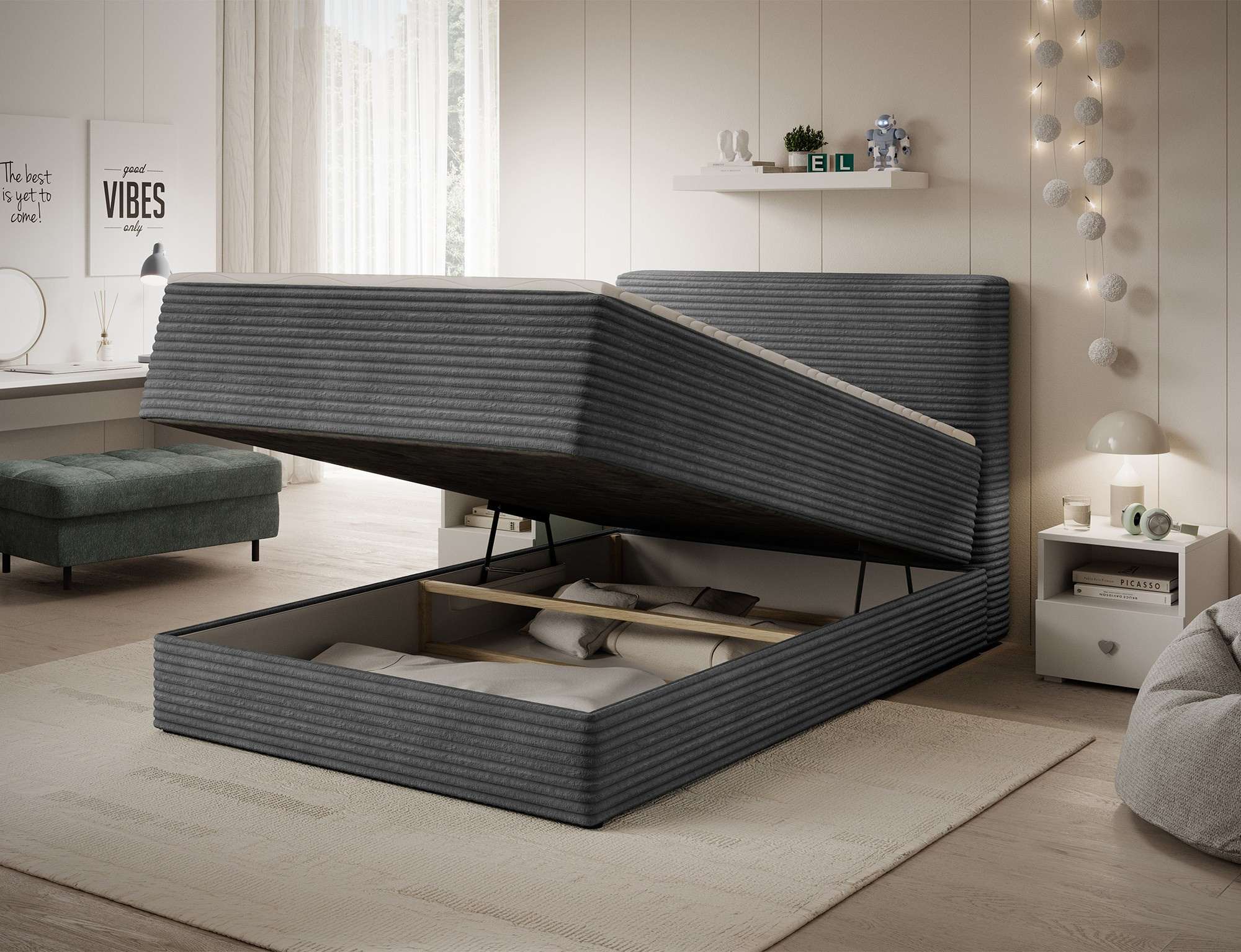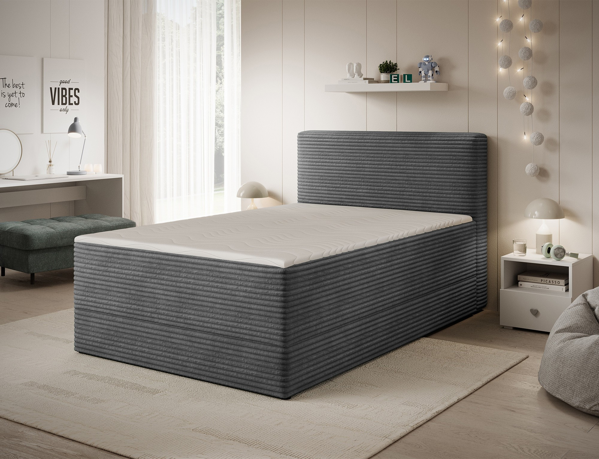 Objevte dokonalou kombinaci elegance, pohodlí a funkčnosti s naší čalouněnou postelí boxspring ALAMITO. Tato postel je navržena tak, aby splnila všechny vaše potřeby pro kvalitní spánek a zároveň se stala stylovým doplňkem vaší ložnice.