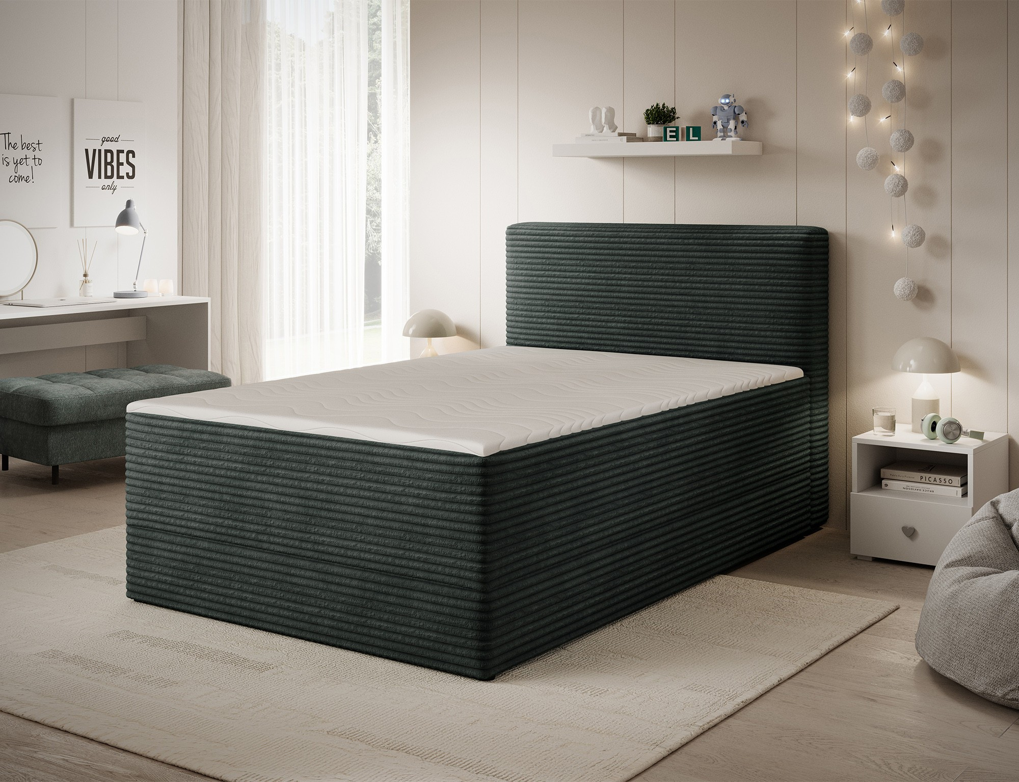 Objevte dokonalou kombinaci elegance, pohodlí a funkčnosti s naší čalouněnou postelí boxspring ALAMITO. Tato postel je navržena tak, aby splnila všechny vaše potřeby pro kvalitní spánek a zároveň se stala stylovým doplňkem vaší ložnice.
