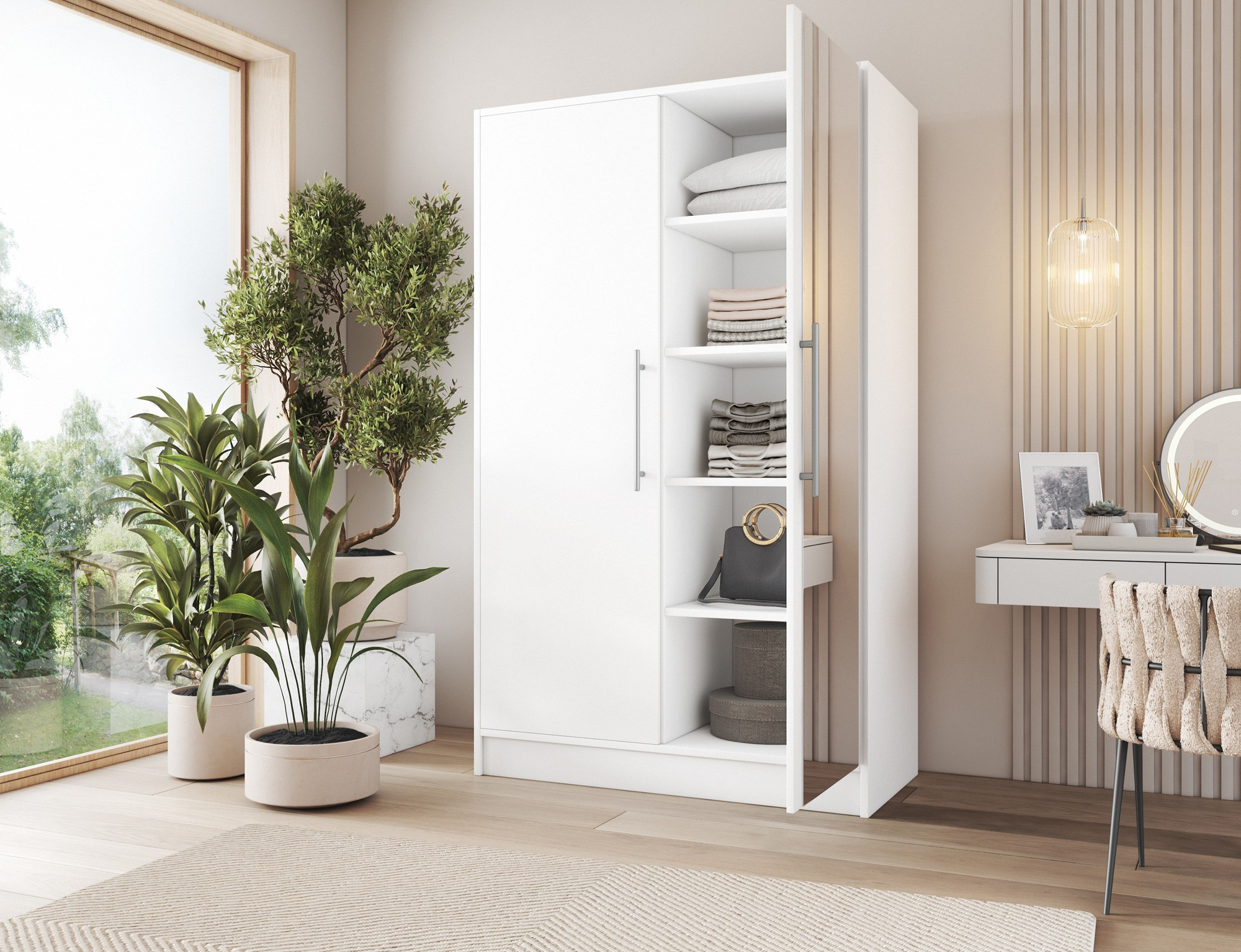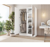Šatní skříň Alarica je prostorná a robustní skříň na oblečení navržená pro pohodlné uložení oblečení a doplňků v domácnostech různých velikostí. S rozměry 120 cm na šířku, 200 cm na výšku a 60 cm do hloubky nabízí velkorysý využitelný prostor, přičemž si zachovává proporce, které umožňují snadné umístění ve většině interiérových uspořádání. Tělo i přední část jsou vyrobeny z odolné laminované desky, což zajišťuje odolnost vůči každodennímu používání, snadné čištění a atraktivní vzhled po mnoho let. Uvnitř skříně se nacházejí 4 praktické police o rozměrech 57 × 37 × 51 cm, každá s maximální nosností až 8 kg—ideální pro složené oblečení, domácí textilie nebo organizéry—zatímco 2 závěsné tyče doplňují sestavu, což vám umožní pohodlně pověsit košile, šaty, kabáty a další oděvy bez pomačkání. Další výhodou je zrcadlo na přední straně, které opticky zvětšuje místnost a usnadňuje každodenní přípravy. Šatní skříň Alarica váží 120 kg, což zdůrazňuje stabilitu její konstrukce, a je dodávána ve 3 baleních (66 × 206 × 7 cm – 45 kg, 66 × 125 × 7 cm – 45 kg, 62 × 190 × 4 cm – 28 kg), což usnadňuje přepravu a přenášení dovnitř—vynikající volba pro každého, kdo hledá funkční, moderní a odolnou šatní skříň s policemi, závěsnými tyčemi a zrcadlem pro úhledně organizované ukládání oblečení.