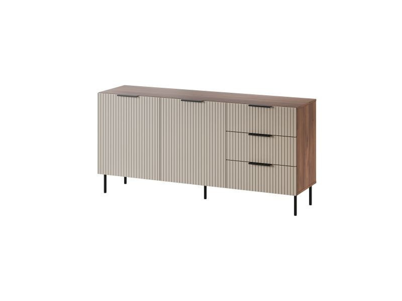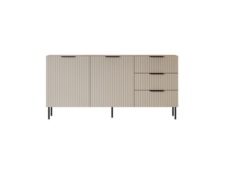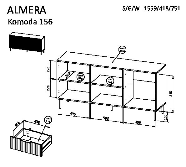 ALMERA komoda TYP 1 rozměry: V/Š/H - 75cm/156cm/42cm materiál: korpus: dřevotřísková deska 16 mm čela: MDF deska 16mm s viditelnými frézami Nohy: kovové (černé), výška 15 cm Úchyt: kovové, černé
