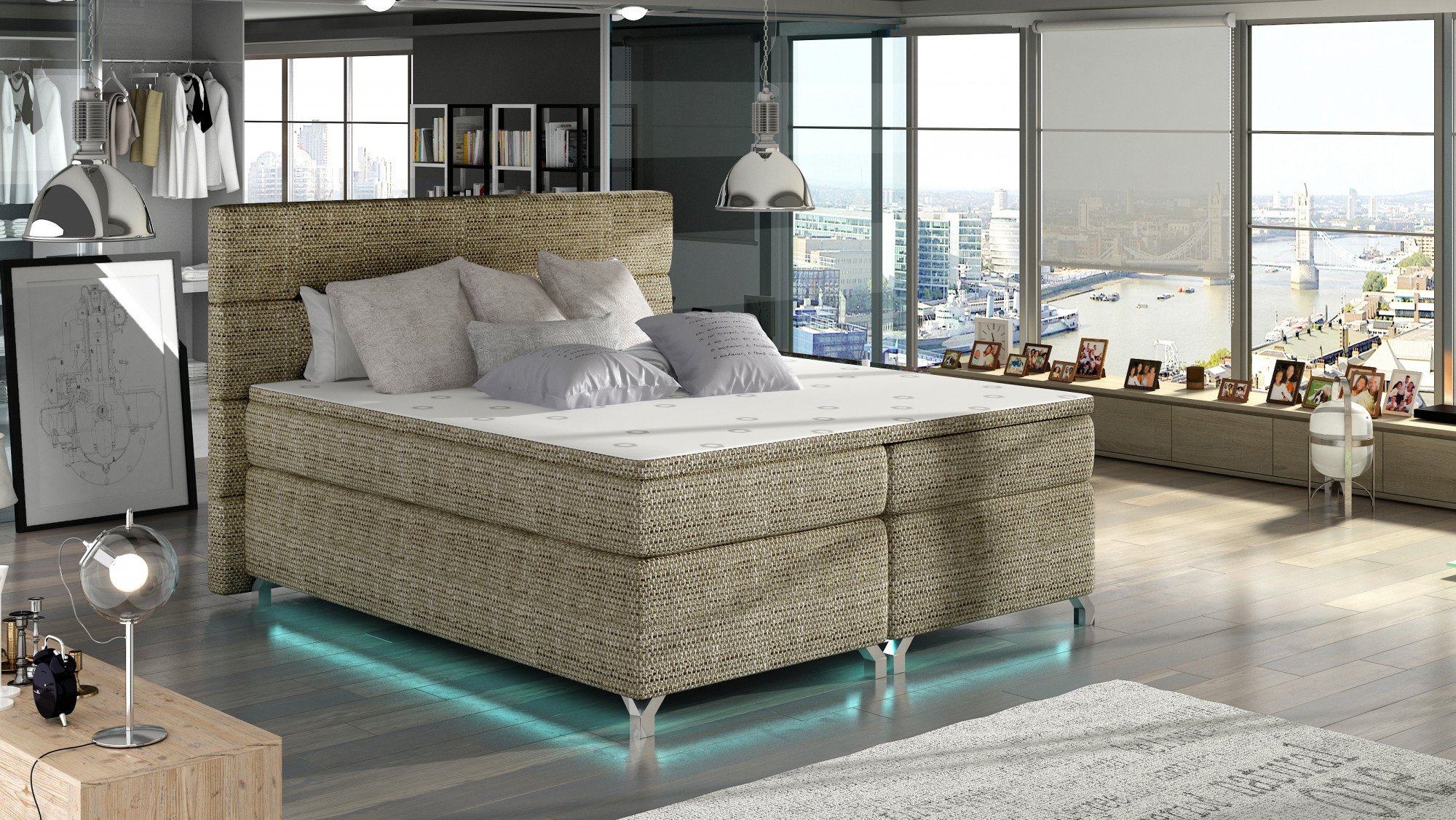 Amadeo je mimořádně pohodlná, robustní a originálně navržená boxspringová postel, která zaujme svým neobvyklým tvarem a dalšími ozdobami. Je k dispozici ve třech variantách 140/160/180 x 200 cm, takže jej můžete velmi snadno přizpůsobit metrické velikosti vašeho bytu. Mezi jeho vlastnosti patří: vysoká matrace, stylové čelo postele vybavené dodatečnou pěnou T21, prostorný úložný prostor na ložní prádlo, kovové chromované nohy a elegantní čalounění odolné proti oděru a nečistotám, které je k dispozici v mnoha barvách z kolekce Eltap. Nejoriginálnějším dekorativním prvkem našeho nábytku je možnost vybavit jej LED osvětlením. Matrace je vyrobena z bonelu a má dvě další vrstvy pěny T25 umístěné na horní a spodní straně matrace. Výplň postele byla také zesílena 4 cm silnou pěnovou vrstvou T21. Toto řešení to činí co nejpohodlnějším. Stojí za to mít takový funkční kus nábytku ve vašem bytě.