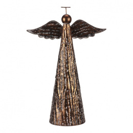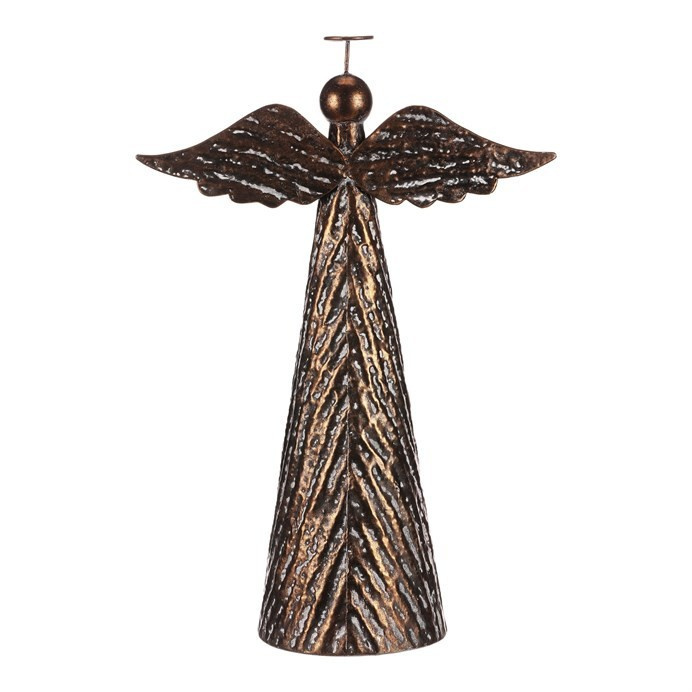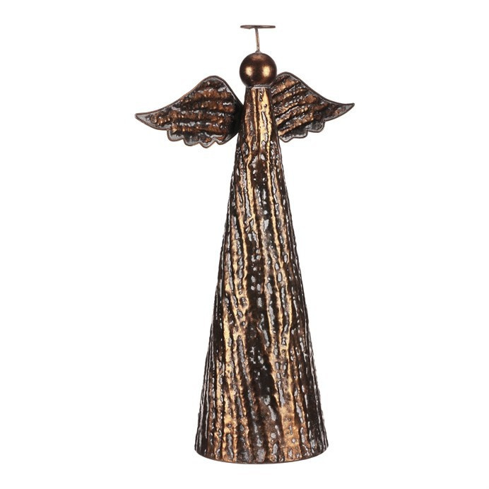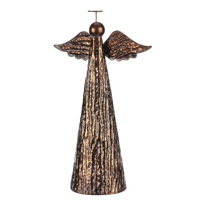Vyzdobte si váš oblíbení prostor originální ozdobou v podobě elegantního kovového anděla na postavení extra velkých rozměrů. Jeho hrubý, metalický a zároveň lesklý povrch, odráží dokonale paprsky světla a tím vám vznikne nádherný světelný efekt, zejména při zapálení svíček. Svou měděnou barvou se nejlépe hodí pro Vánoční období, kdy perfektně zapadne do sváteční výzdoby. Anděla tak jednoduše umístěte na poličku, stůl, komodu, okenní parapet a další viditelná místa, odkud vám bude přinášet potěšení a zároveň pocit ochrany a bezpečí domova.