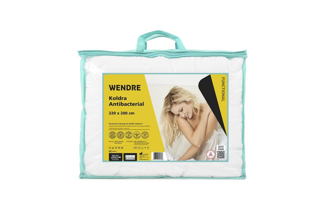 Wendre Antibakteriální přikrývka 220x200 Používáte mýdlo, sprchový gel, myjete nádobí kvalitní tekutinou? Přikrývka a polštář by také měly být ANTIBAKTERIÁLNÍ.Zbavte se nežádoucích mikrobů z lůžkovin. ANTIBACT™ je speciálně vyvinuté vlákno s antimikrobiálním účinkem. Povlak na přikrývku a polštář minimalizuje množení roztočů a jejich alergenů. Vysokou kvalitu výrobků potvrdil Hohensteinův institut. Nejdůležitější však je, že ANTIBAKTERIÁLNÍ produkty se svými zdravotními výhodami jsou prostě pohodlné. Zdravotnický prostředek. Plášť - 100% polyester (mikrovlákno), 82 g/m² Náplň - 100% ANTIBACT™* Balení - PEVA sáček se zipem a uchem + vložka + návod Praní - 60 stupňů