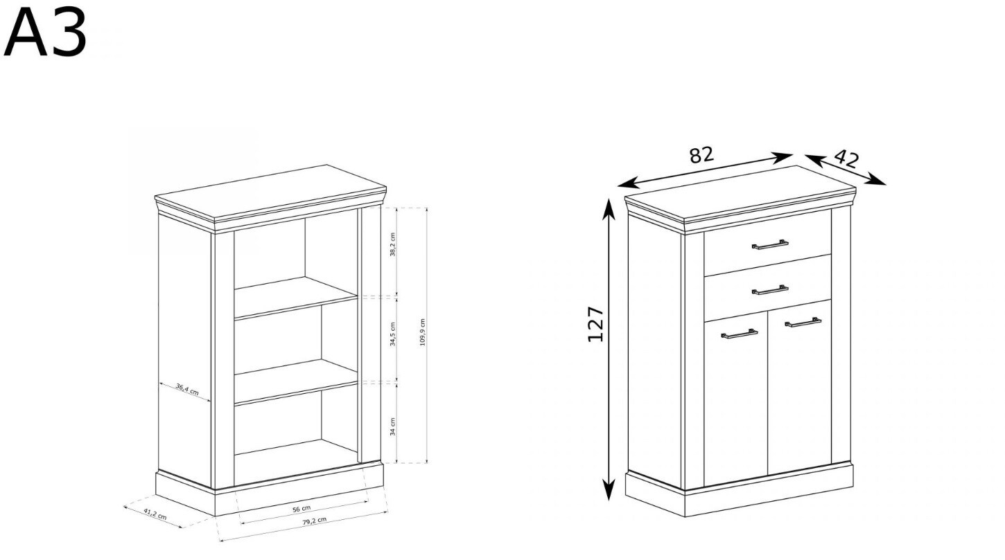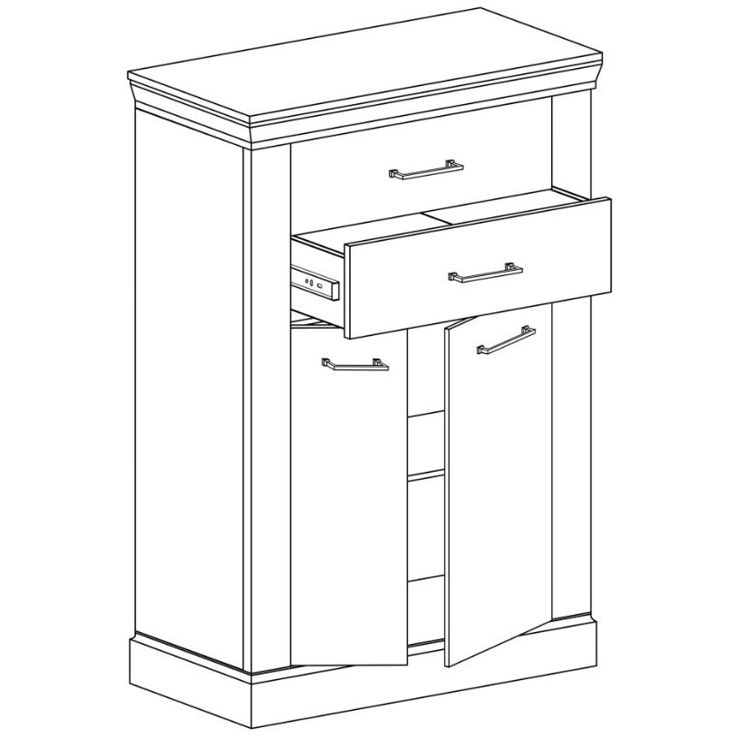 Úzká komoda, která dokonale vyplní interiér ložnice, obývacího pokoje nebo pokoje pro hosty. Skříňka je vybavena 2 zásuvkami, které jsou ideální pro uložení dokumentů, doplňků nebo oblečení. Spodní prostor skříněk je rozdělen 2 policemi, což vám umožní dobře uspořádat vaše věci. Kovové úchytky dokonale ladí se vzhledem nábytku. Celá skříň je vybavena systémem tichého dovírání, díky němuž je nábytek šetrný. K dostání ve dvou barevných provedeních.