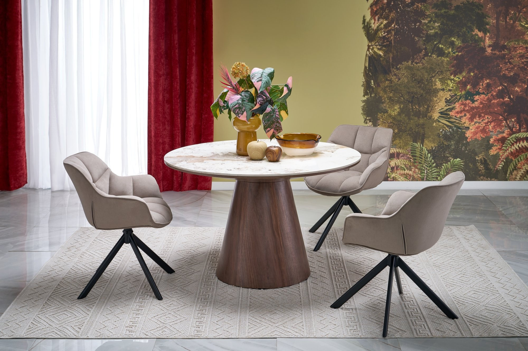 rozměry: 120/76 cm, materiál: slinutý materiál / MDF + přírodní dýha, barva: deska - béžový mramor, noha - ořech