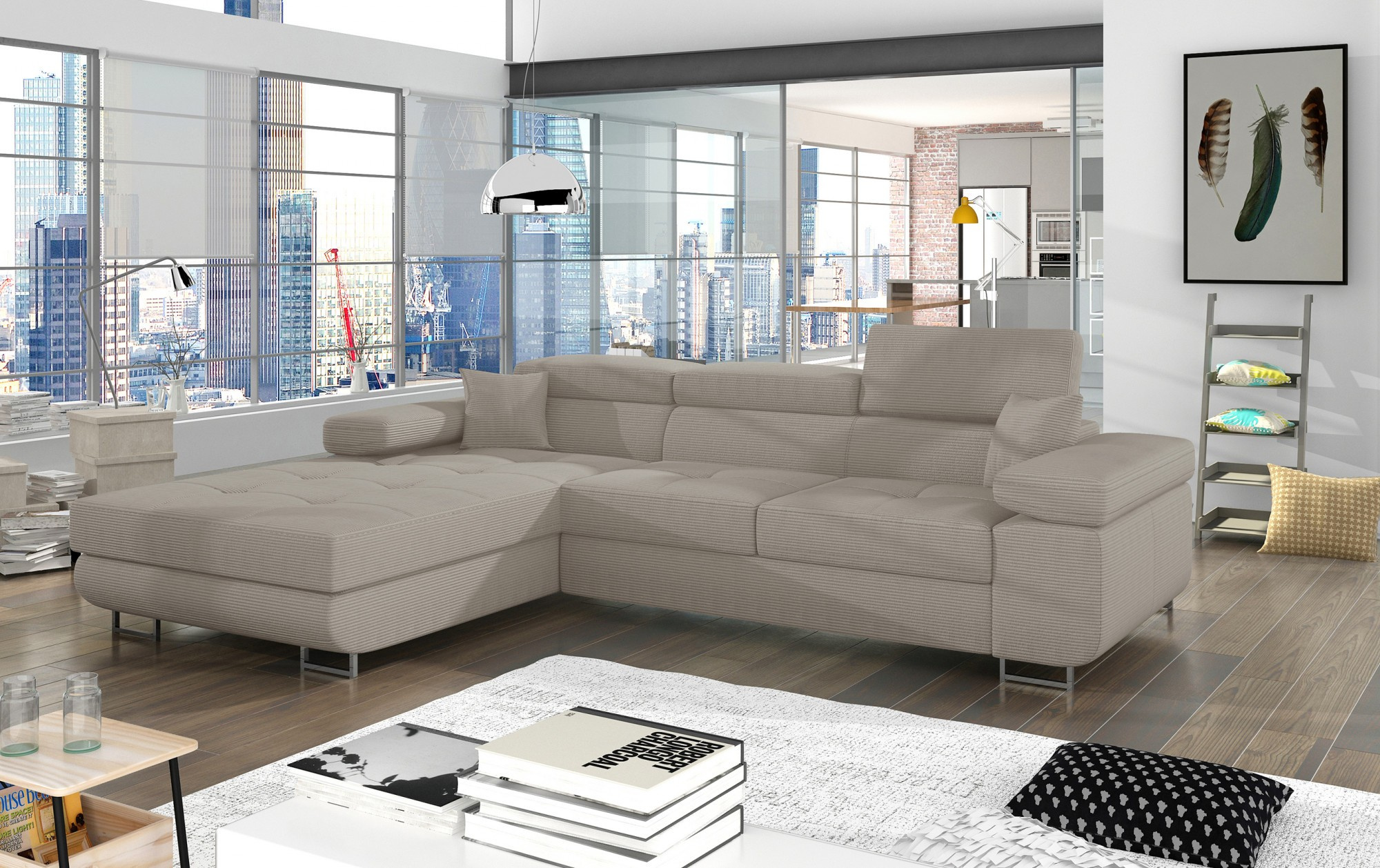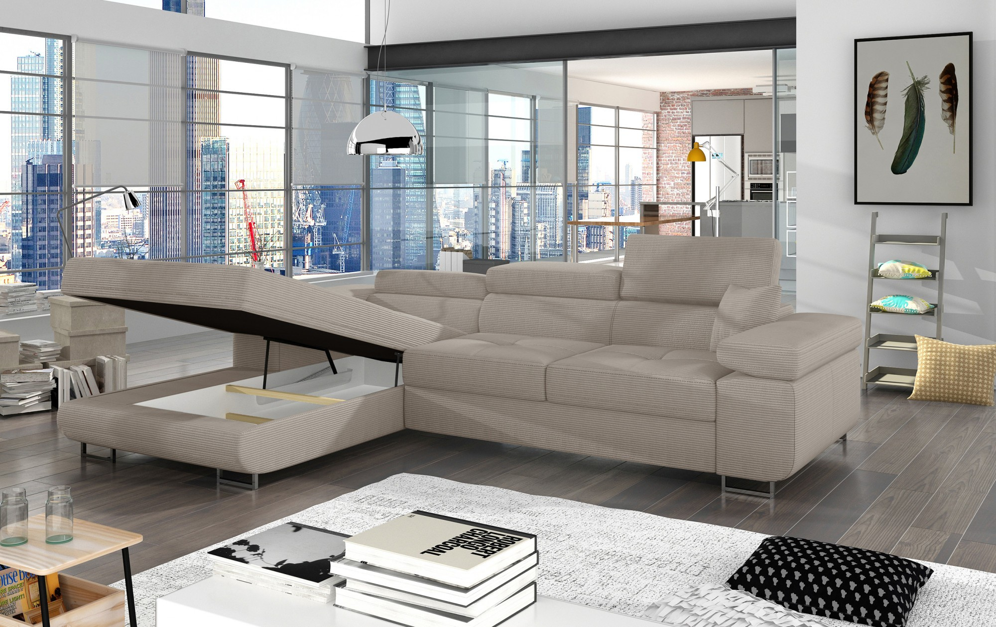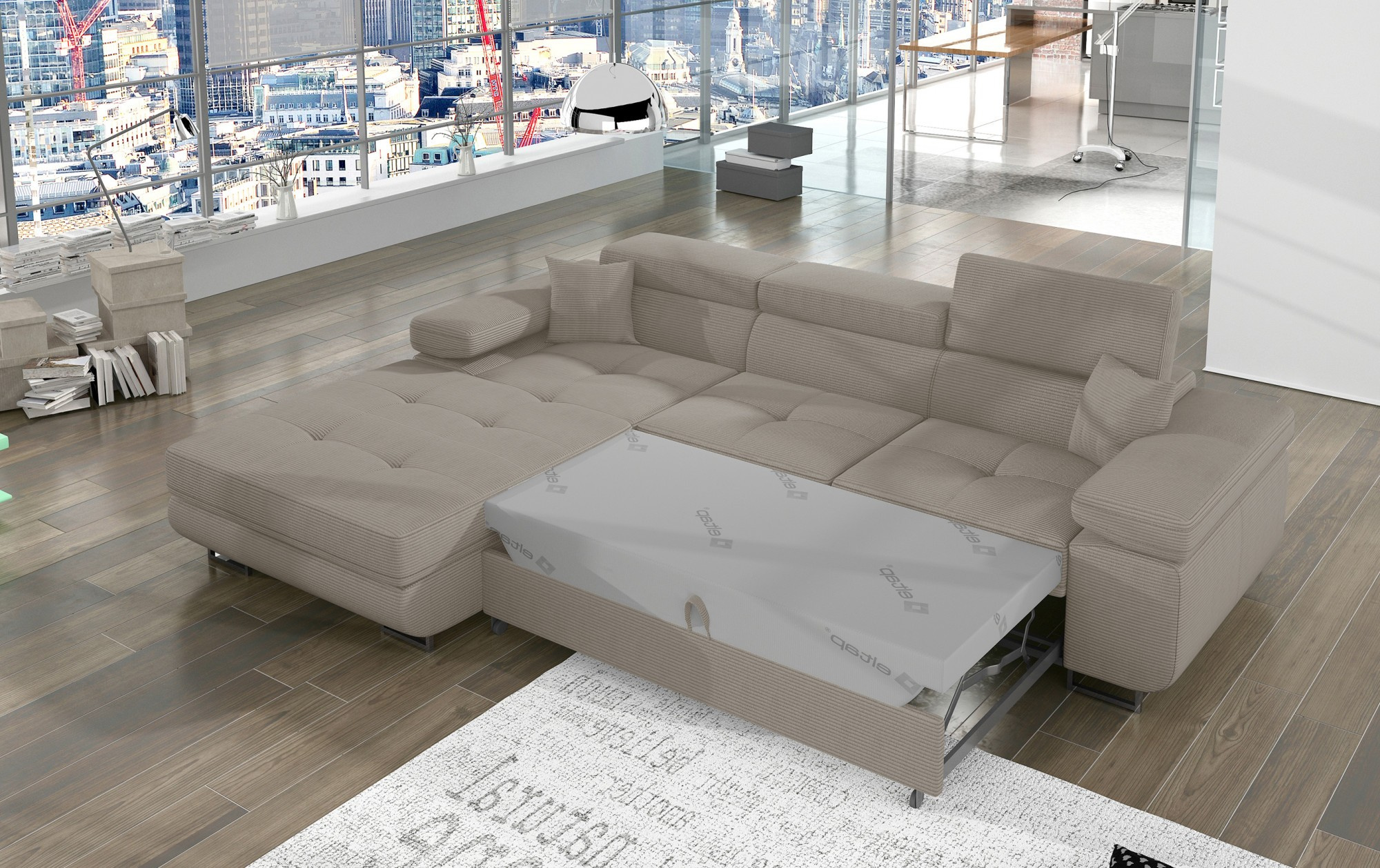 Armando je stylová, funkční a především elegantní rohová rozkládací pohovka pro náročné znalce pohodlí. Vysoký komfort odpočinku je zvýšen širokými opěrkami rukou, dobře tvarovaným opěradlem a nastavitelnými, vysokými opěrkami hlavy. Sedák prostorné rohové jednotky s rozměry 280 x 205 x 90 cm je vyroben z pěny T30, která zajišťuje maximální pohodlí a pružnost. Rohová sedací souprava ve tvaru L je vybavena funkcí spaní s plochou 125 x 198 cm. Kromě toho má také velký úložný prostor na ložní prádlo. Díky jemným detailům prošívání, elegantním stehům a vysokým chromovým nohám je rohová jednotka udržována v moderním stylu dokončení. Armando je k dispozici v mnoha barvách. Stojí za to mít takový kus nábytku ve svém domově.