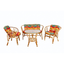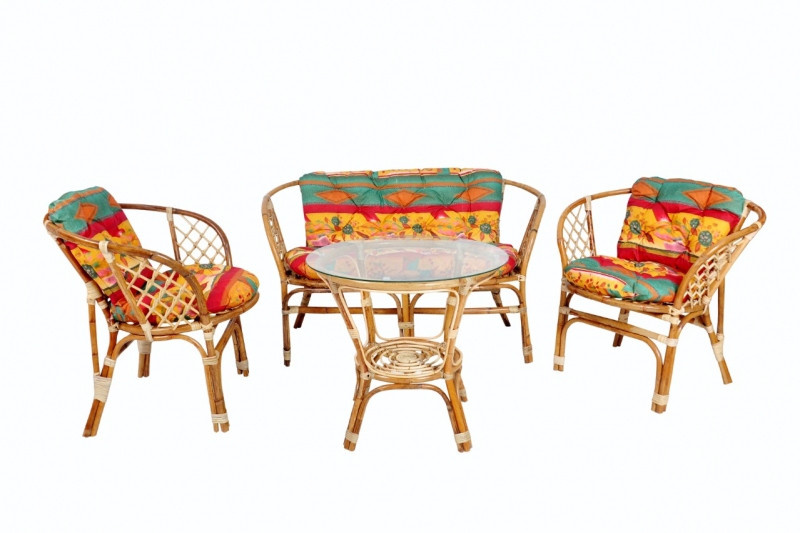 Ratanový nábytek - ratanová sedací souprava Bahama je vyrobena z přírodního ratanu semambo. Souprava obsahuje pohovku, 2 křesla, stolek se sklem a kompletní sadu polstrů. | Barva ratanové konstrukce i ratanového výpletu je přírodní. Velikost pohovky je 115x66x72 cm, nosnost pohovky je 150 kg. Velikost křesla je 66x68x72 cm, nosnost křesla je 110 kg. Výška sedu je 44 cm. Stolek má výšku 55 cm, průměr stolku je 60 cm.