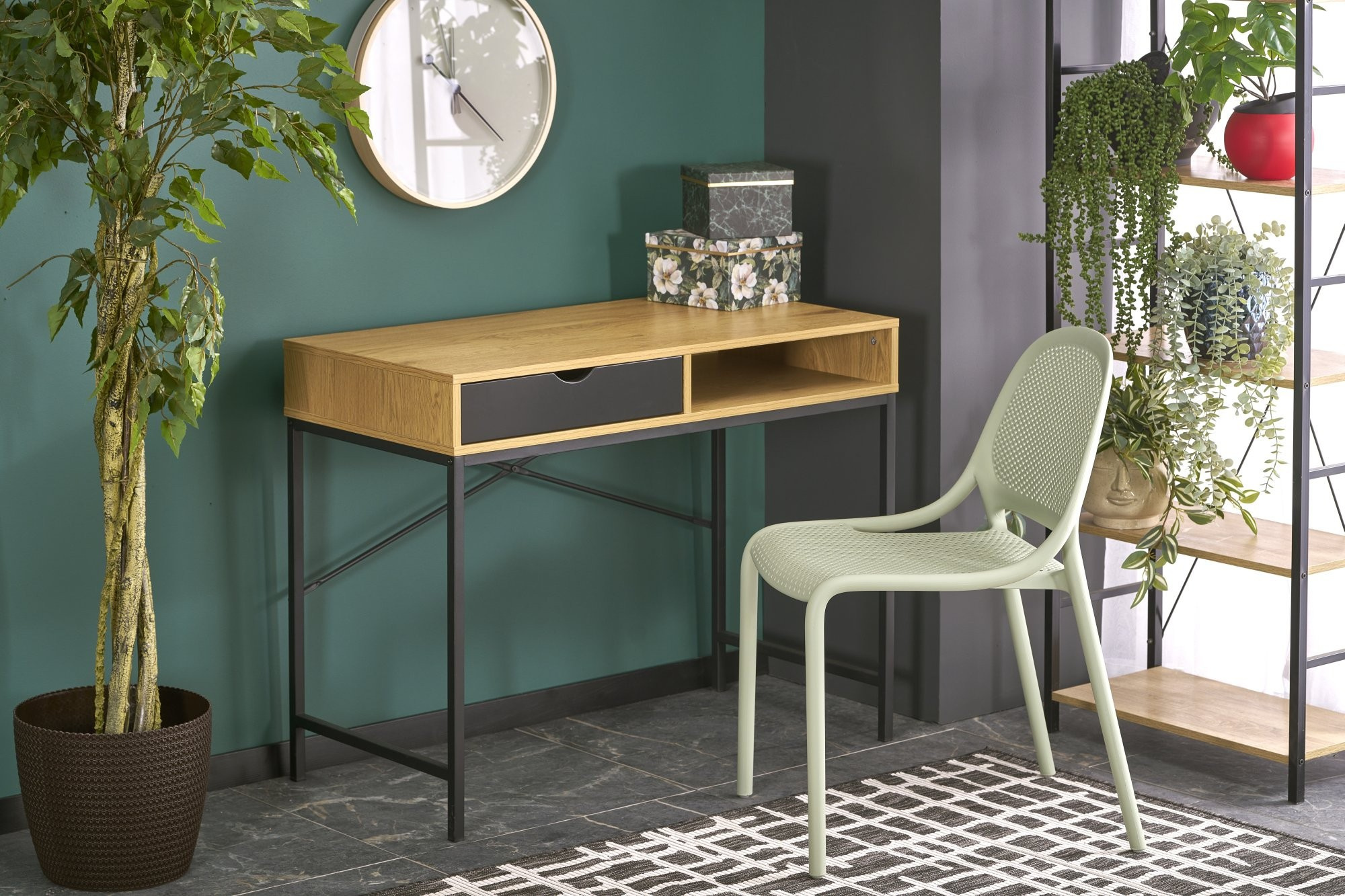Psací stůl B50 vyniká svým moderním designem, který kombinuje přírodní dřevo a černý kov. Tato kombinace materiálů dodává stolu nejen estetický vzhled, ale také zajišťuje jeho pevnost a stabilitu. Přírodní dřevo přináší do vašeho interiéru teplo a útulnost, zatímco černé kovové prvky dodávají stolu moderní a industriální nádech.
