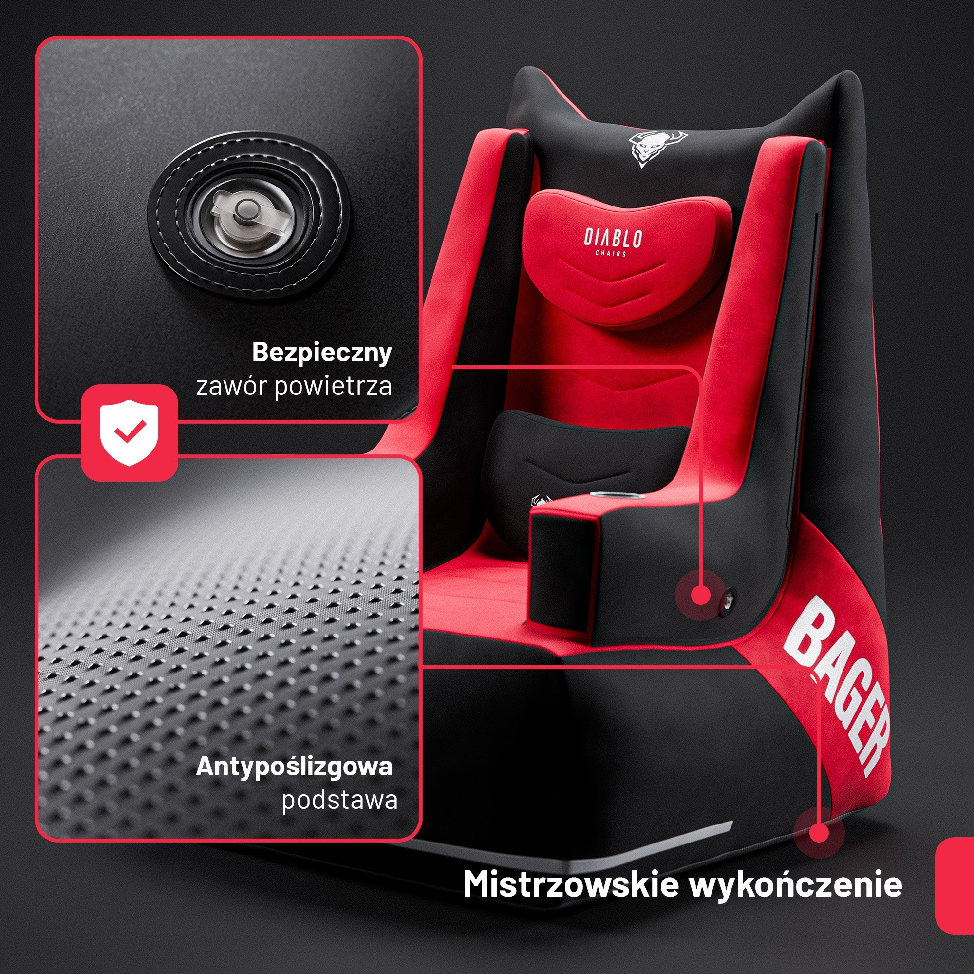 Černo-červené herní křeslo BAGER není jen módní záležitost, je to mimořádně odolný a pevný upgrade pohodlí pro každého hráče na dlouhá léta. Tři nezávislé vzduchové komory, potažené tkaninou s vysokou gramáží, zajišťují jeho mimořádnou odolnost. Na spodní straně BAGERu najdete protiskluzový materiál, který zajistí vaši bezpečnost i během těch nejenergičtějších herních seancí.