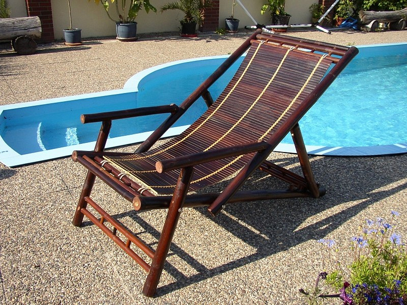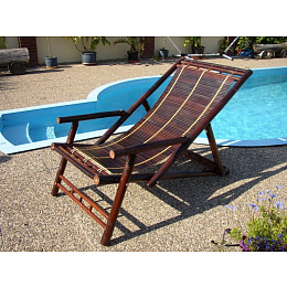 Bambusový nábytek -polohovací bambusové lehátko vyrobené z přírodního bambusu, barva hnědá dle obrázku | Rozměr lehátka je 62x132x90 cm, nosnost 120 kg, 3 polohy sklopení Na lehátku jsou vzhledové vady typu podélných prasklin na bambusu nebo vady na barvě.