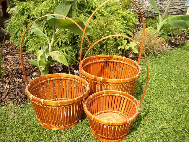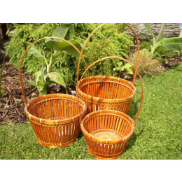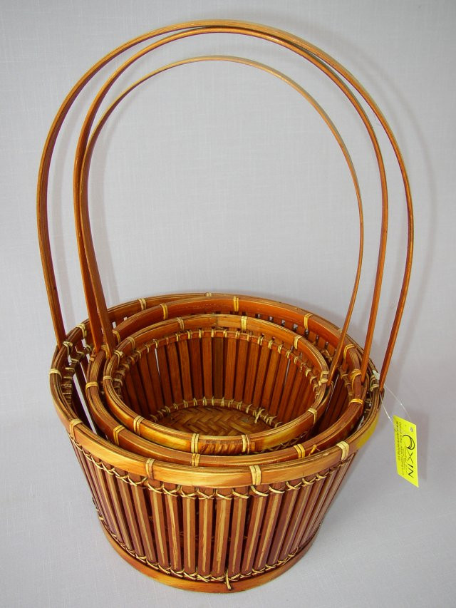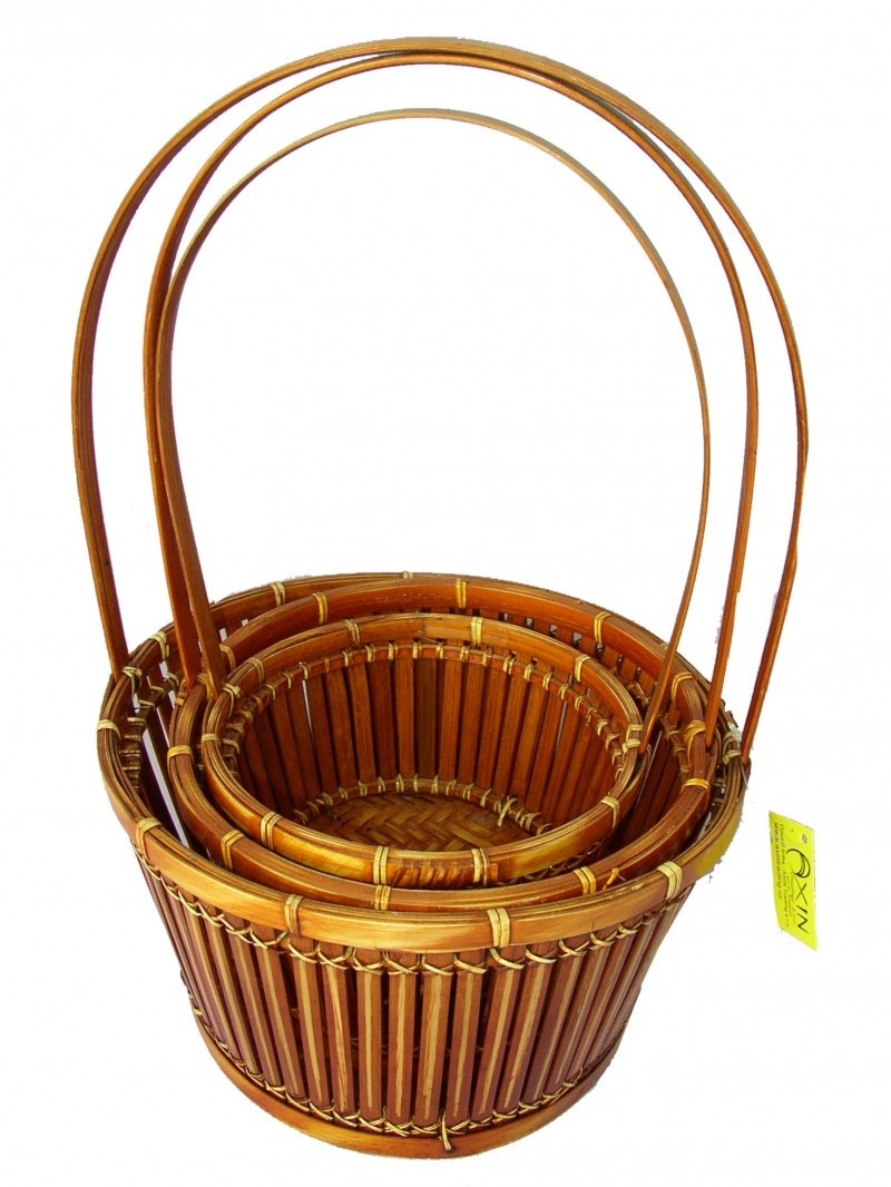 Bambusové košíky jsou vhodné jak pro různou dekoraci, tak je lze použít i jako obal na květinu. | Velikost košíků: Velký košík: průměr v dolní části uvnitř je 19 cm, průměr v horní části uvnitř je 22 cm, hloubka košíku uvnitř je 12,5 cm, celková výška s uchem je 41 cm Střední košík: průměr v dolní části uvnitř je 16 cm, průměr v horní části uvnitř je 18 cm, hloubka košíku uvnitř je 11 cm, celková výška s uchem je 35 cm Malý košík: průměr v dolní části uvnitř je 13 cm, průměr v horní části uvnitř je 15 cm, hloubka košíku uvnitř je 9 cm, celková výška s uchem je 33 cm