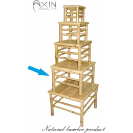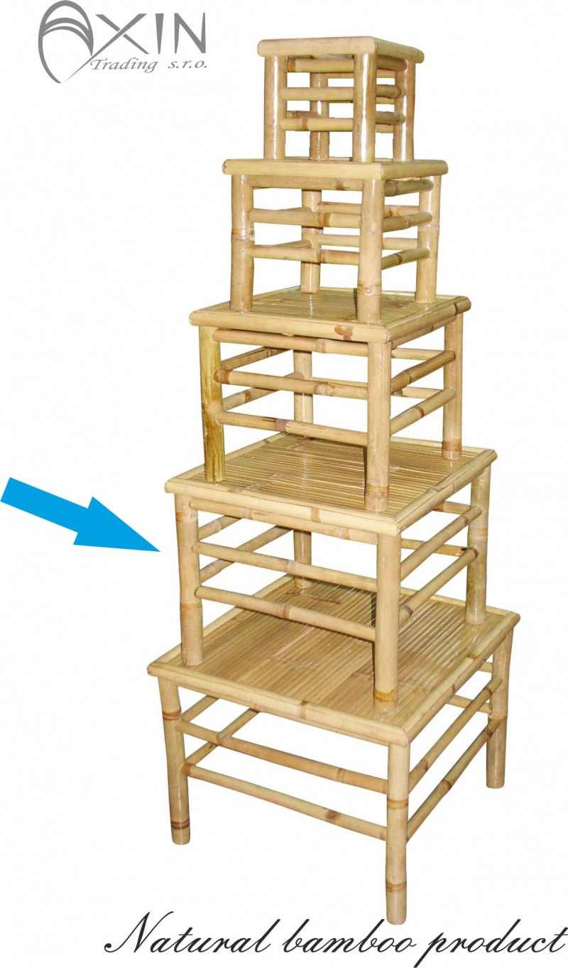 Stolek vyrobený z přírodního bambusu. | Pro výrobu tohoto bambusového nábytku je použit druh bambusu s minimální vnitřní dutinou, který roste v jižní oblasti Vietnamu. Díky tomu je bambusový nábytek velice pevný a nepraská. Ilustrační fotografie detailu použitého bambusu je na druhé a třetí fotografii výrobku. Velikost stolku je 47x47x37 cm - druhý největší ze setu, na obrázku označeno šipkou.