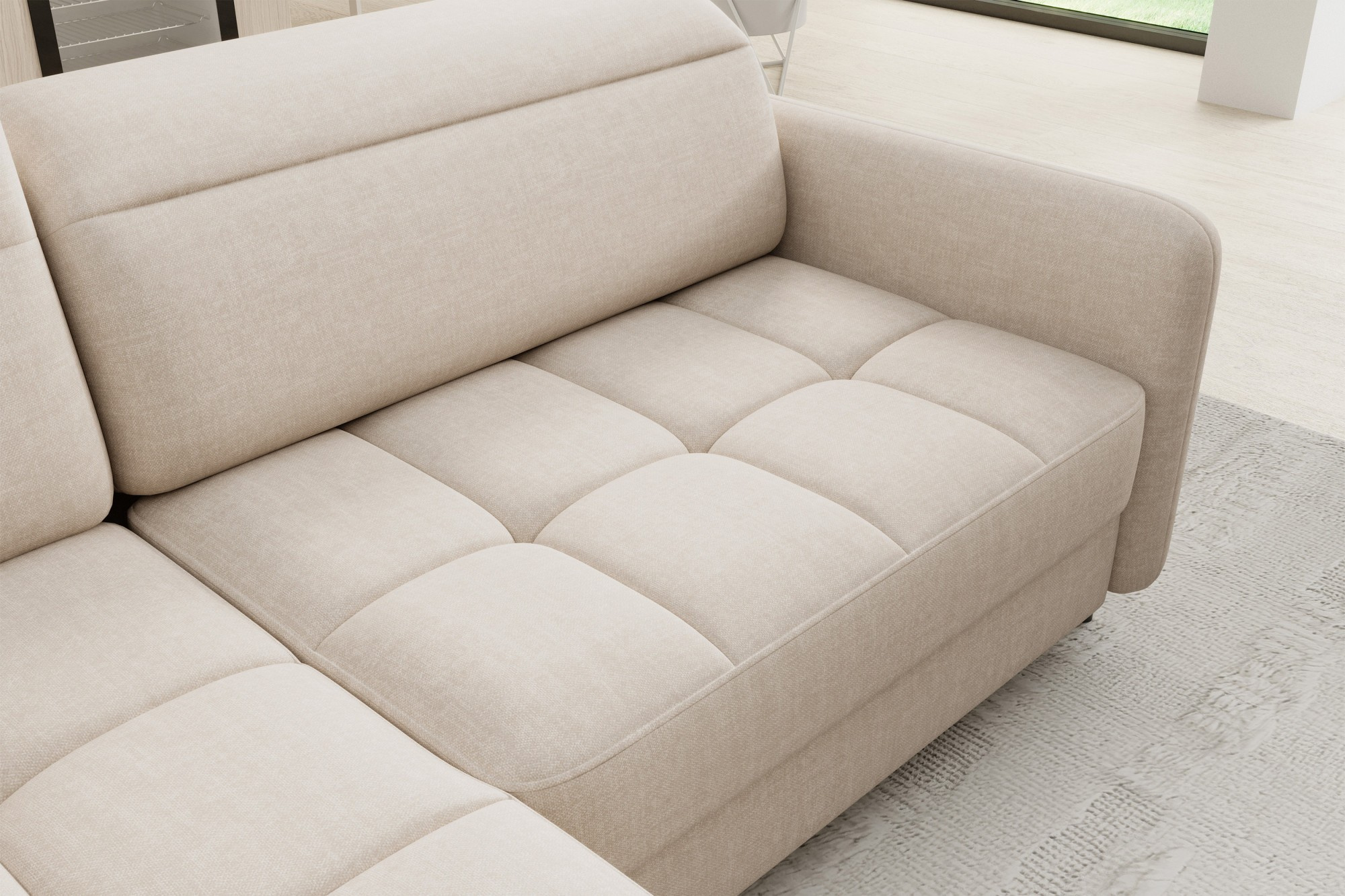 Jednou z hlavních předností této sedací soupravy je její praktická funkčnost. Disponuje úložným prostorem, který je ideální pro uschování dek, polštářů nebo dalších nezbytností, které chcete mít vždy po ruce, ale zároveň je mít úhledně uklizené. Navíc je souprava vybavena rozkládacím mechanismem, který snadno promění pohovku na pohodlné lůžko s plochou na spaní 160 x 128 cm. Tato funkce je perfektní pro hosty, kteří u vás zůstanou přes noc.