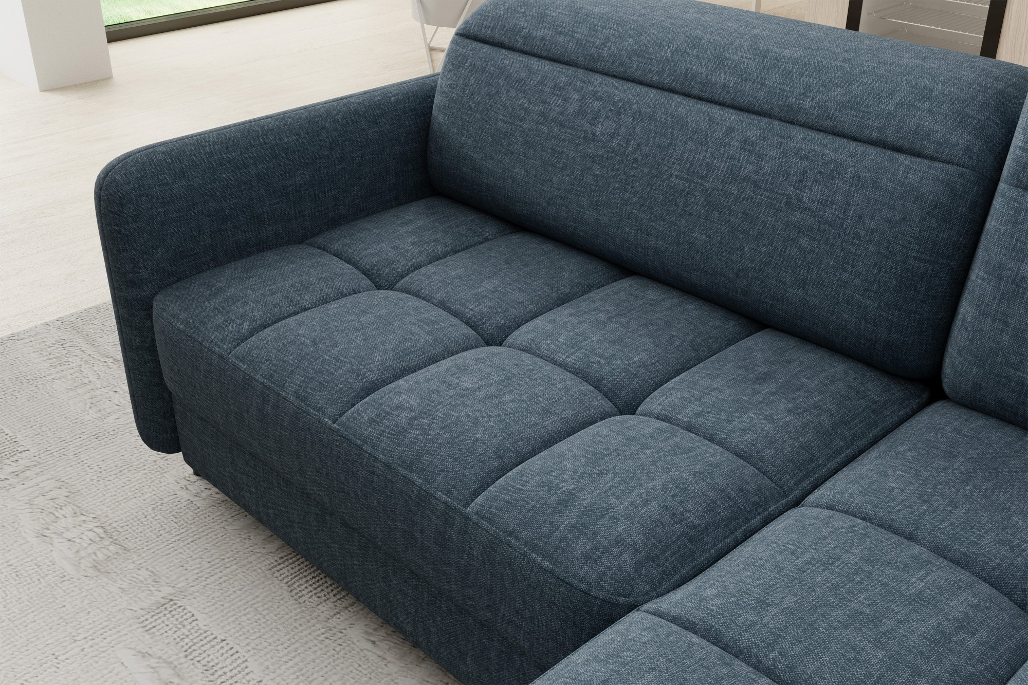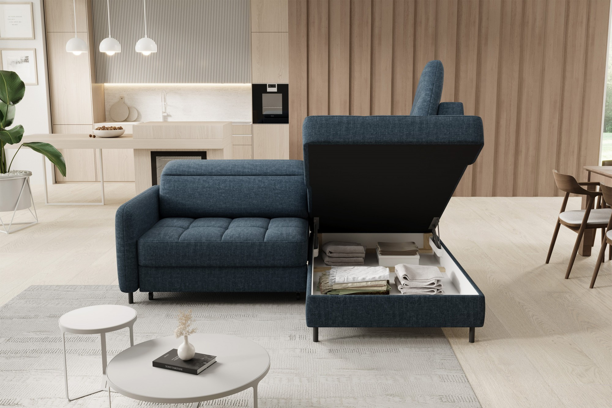 Jednou z hlavních předností této sedací soupravy je její praktická funkčnost. Disponuje úložným prostorem, který je ideální pro uschování dek, polštářů nebo dalších nezbytností, které chcete mít vždy po ruce, ale zároveň je mít úhledně uklizené. Navíc je souprava vybavena rozkládacím mechanismem, který snadno promění pohovku na pohodlné lůžko s plochou na spaní 160 x 128 cm. Tato funkce je perfektní pro hosty, kteří u vás zůstanou přes noc.