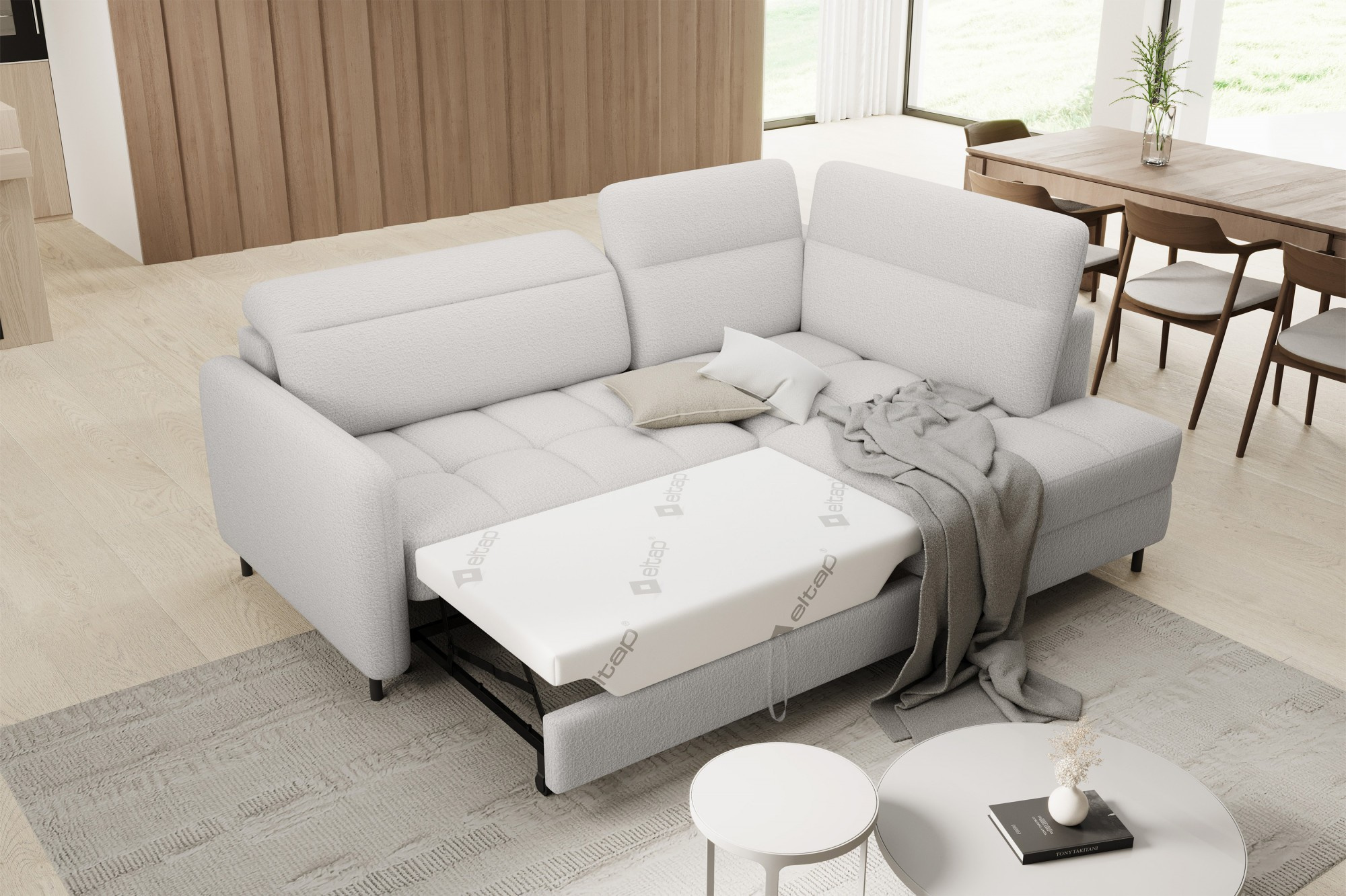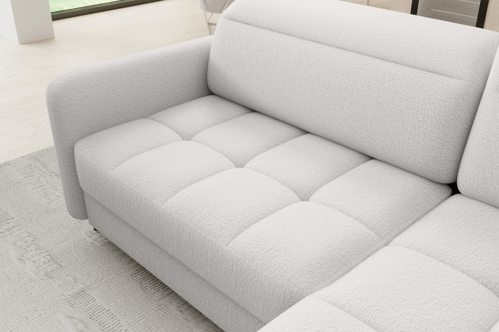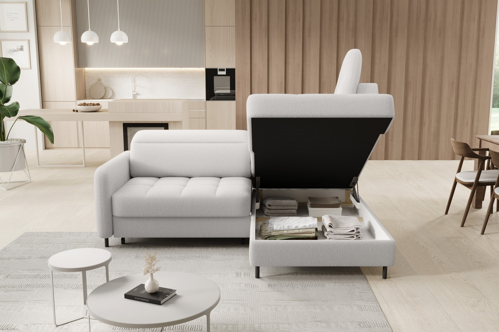 Jednou z hlavních předností této sedací soupravy je její praktická funkčnost. Disponuje úložným prostorem, který je ideální pro uschování dek, polštářů nebo dalších nezbytností, které chcete mít vždy po ruce, ale zároveň je mít úhledně uklizené. Navíc je souprava vybavena rozkládacím mechanismem, který snadno promění pohovku na pohodlné lůžko s plochou na spaní 160 x 128 cm. Tato funkce je perfektní pro hosty, kteří u vás zůstanou přes noc.
