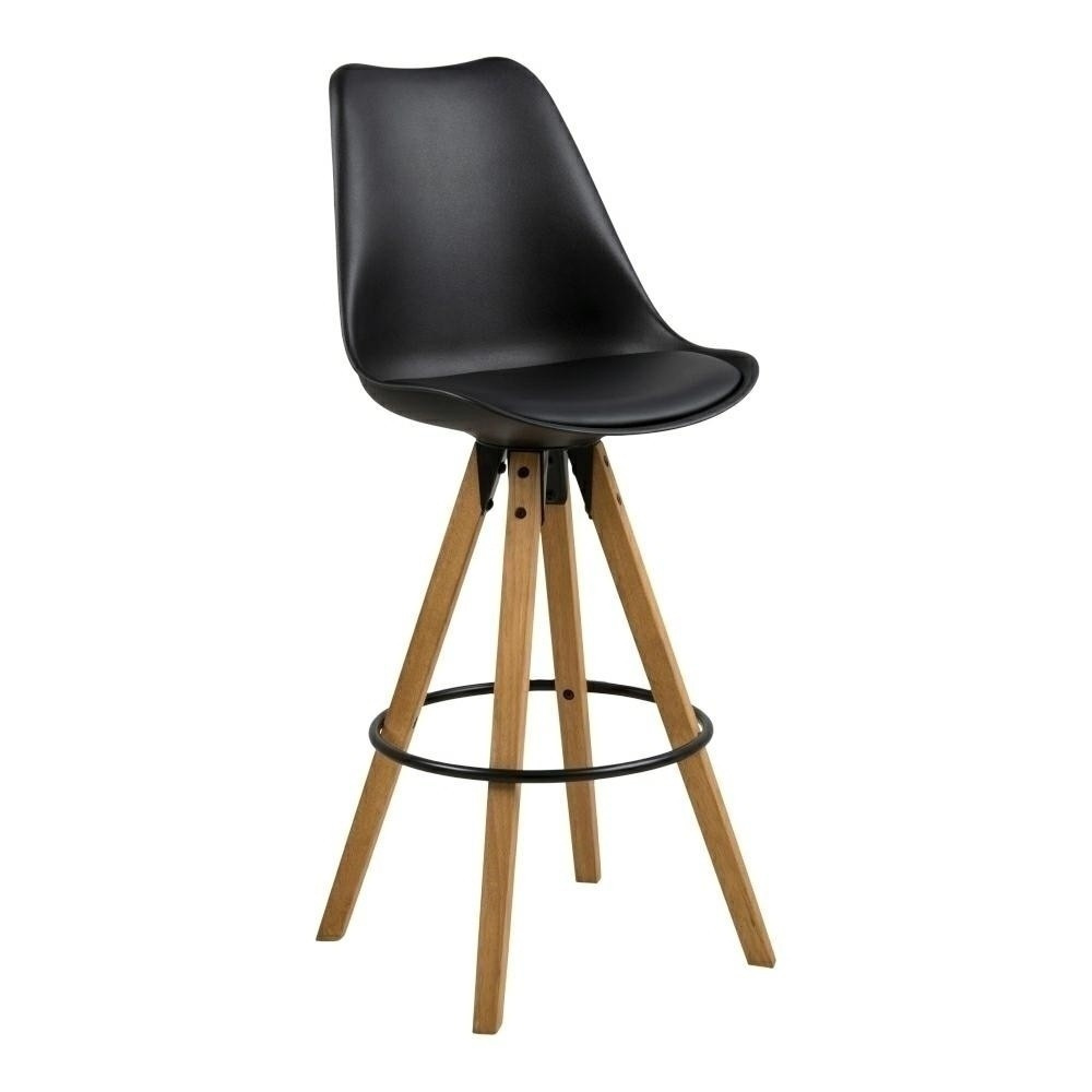 Praktická a pohodlná barová stolička Dima. Pohodlná stolička v tlumené barevnosti a moderním stylu má sedák potažený černou eko kůží a dřevěnou základnu. Sedák je vymodelován spolu s opěradlem jako jeden celek, s dodatečným polštářem rovněž potaženým eko kůží v černé barvě. Základna ve formě čtyřnožky je vyrobena z lišt z kaučukového dřeva, mořeného na barvu dubu a ošetřeného olejem. Na spodní části nohou stoličky je černá kovová lišta, která slouží jako opěrka pro nohy. Celý kus bude vypadat skvěle v hospodě nebo jako sedátko u kuchyňského ostrůvku. Hmotnost: 7,75 kg. Rozměry kartonu: 74 cm x 37 cm x 56 cm Výška sedadla: 75 cm Šířka sedadla: 48,5 cm Hloubka sedadla: 40 cm