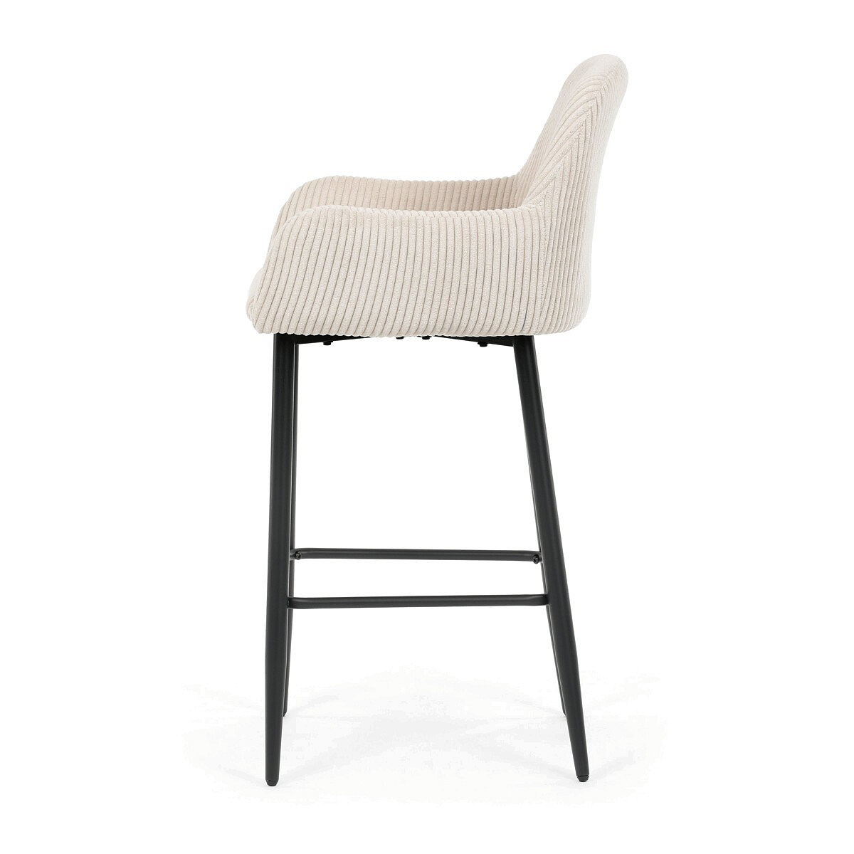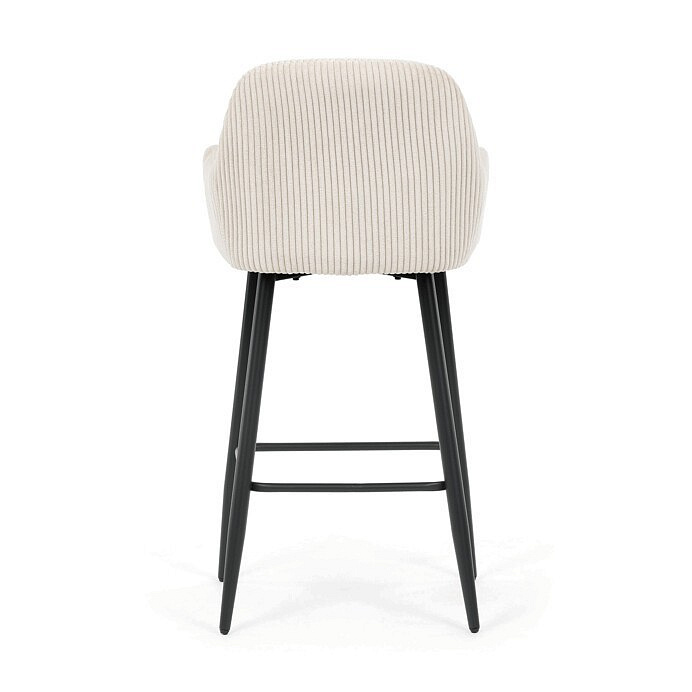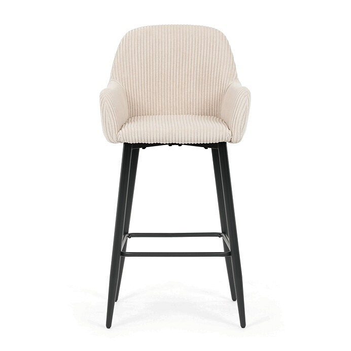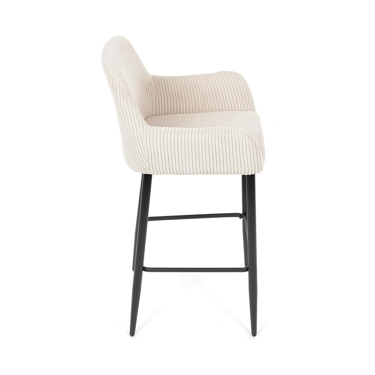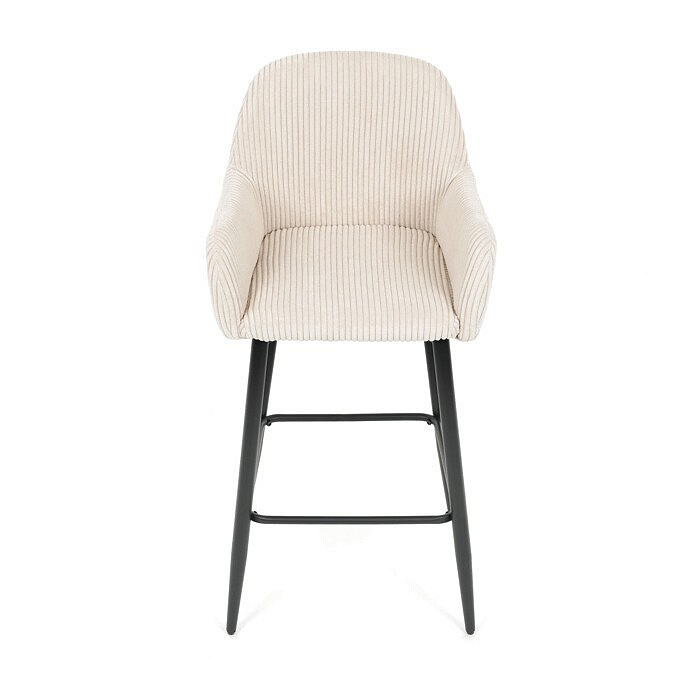 Barová židle s područkami v béžovém manšestrovém potahu kombinuje pohodlí a moderní design. Sedák i opěradlo jsou čalouněné příjemnou manšestrovou látkou, která nabízí měkký povrch s jemnou texturou a snadnou údržbu. Pevné kovové nohy v černém matném provedení zajišťují stabilitu a dlouhou životnost, přičemž spodní příčná výztuha slouží zároveň jako praktická opěrka nohou. Židle není otočná, což podtrhuje její jednoduchý a elegantní tvar vhodný pro bary, kuchyňské ostrůvky či vysoké stoly. Díky ergonomicky tvarovaným područkám poskytuje dostatečnou oporu pro ruce a přispívá k pohodlnému posezení.