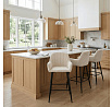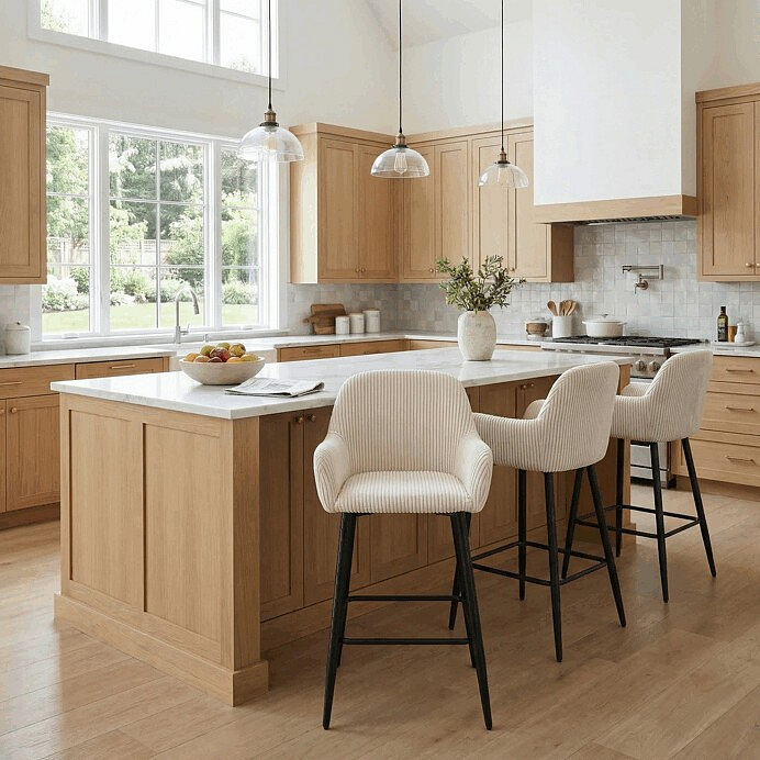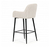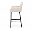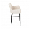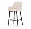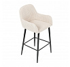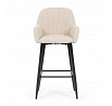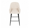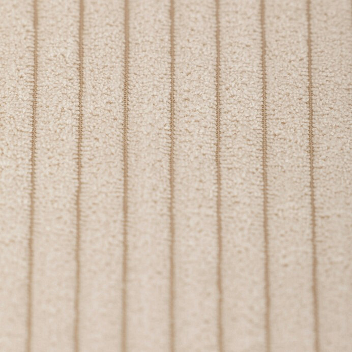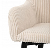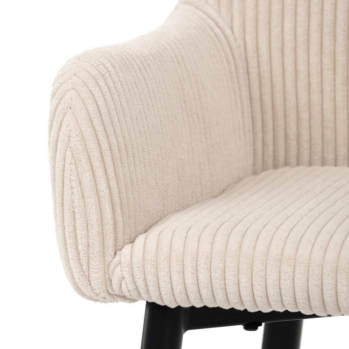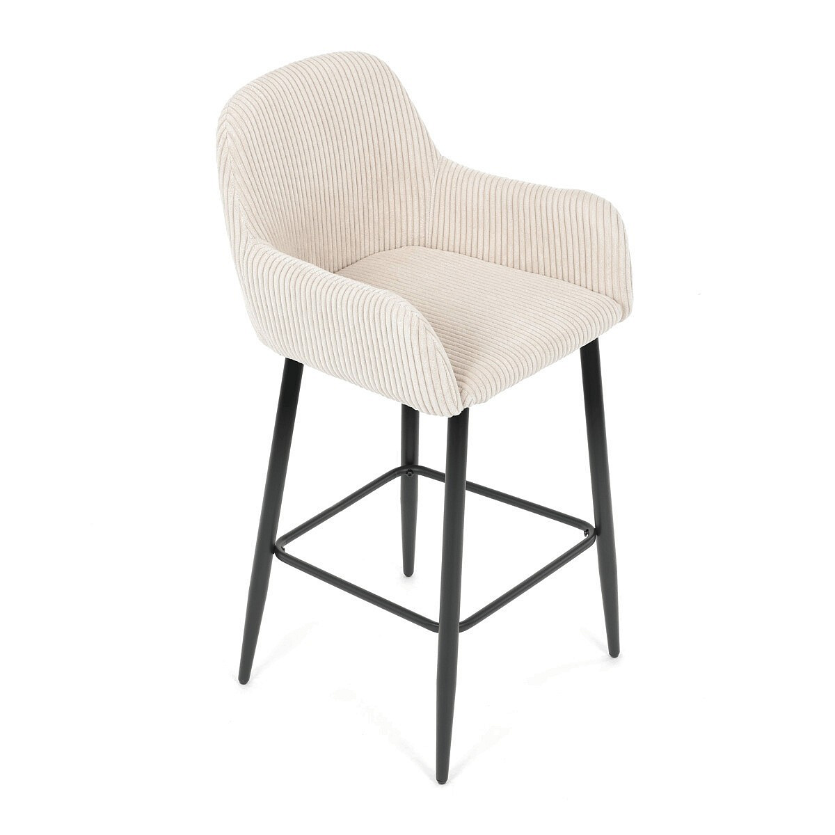 Barová židle s područkami v béžovém manšestrovém potahu kombinuje pohodlí a moderní design. Sedák i opěradlo jsou čalouněné příjemnou manšestrovou látkou, která nabízí měkký povrch s jemnou texturou a snadnou údržbu. Pevné kovové nohy v černém matném provedení zajišťují stabilitu a dlouhou životnost, přičemž spodní příčná výztuha slouží zároveň jako praktická opěrka nohou. Židle není otočná, což podtrhuje její jednoduchý a elegantní tvar vhodný pro bary, kuchyňské ostrůvky či vysoké stoly. Díky ergonomicky tvarovaným područkám poskytuje dostatečnou oporu pro ruce a přispívá k pohodlnému posezení.