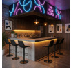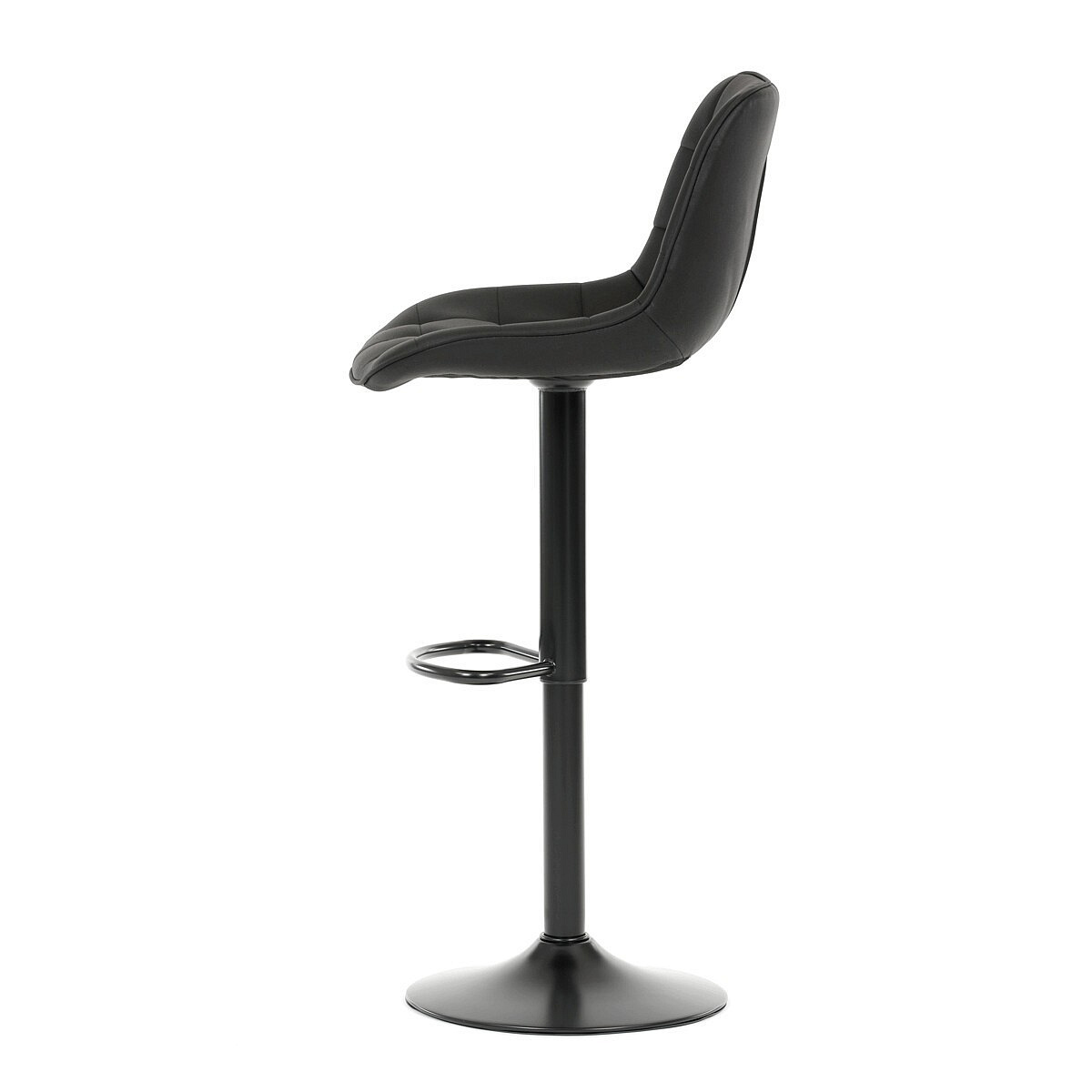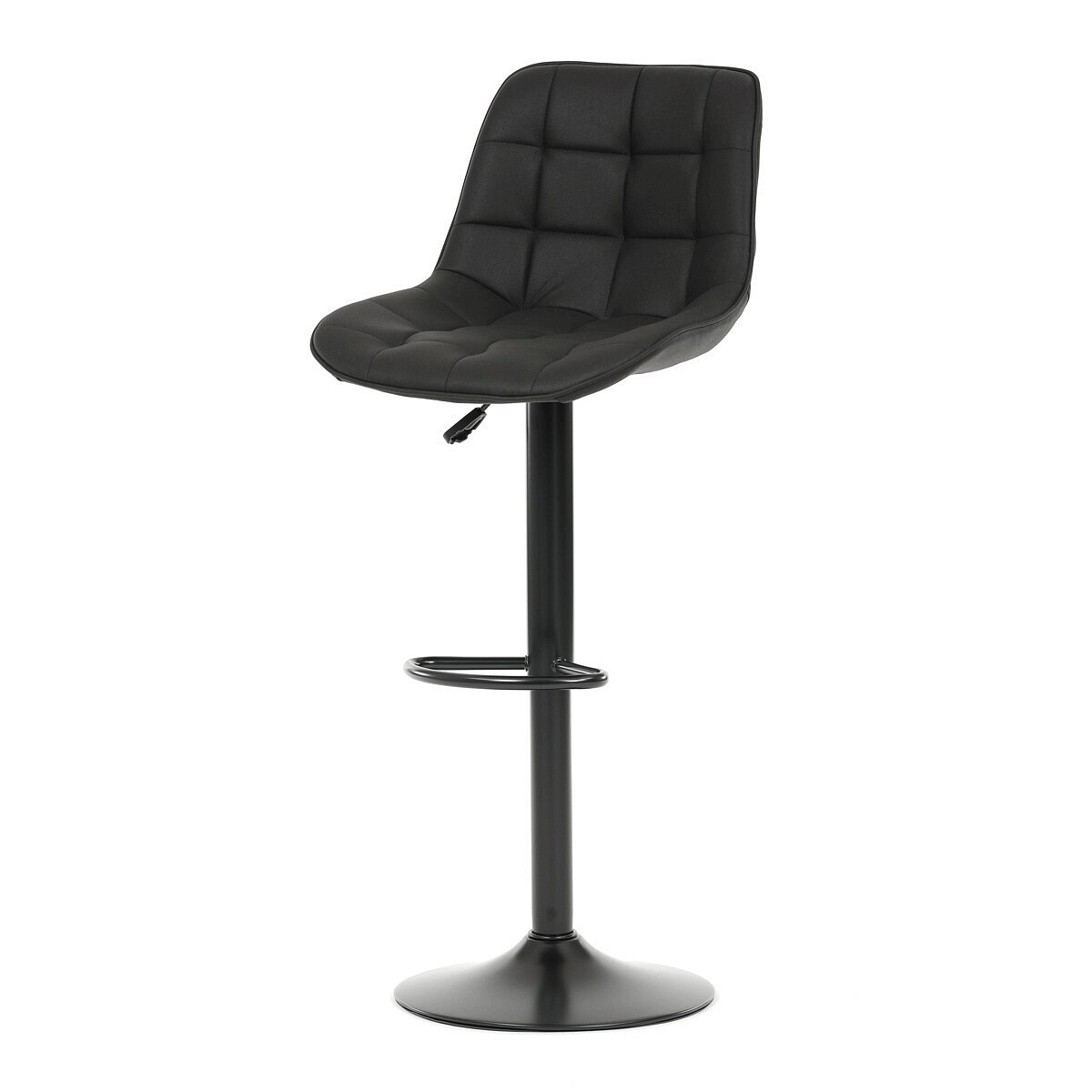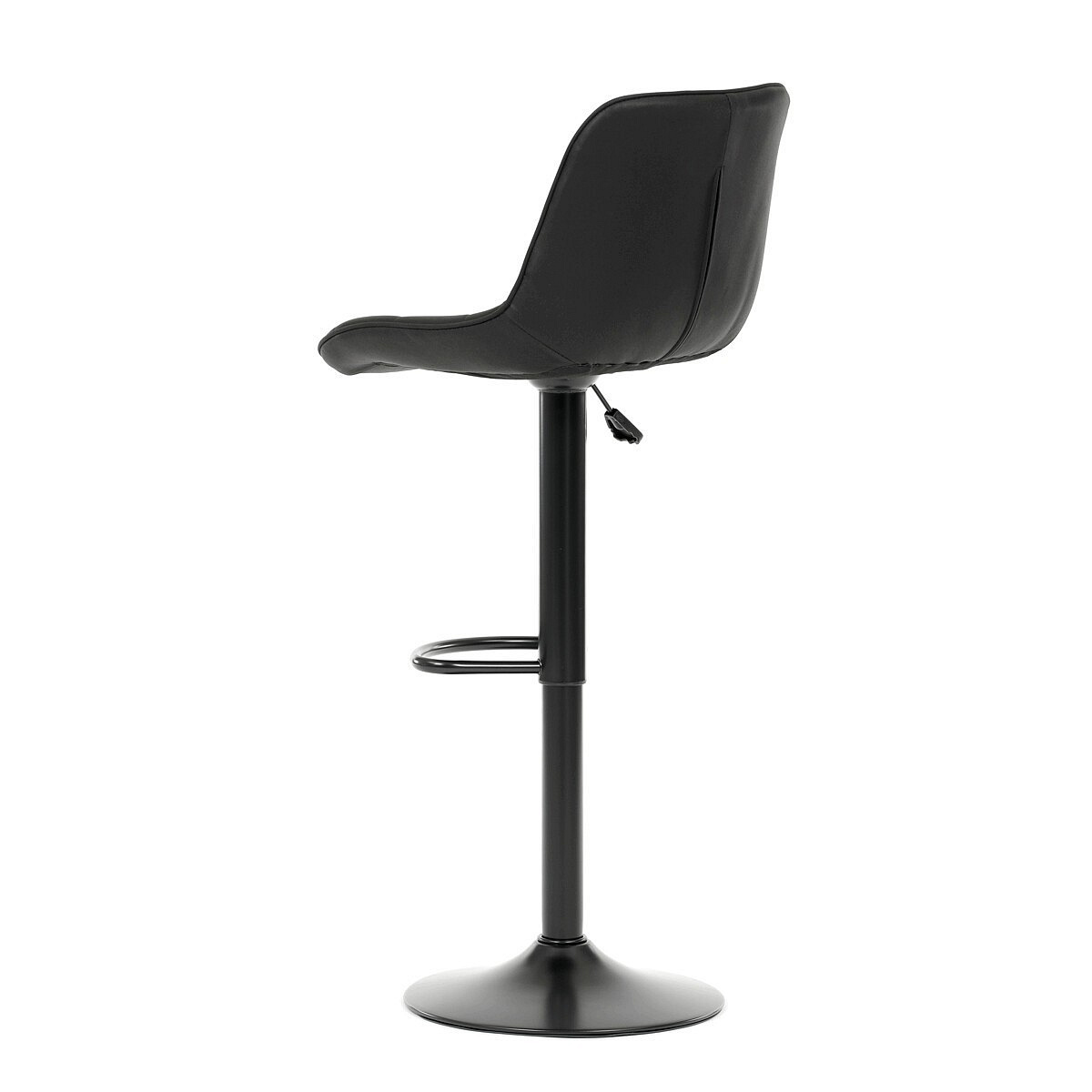 Barová židle AUB-V3066 BK3 kombinuje moderní design s praktickou funkčností. Sedák i opěradlo jsou potažené černou látkou v dekoru broušené kůže, která nabízí příjemný povrch a výrazné designové prošití dodává židli charakter. Výškově nastavitelný mechanismus umožňuje snadné přizpůsobení výšky sezení podle potřeby, zatímco otočná konstrukce zajišťuje pohodlný pohyb. Pevná kovová podnož v černém matném provedení je stabilní a doplněná o opěrku nohou pro zvýšení komfortu při delším sezení. Židle je vhodná do moderních interiérů, barů či kuchyňských koutů, kde oceníte kombinaci stylu a funkčnosti.