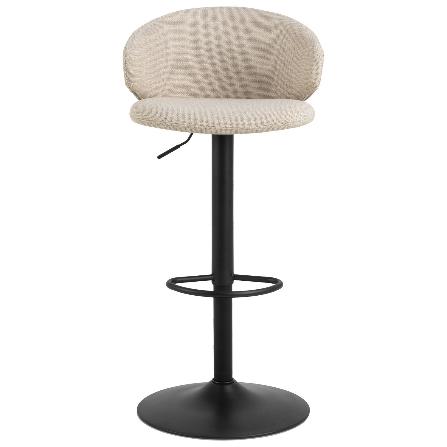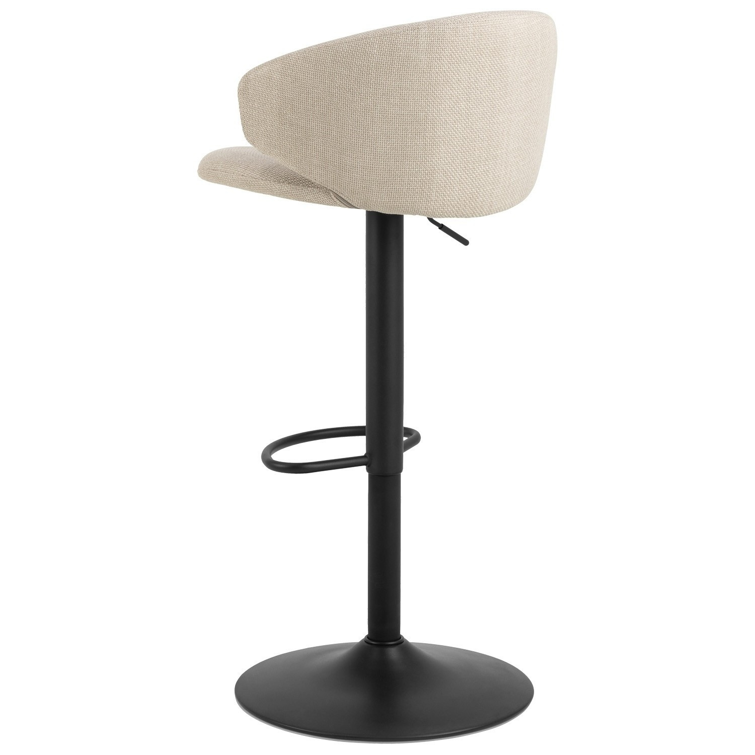 Díky krátkému, zakřivenému opěradlu a pohodlnému sedáku je barová stolička Ella s nastavitelnou výškou příjemná na sezení i pohled. Kombinace béžové strukturované tkaniny a černé základny ve tvaru trumpety, posílená otočnou funkcí a opěrkou na nohy, činí z tohoto moderního sedacího nábytku možnost, která doplní každý domov. Barová stolička s plynovým pístem, funkcí otáčení a opěrkou na nohy. Plynový píst umožňuje nastavení výšky v rozmezí 61-82 cm. Stabilní základna ve tvaru trubky vyrobená z oceli lakované práškovou barvou na černo. Certifikát FSC. Navrženo Lasse Cha Pedersenem. Výška opěradla 24 cm Šířka sedáku 47 cm Hloubka sedáku 41,5 cm Maximální výška sedáku. 82 cm Výška sedadla min. 61 cm Výška područky od podlahy 76 cm Šířka područky 3,5 cm Hloubka područky 22 cm Výška područky 14 cm