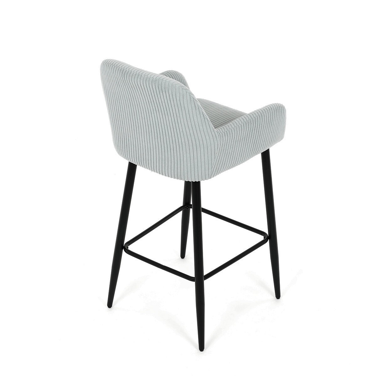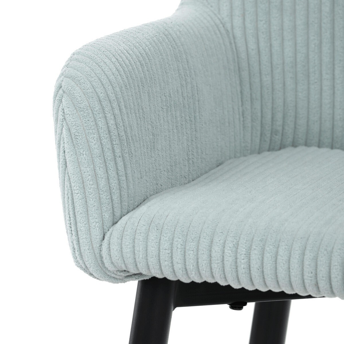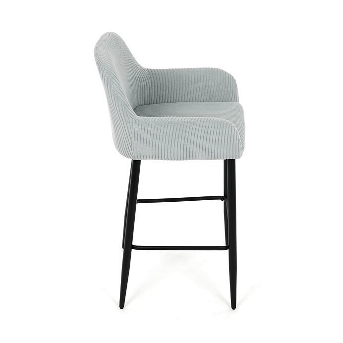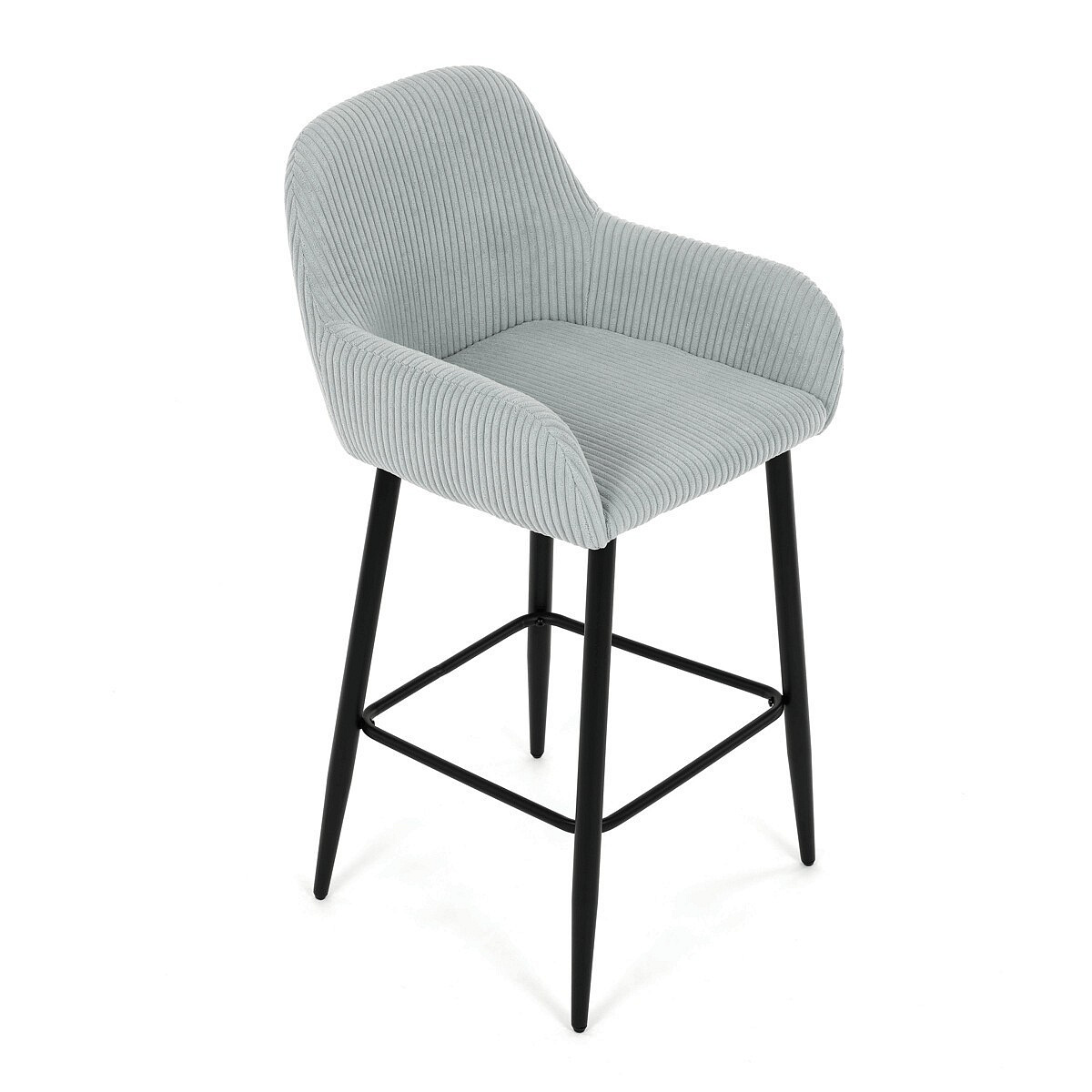 Barová židle s područkami v modrém manšestrovém potahu nabízí pohodlné posezení s příjemnou texturou látky, která je navržena pro dlouhou životnost a snadnou údržbu. Pevné černé kovové nohy zajišťují stabilitu a odolnost, přičemž jejich konstrukce obsahuje i praktickou opěrku nohou pro zvýšení komfortu při sezení. Ergonomicky tvarované opěradlo a područky poskytují dostatečnou oporu paží a zad, což přispívá k pohodlnému posezení u barového pultu nebo kuchyňského ostrůvku. Židle není otočná, což podtrhuje její jednoduchý a stabilní design vhodný do moderních i klasických interiérů. Nosnost a rozměry jsou přizpůsobeny běžným požadavkům na barové sezení.
