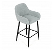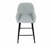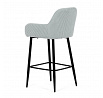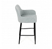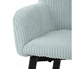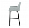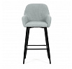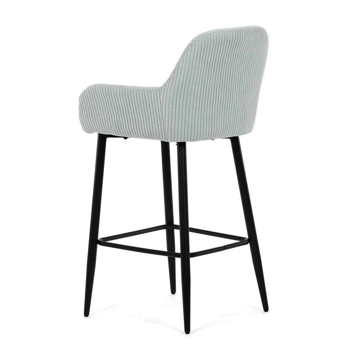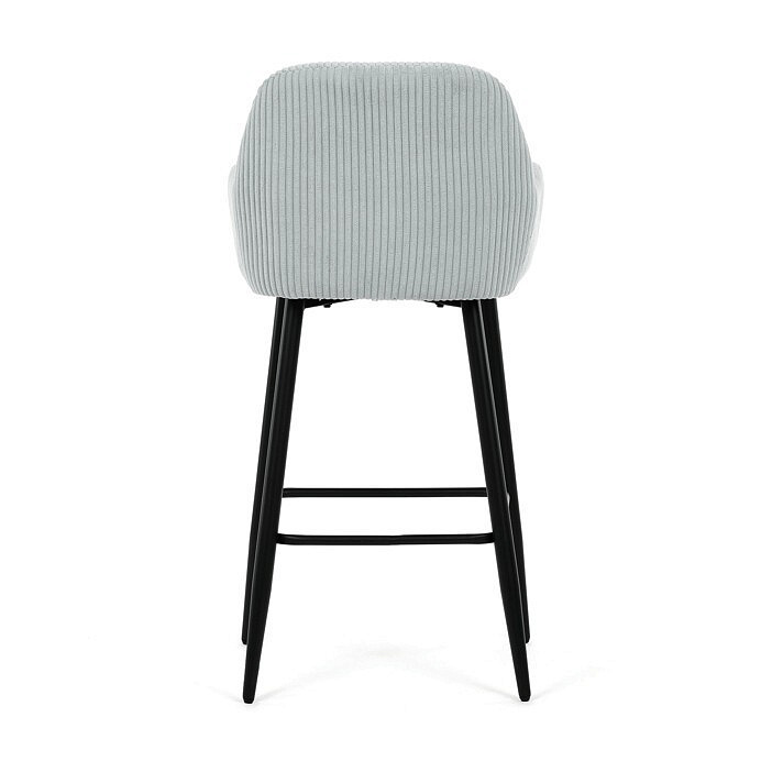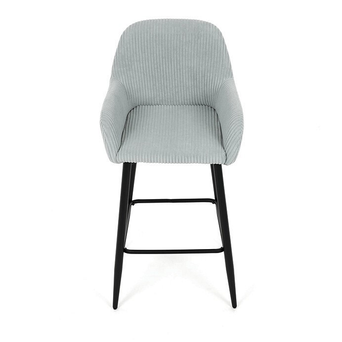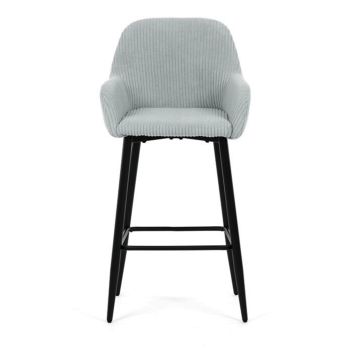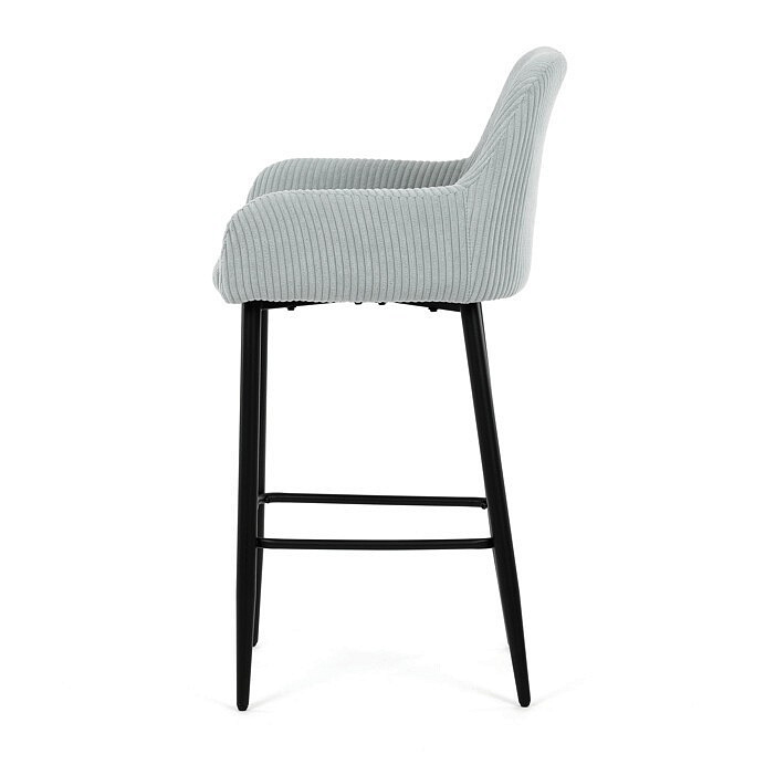 Barová židle s područkami v modrém manšestrovém potahu nabízí pohodlné posezení s příjemnou texturou látky, která je navržena pro dlouhou životnost a snadnou údržbu. Pevné černé kovové nohy zajišťují stabilitu a odolnost, přičemž jejich konstrukce obsahuje i praktickou opěrku nohou pro zvýšení komfortu při sezení. Ergonomicky tvarované opěradlo a područky poskytují dostatečnou oporu paží a zad, což přispívá k pohodlnému posezení u barového pultu nebo kuchyňského ostrůvku. Židle není otočná, což podtrhuje její jednoduchý a stabilní design vhodný do moderních i klasických interiérů. Nosnost a rozměry jsou přizpůsobeny běžným požadavkům na barové sezení.