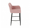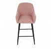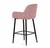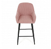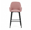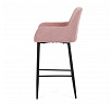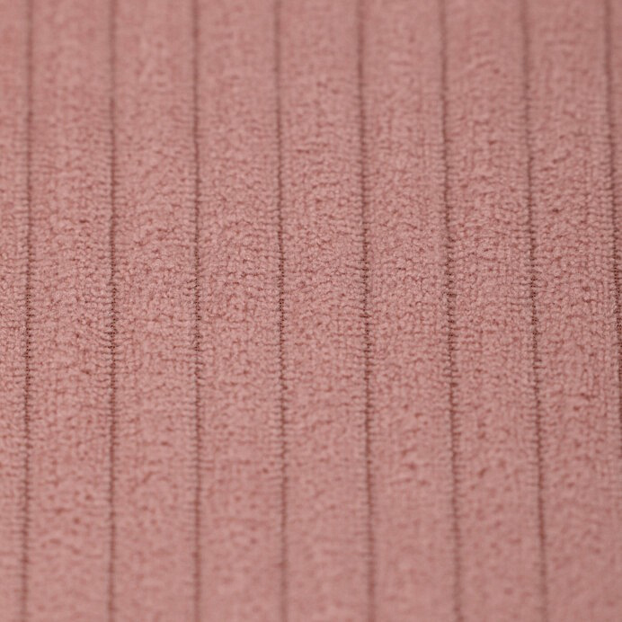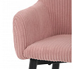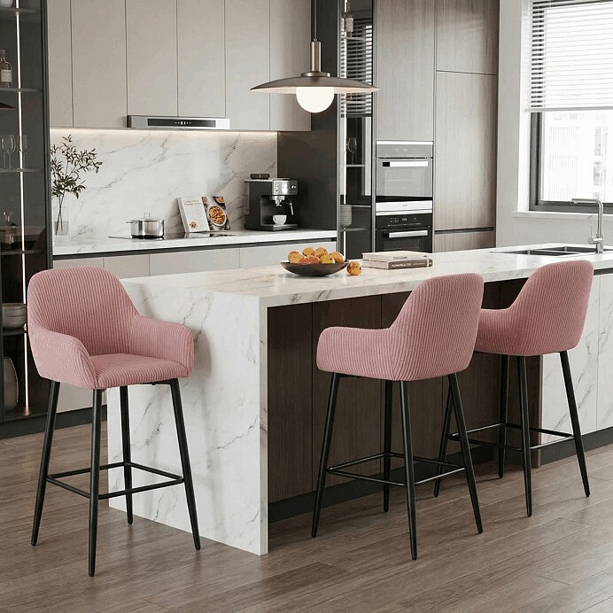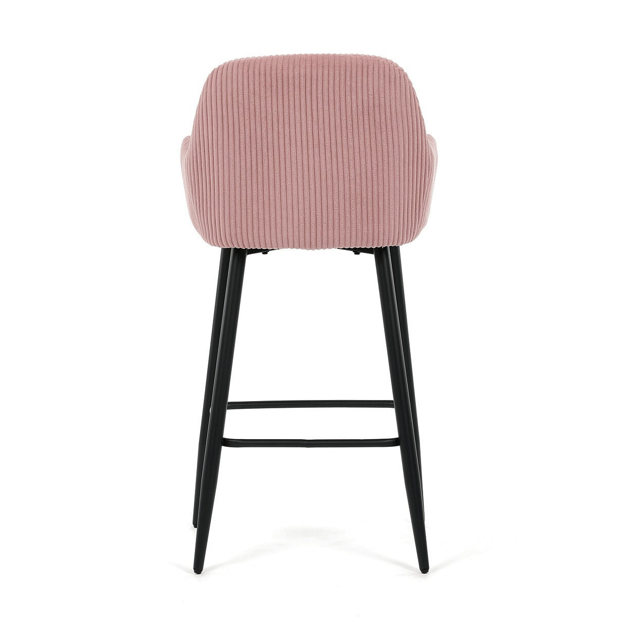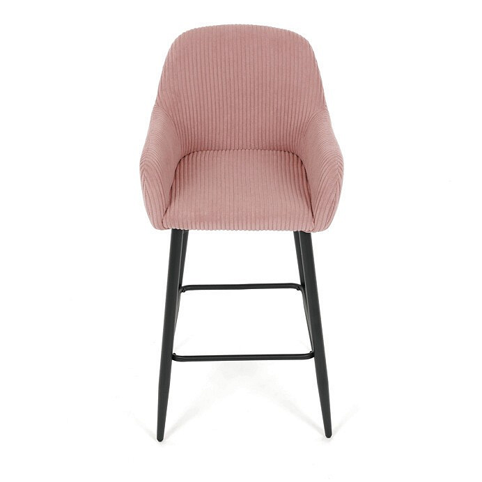 Barová židle s područkami v růžovém manšestrovém potahu kombinuje pohodlí s moderním designem. Sedák a opěradlo jsou čalouněné měkkou manšestrovou látkou, která nabízí příjemnou texturu a snadnou údržbu. Pevné černé kovové nohy zajišťují stabilitu a dlouhou životnost, přičemž spodní příčná výztuha slouží zároveň jako praktická opěrka nohou. Židle není otočná, což podtrhuje její jednoduchý a elegantní vzhled vhodný do barových prostor i kuchyňských koutů. Díky ergonomicky tvarovaným područkám poskytuje dostatečnou oporu pro ruce během posezení.