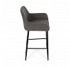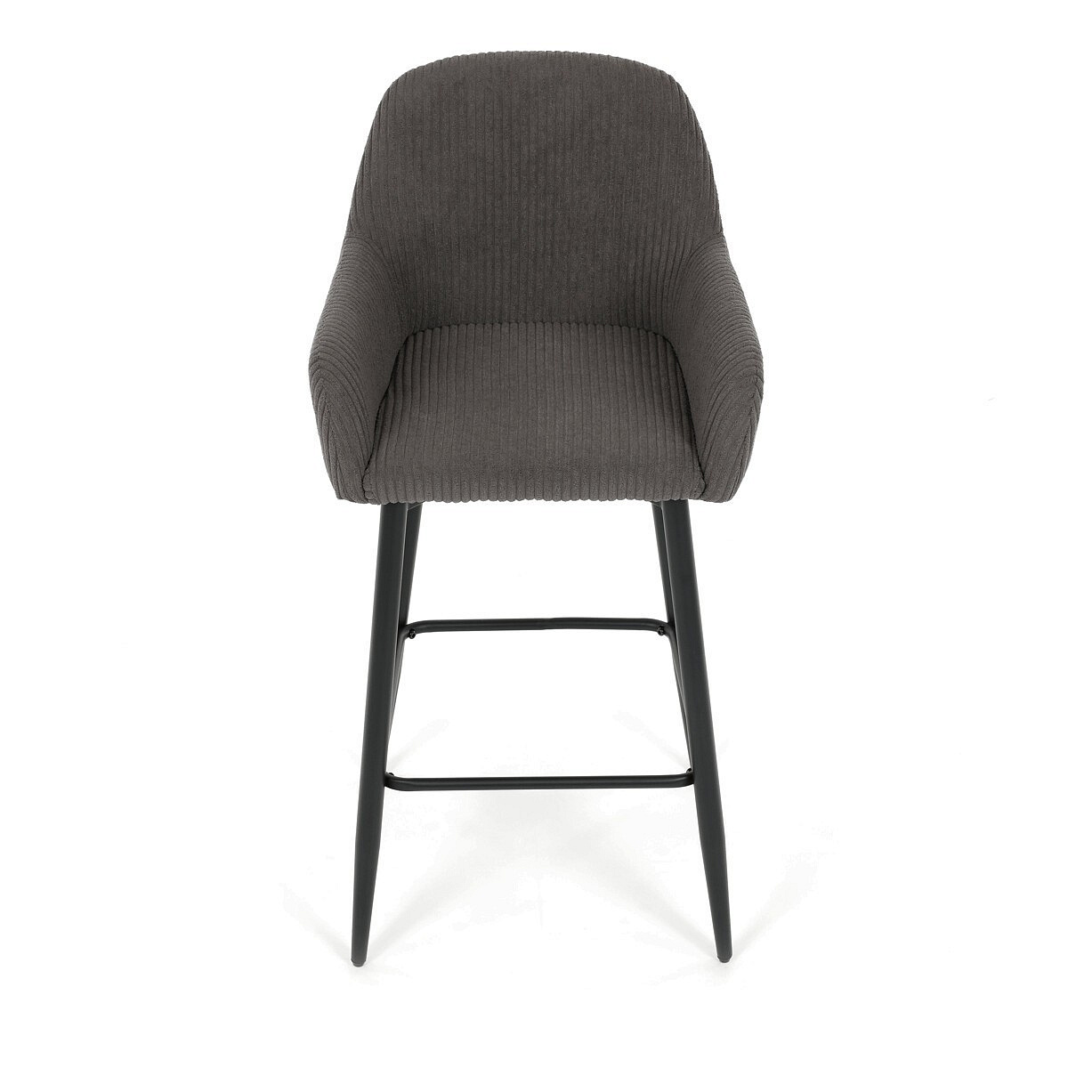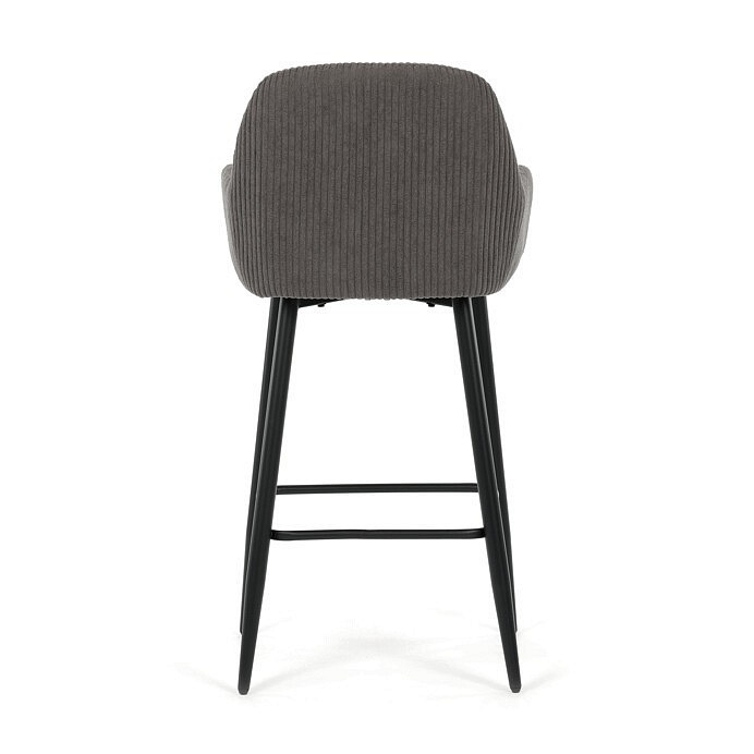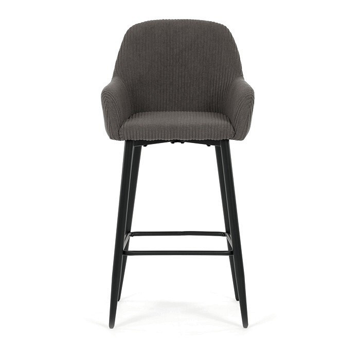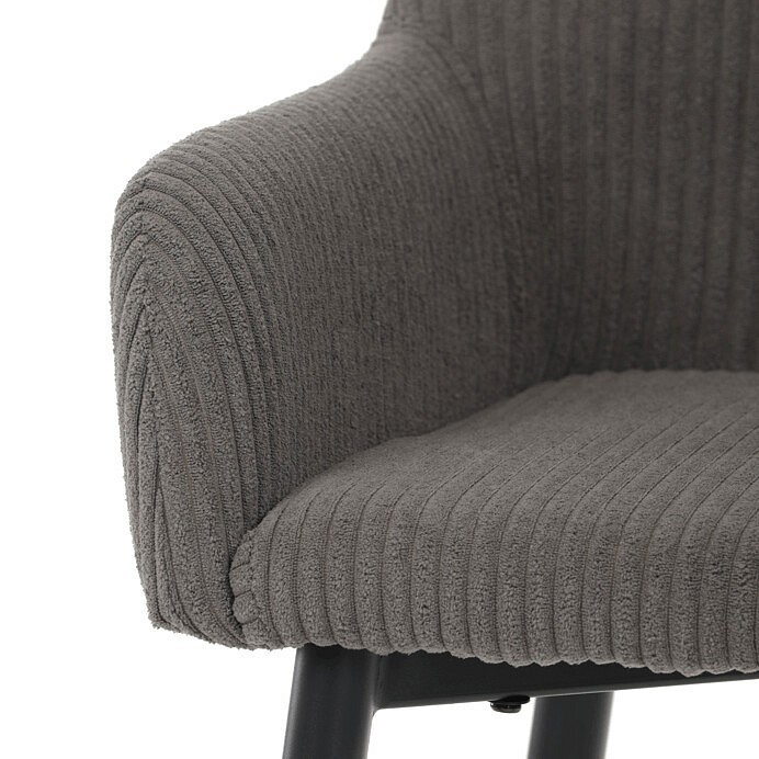 Barová židle s područkami v šedé manšestrové látce nabízí pohodlné posezení s příjemnou texturou materiálu, která je navržena pro dlouhou životnost a snadnou údržbu. Pevná kovová podnož v černém provedení zajišťuje stabilitu a bezpečnost při sezení, přičemž čtvercový rám mezi nohami slouží zároveň jako opěrka nohou pro zvýšení komfortu. Ergonomicky tvarované opěradlo a integrované područky podporují správnou polohu těla a přispívají k pohodlí během delšího sezení. Židle není otočná, což podtrhuje její jednoduchý a stabilní design vhodný do barových prostor i kuchyňských koutů. Celková kombinace manšestrové látky a kovu vytváří moderní a zároveň nadčasový vzhled.