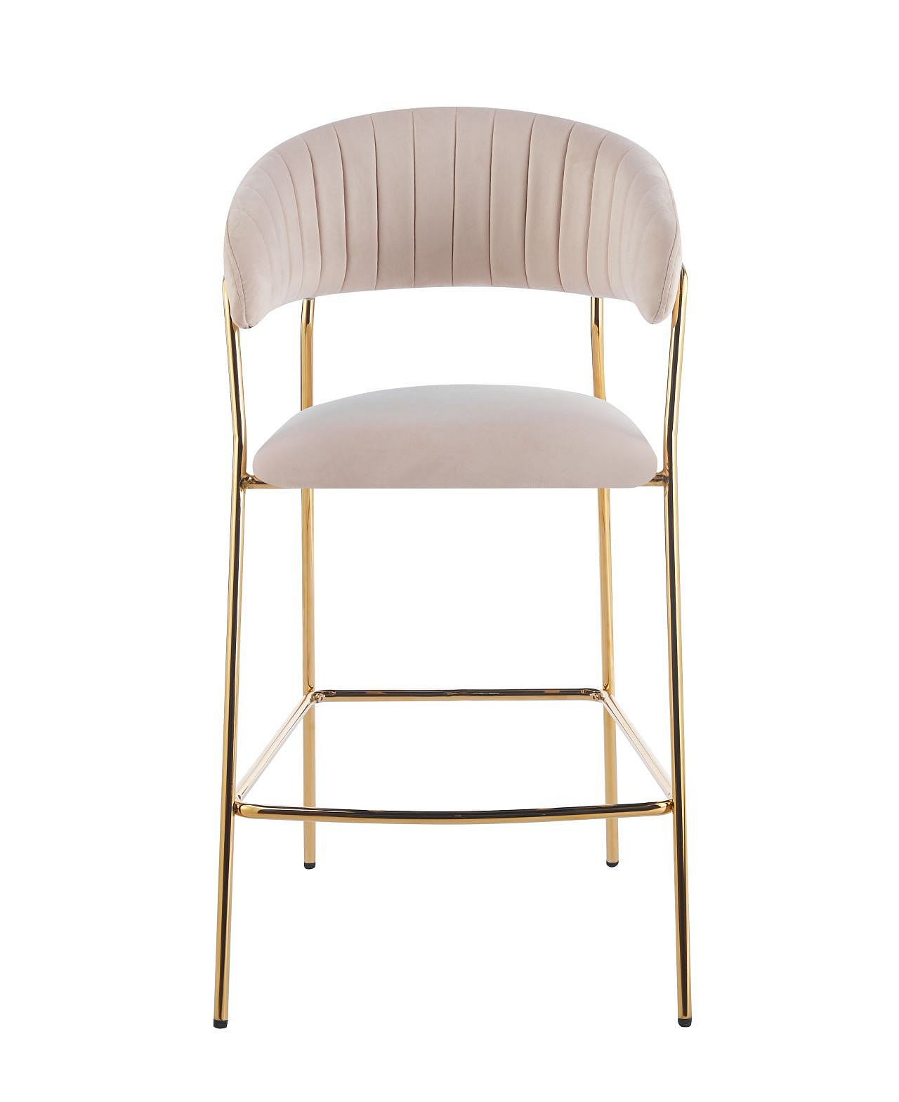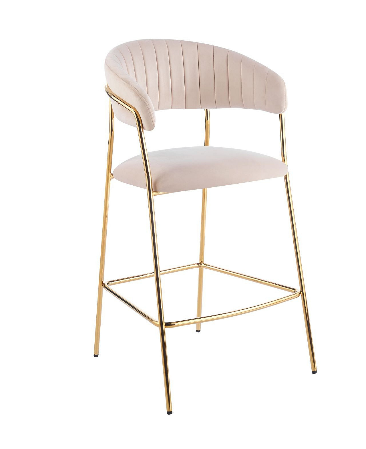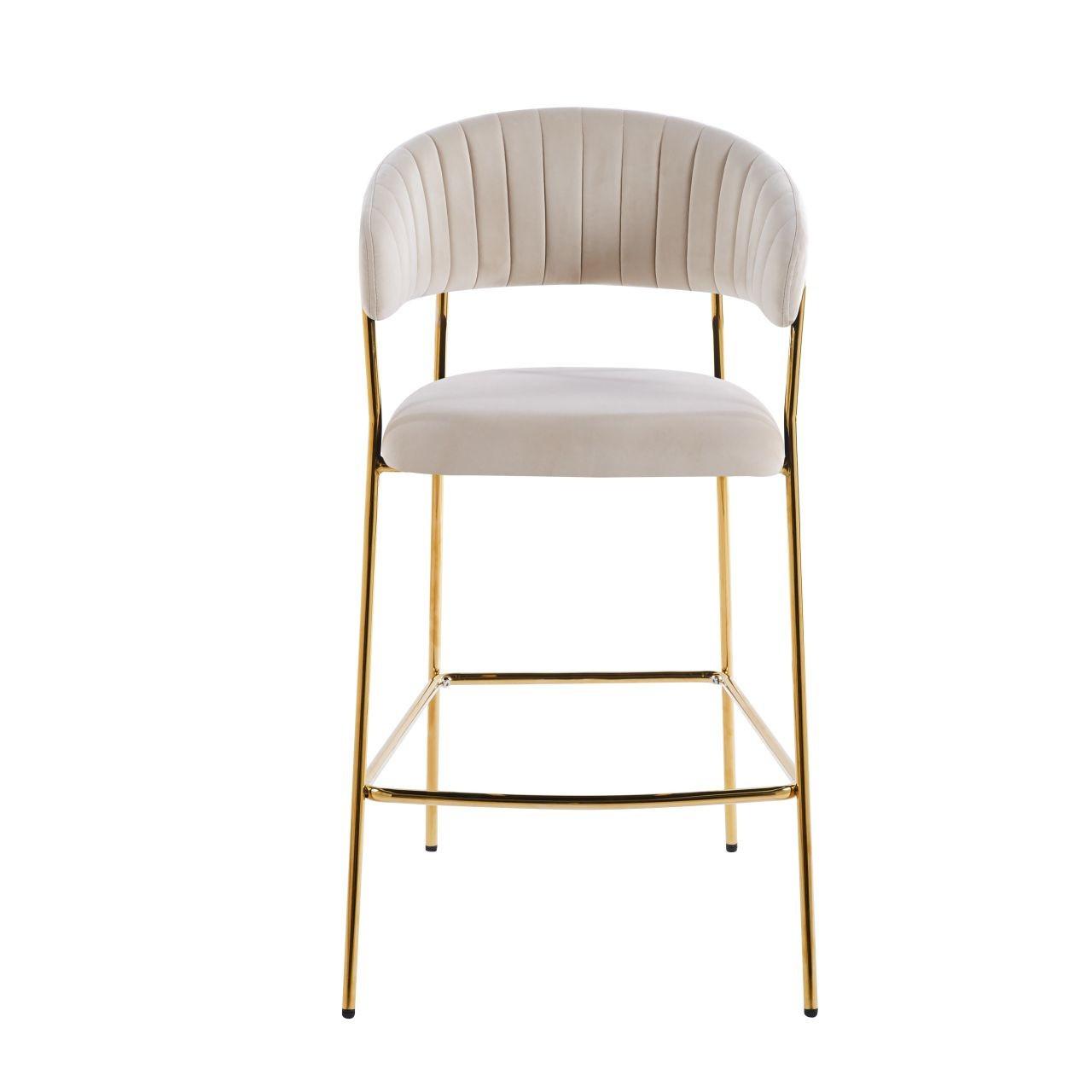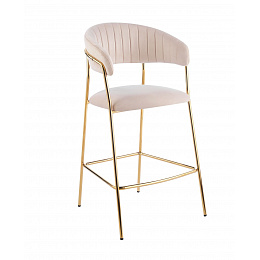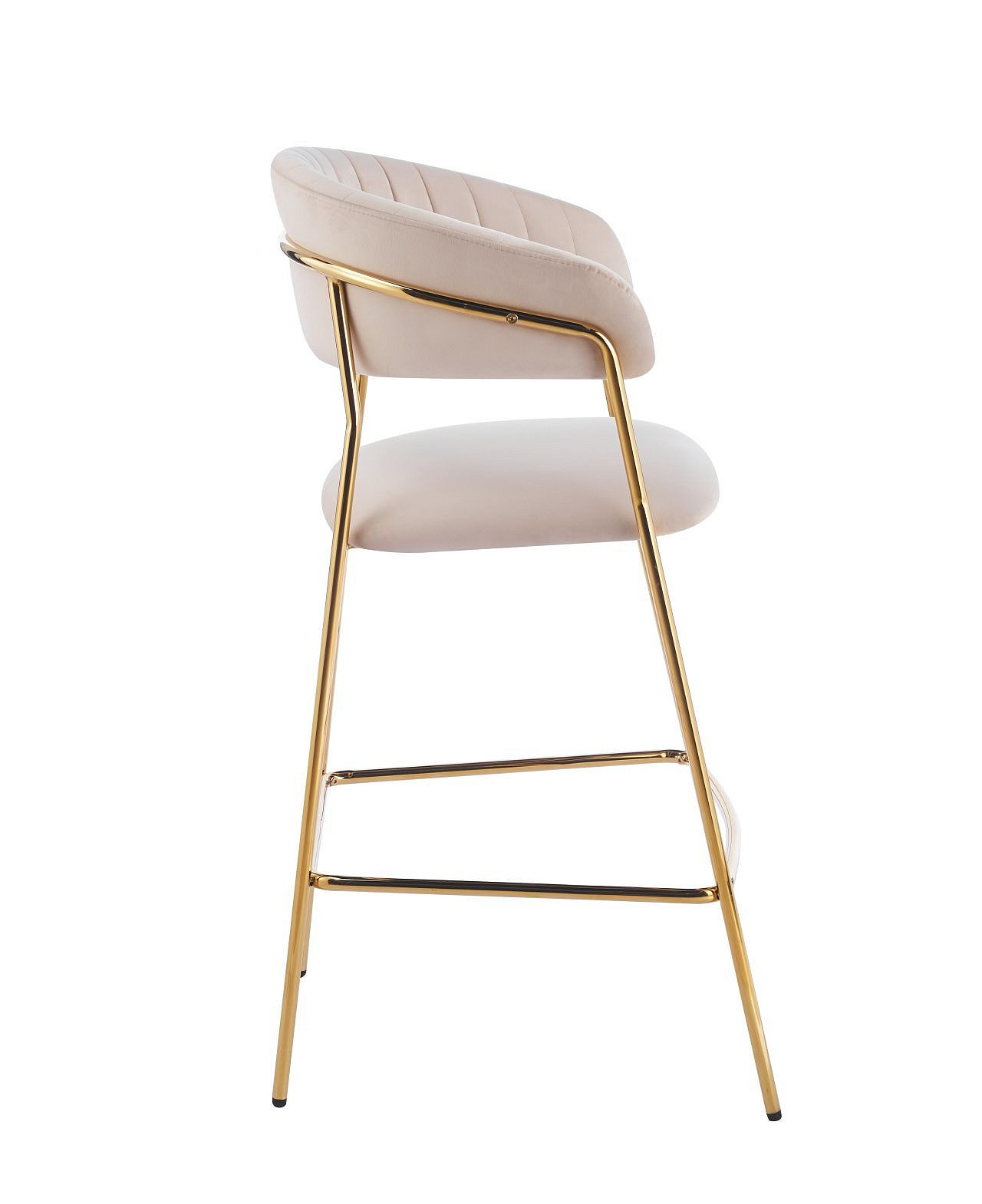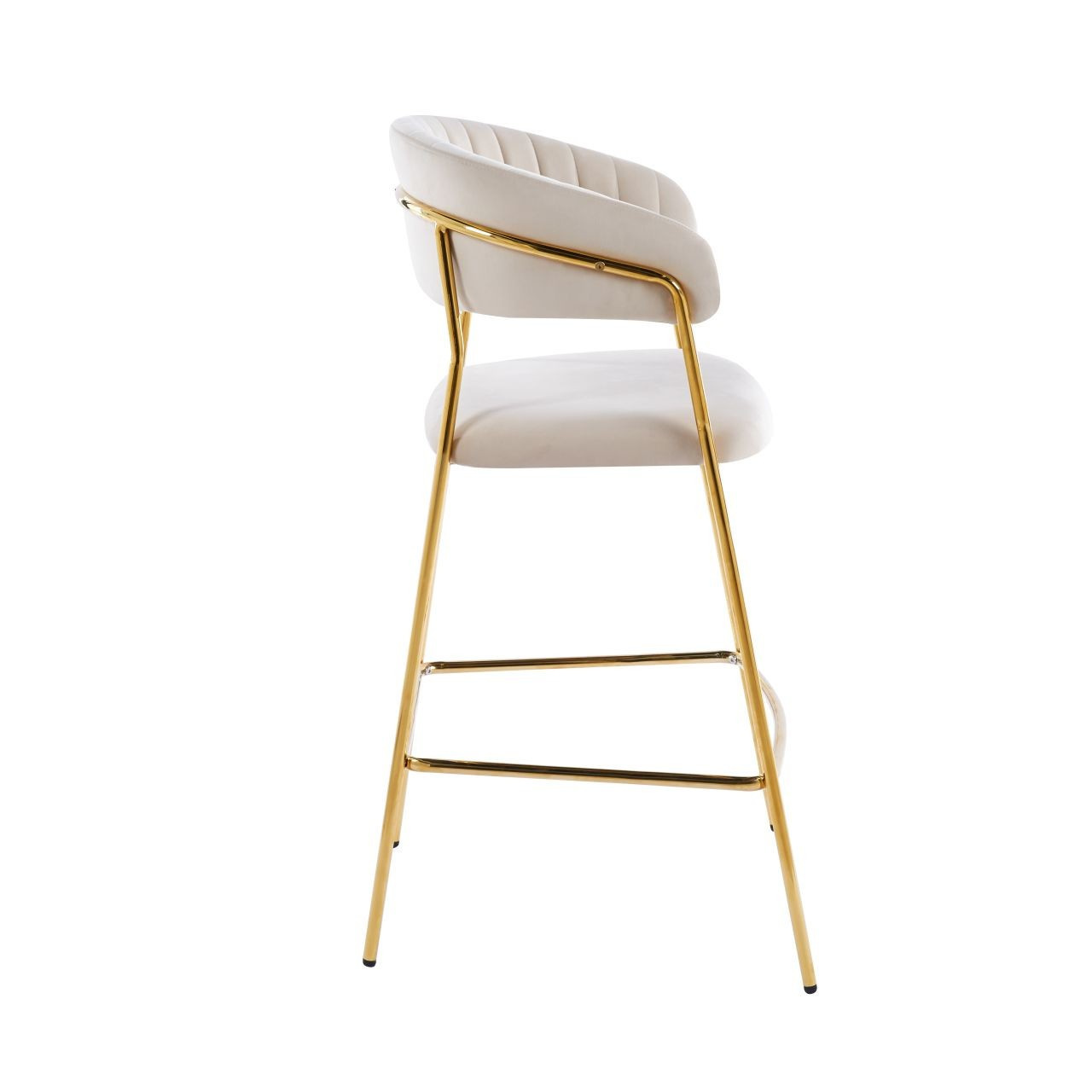Rozměry: - šířka sedáku: 47 cm - výška sedáku: 66 cm - celková výška: 96,5 cm - hloubka sedáku: 42 cm Materiál - čalounění: samet - nohy: chrom Barva: - sedák: béžový - konstrukce: zlatá