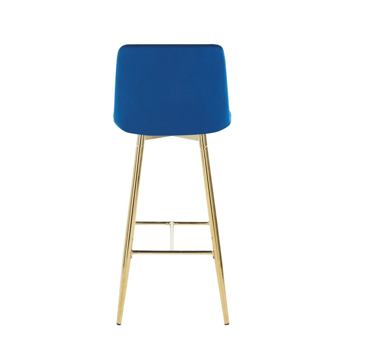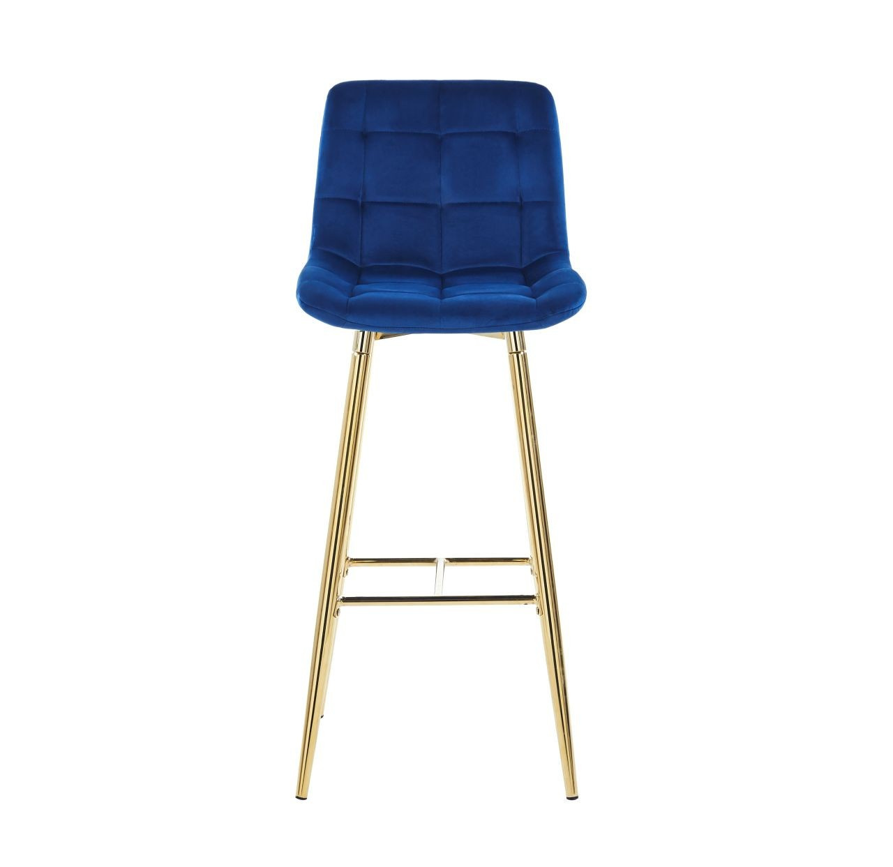 Rozměry: - šířka sedáku: 44 cm - výška sedáku: 77 cm - celková výška: 109 cm - hloubka sedáku: 37 cm Materiál - čalounění: samet - nohy: chrom Barva: - sedák: modrý - konstrukce: zlatá