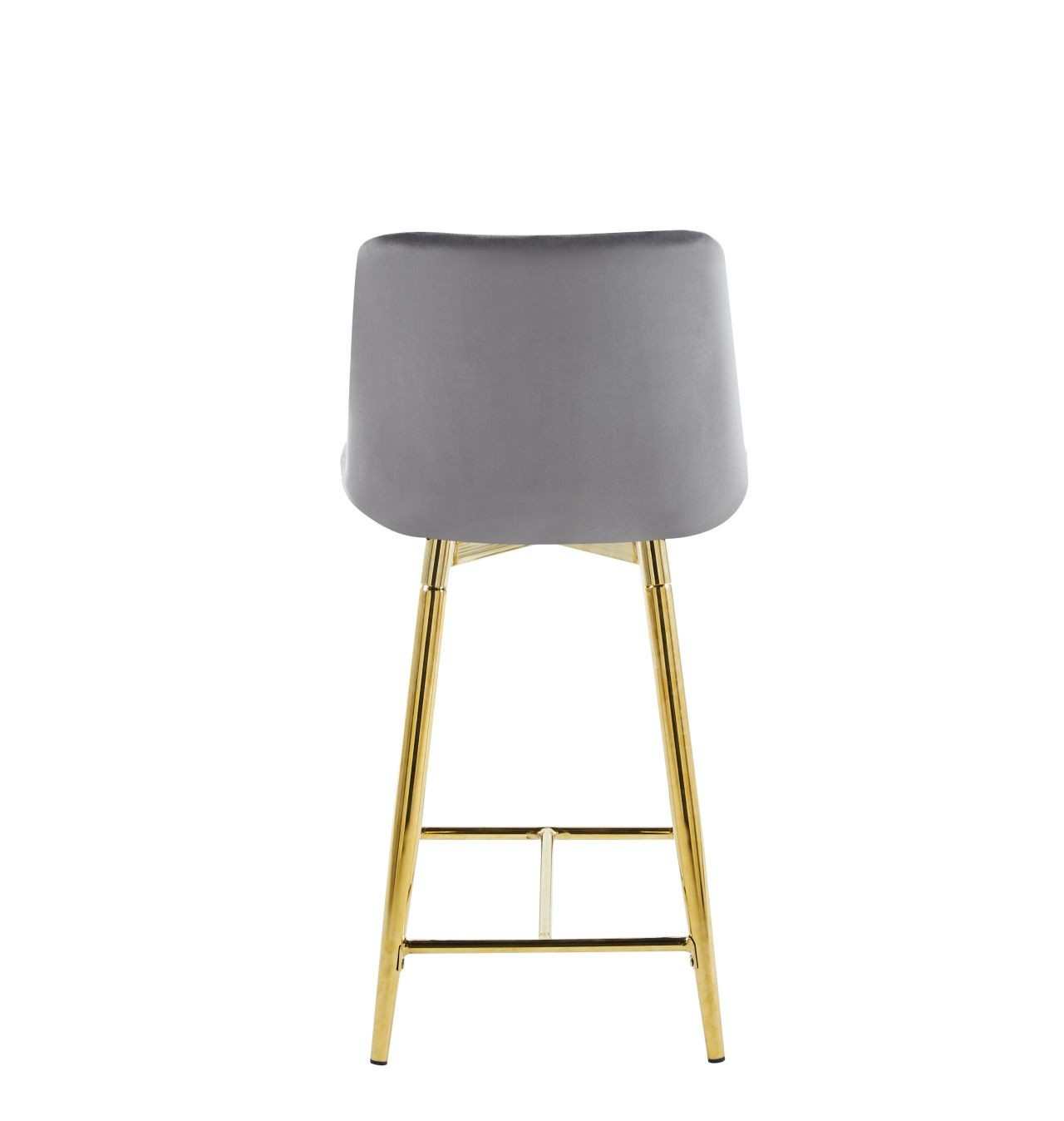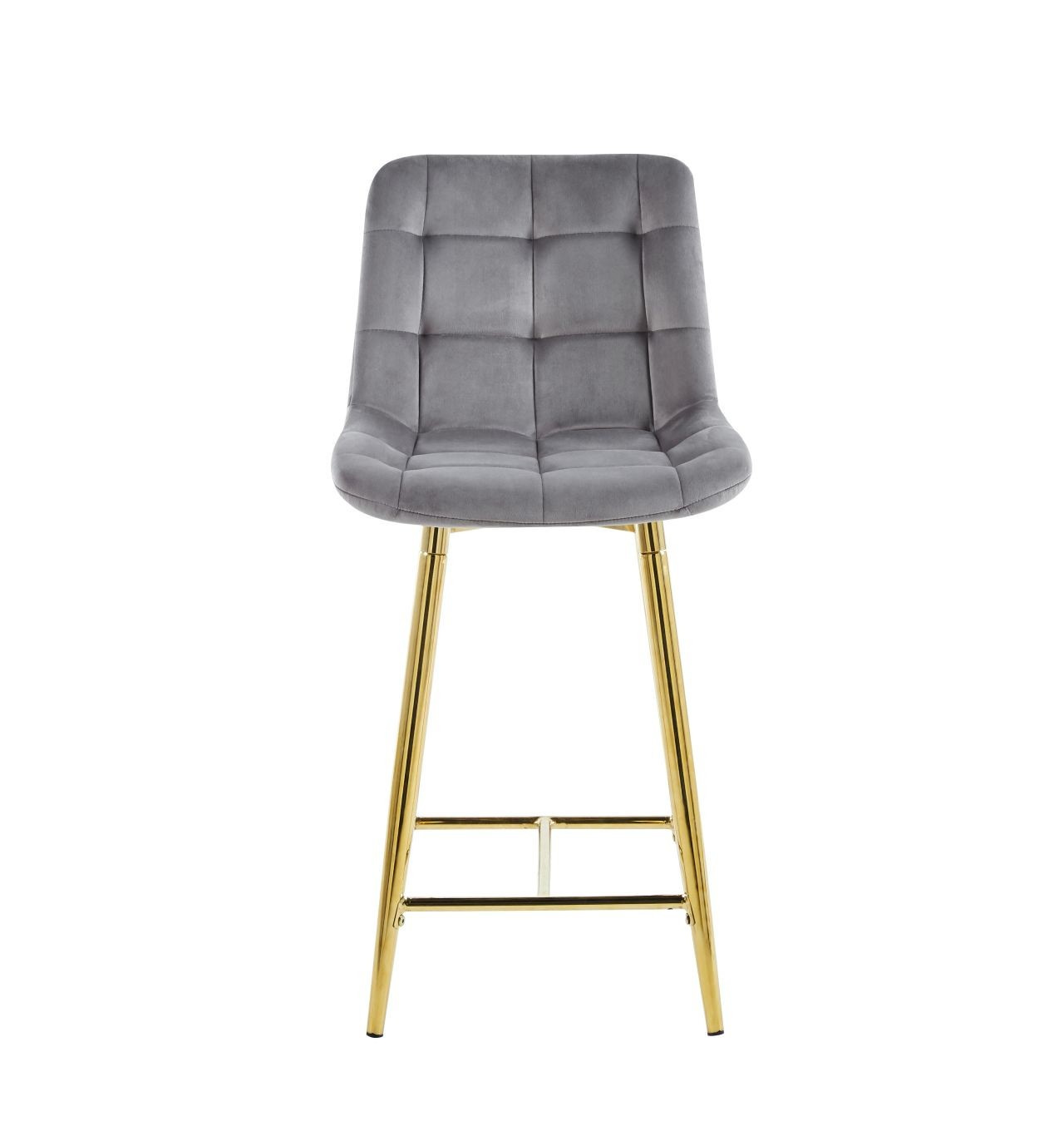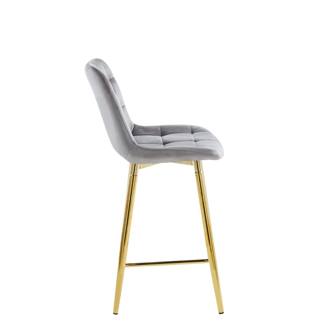 Rozměry: - šířka sedáku: 44 cm - výška sedáku: 61 cm - celková výška: 90 cm - hloubka sedáku: 37 cm Materiál - čalounění: samet - nohy: chrom Barva: - sedák: šedý - konstrukce: zlatá
