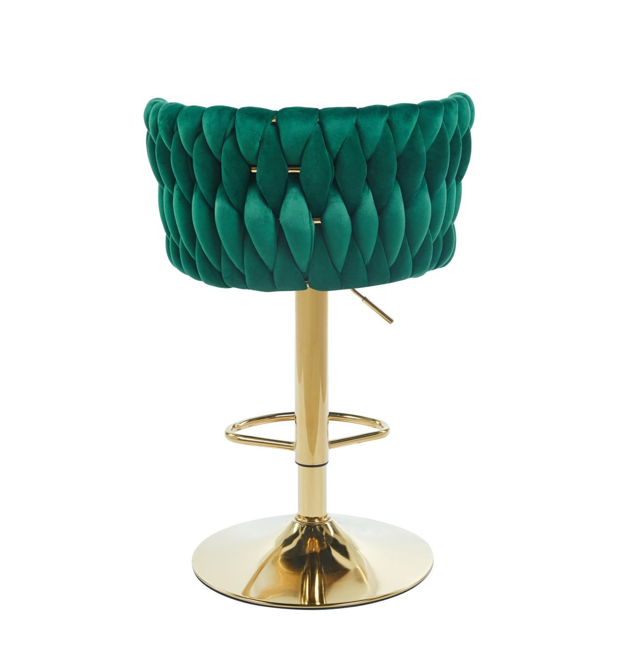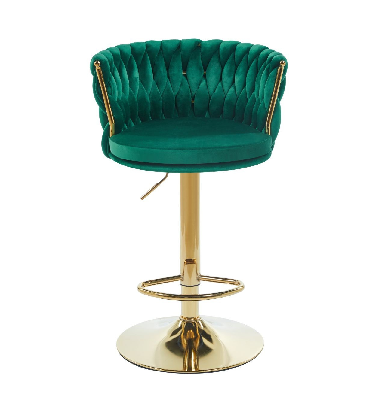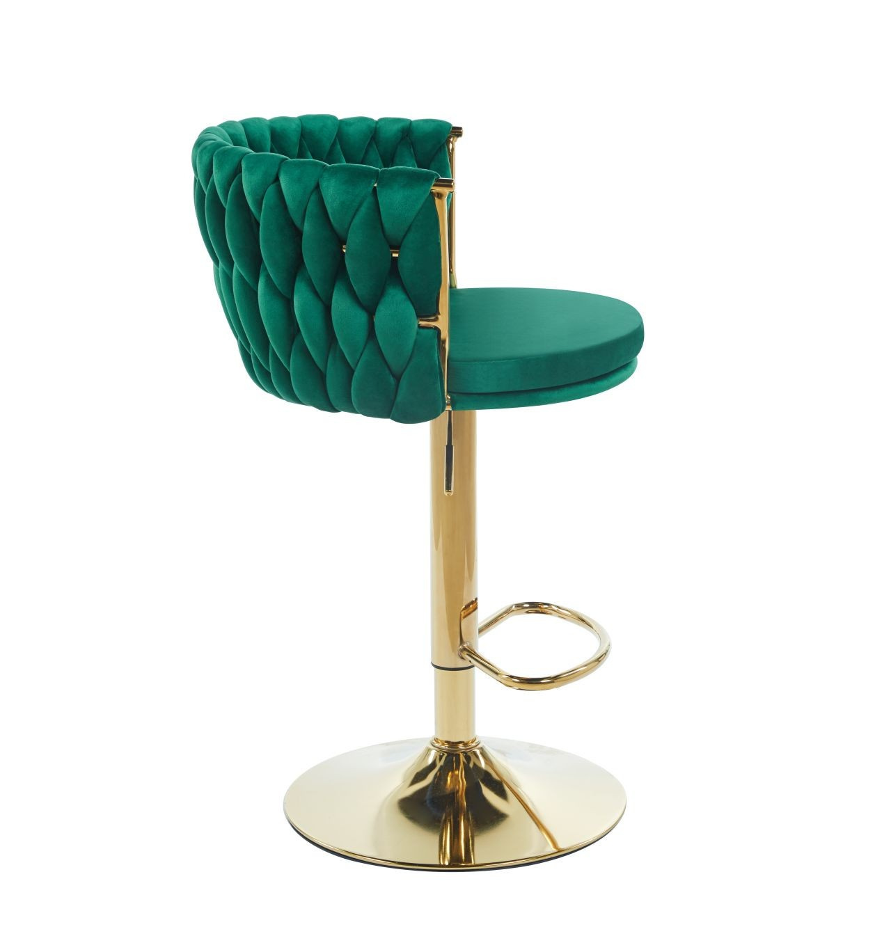 Rozměry: - výška sedáku: 60-80 cm - celková výška: 84-104 cm - výška opěradla: 25 cm - šířka sedáku: 44 cm - velikost sedáku pro sezení 40 cm - celková šířka: 53 cm - hloubka sedáku: 44 cm Materiál - čalounění: samet - konstrukce: chrom Barva: - sedák: zelená - konstrukce: zlatá