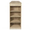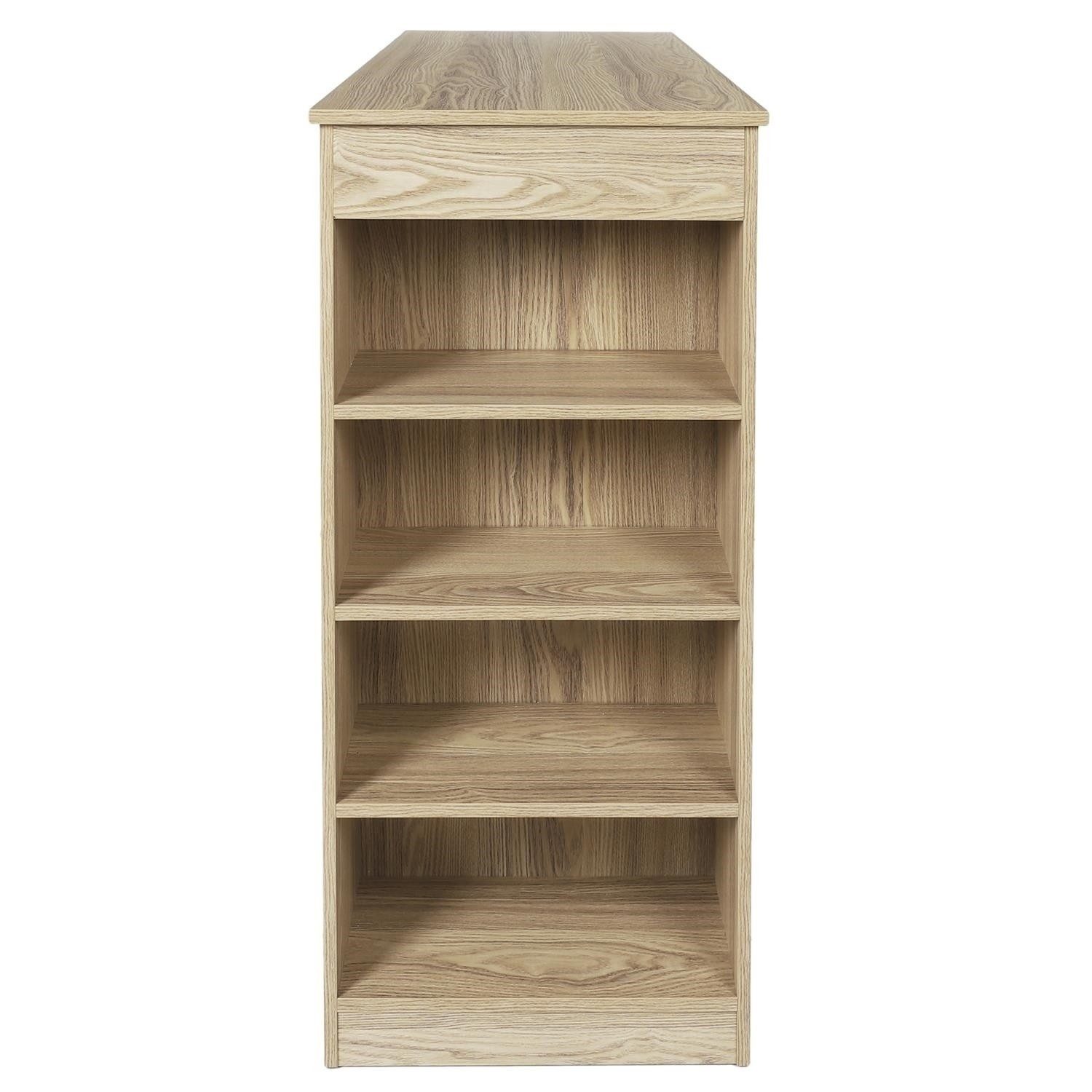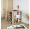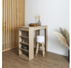 Barový stůl se 4 policemi na boční stěně se osvědčí v minimalistickém a moderním interiéru. Stůl vyrobený z dřevovláknité desky a ozdobený dýhou imitující letokruhy bukového dřeva. Stůl bude vyhovovat dvěma osobám při snídani. Vyžaduje montáž. Max. zatížení 40 kg