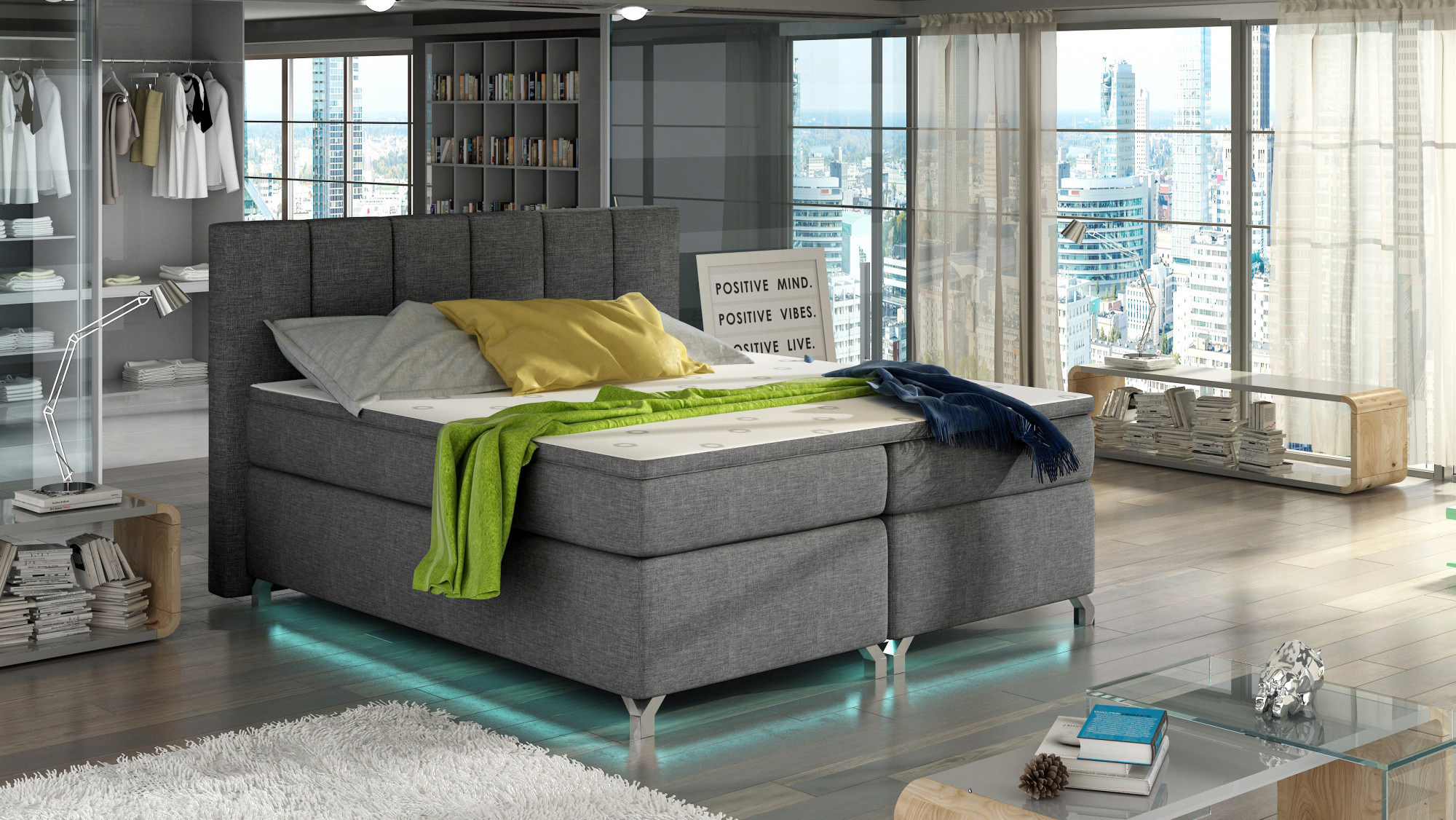 Basilio je nepostradatelným prvkem každé ložnice, který díky svému pohodlí a funkčnosti ovlivňuje nejen pohodlný spánek, ale také vizuální uspořádání ložnice, bez ohledu na její rozlohu. Basilio je boxspringová postel, která je k dispozici ve třech velikostech: 140/160/180 x 200 cm. Jednoduchá konstrukce kusu nábytku byla narušena vysokým opěradlem, vyplněným pěnou T21, a také prostornou bonellovou matrací vysokou 20 centimetrů. Má dvě vrstvy pěny T25, které se nacházejí na horní a spodní části matrace, a také topper vyrobený z pěny T21 o tloušťce 4 centimetry. Vlastnosti modelu Basilio zahrnují opěrku hlavy s prošíváním, prostorný úložný prostor na lůžkoviny rozdělený do 3 částí a také širokou škálu dostupných barev. Nejoriginálnějším dekorativním prvkem našeho nábytku je možnost vybavit jej LED osvětlením. Pokud vám záleží na maximálním pohodlí, správném umístění těla během spánku a jedinečné dekoraci pokoje, která rozzáří stávající interiér - Basilio bude jistě ideální volbou.