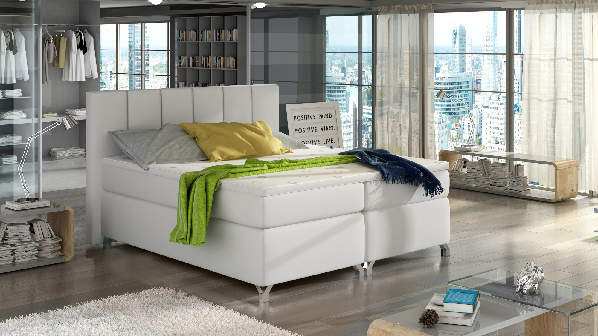 Basilio je nepostradatelným prvkem každé ložnice, který díky svému pohodlí a funkčnosti ovlivňuje nejen pohodlný spánek, ale také vizuální uspořádání ložnice, bez ohledu na její rozlohu. Basilio je boxspringová postel, která je k dispozici ve třech velikostech: 140/160/180 x 200 cm. Jednoduchá konstrukce kusu nábytku byla narušena vysokým opěradlem, vyplněným pěnou T21, a také prostornou bonellovou matrací vysokou 20 centimetrů. Má dvě vrstvy pěny T25, které se nacházejí na horní a spodní části matrace, a také topper vyrobený z pěny T21 o tloušťce 4 centimetry. Vlastnosti modelu Basilio zahrnují opěrku hlavy s prošíváním, prostorný úložný prostor na lůžkoviny rozdělený do 3 částí a také širokou škálu dostupných barev. Nejoriginálnějším dekorativním prvkem našeho nábytku je možnost vybavit jej LED osvětlením. Pokud vám záleží na maximálním pohodlí, správném umístění těla během spánku a jedinečné dekoraci pokoje, která rozzáří stávající interiér - Basilio bude jistě ideální volbou.