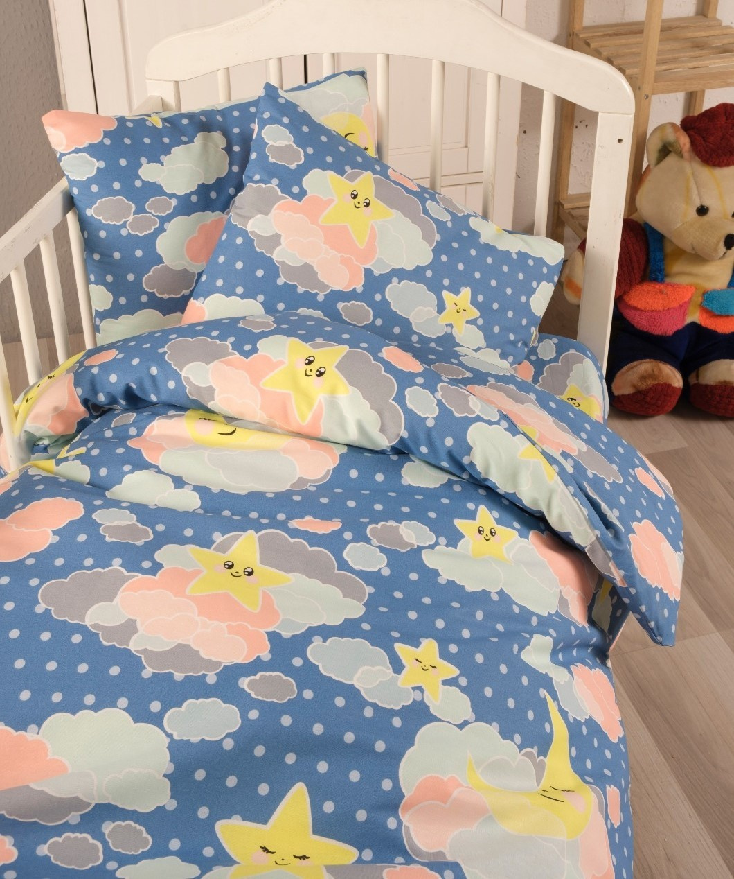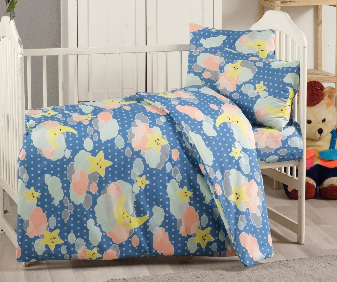 Bavlněné dětské povlečení do malé postýlky 90x135, 45x60 cm obloha modrá zipový uzávěr