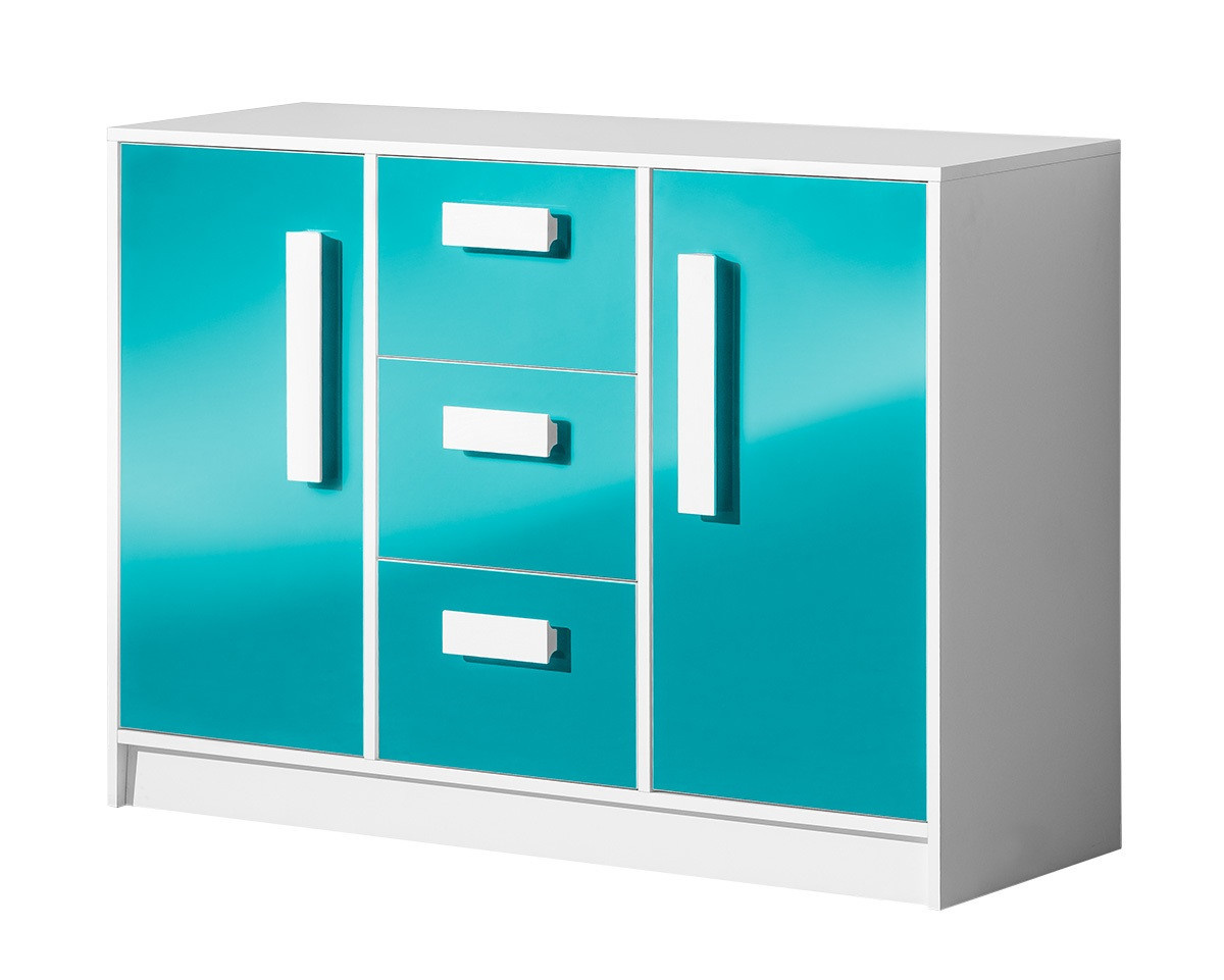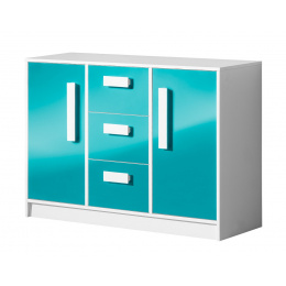 GOLIÁŠ 6- komoda nízká se 2 dvířkami 3 šuplíky (GULIVER 6)-korpus bílá/dvířka tyrkysová lesk/úchyt bílá (DO) (Z)