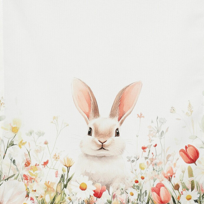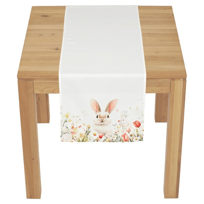 Běhoun na stůl s motivem zajíce v rozkvetlé louce je vyroben z 100% polyesteru, který se snadno udržuje a zachovává si barevnou stálost. Jeho jemná textilie s přírodními odstíny květin a detailním zpracováním zajíce přináší do interiéru svěží a příjemnou atmosféru. Rozměry 40 x 150 cm umožňují univerzální použití na různé typy stolů, kde vynikne jako dekorativní prvek vhodný pro jarní i celoroční výzdobu. Běhoun je ideální pro doplnění jídelního nebo konferenčního stolu a podtrhuje stylové aranžmá prostoru.