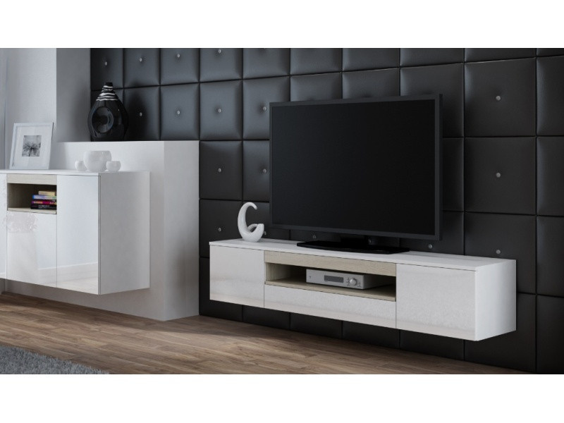 Komoda je závěsná a skládá z šuplíku a skříněk které se otevírají systémem tzv. PUSH&CLICK (pouhým zatlačením do dvířek).