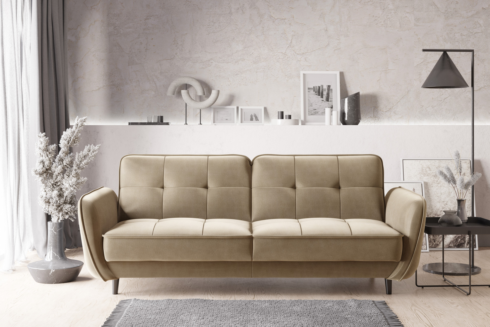 Pohovka Bellis kombinuje klasickou eleganci s moderním stylem. Pohovka Bellis s funkcí spaní je doplněna elegantními dřevěnými nohami, které přinášejí do každé místnosti nádech přírody. Šířka pohovky 220 centimetrů je vhodná pro středně velký obývací pokoj, zatímco 11 centimetrů vysoké nohy vizuálně zvětšují menší místnost a umožňují úklid pod nábytkem. Bellis je také dodáván s úložným prostorem na lůžkoviny - užitečné, pokud není místo na další deky nebo polštáře. Pohovka Bellis má také funkci spaní. Díky mechanismu skládání click-clack můžete rychle a snadno proměnit pohovku v pohodlnou postel. Navíc není potřeba pohovku Bellis odsunovat od zdi, když je rozložena a aktivována funkce spaní. Bellis nabízí ležící plochu o rozměrech 190x110 centimetrů. Kus nábytku je vyplněn vysoce flexibilní HR pěnou, která je známá svou pevností a odolností. Sedák pohovky i opěradlo jsou vybaveny tímto typem pěny. Rozkládací pohovka Bellis je také vybavena vysoce kvalitním jádrem s pružinami typu B a kapsovými pružinami. Ozdoby ve formě prošívání a quiltování jsou zodpovědné za estetickou stránku pohovky.