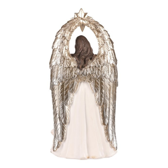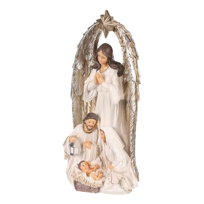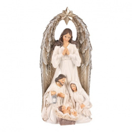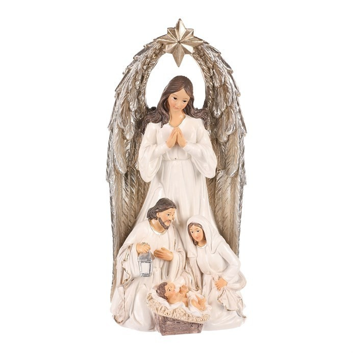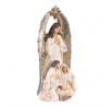 Vyzdobte si patřičně svůj prostor o vánočních svátcích právě touto soškou svaté rodiny s andělem. Je vyrobena z polyresinu a představuje nám okamžik, kdy panna Marie a svatý Josef klečí u narozeného Ježíška. Hlavní dominantou však je velký anděl s hvězdou, stojící za nimi, který nad celou rodinou dohlíží a žehná jim. Tato dekorace na postavení je hlavním symbolem Vánoc, která nesmí ve vaší sbírce chybět. Přinese vám do domova odkaz důležitosti rodiny a zachování tradic. Umístěte ji na vhodné místo a nechte ji rozšířit pokojnou atmosféru a pohádkový dotek svátků.