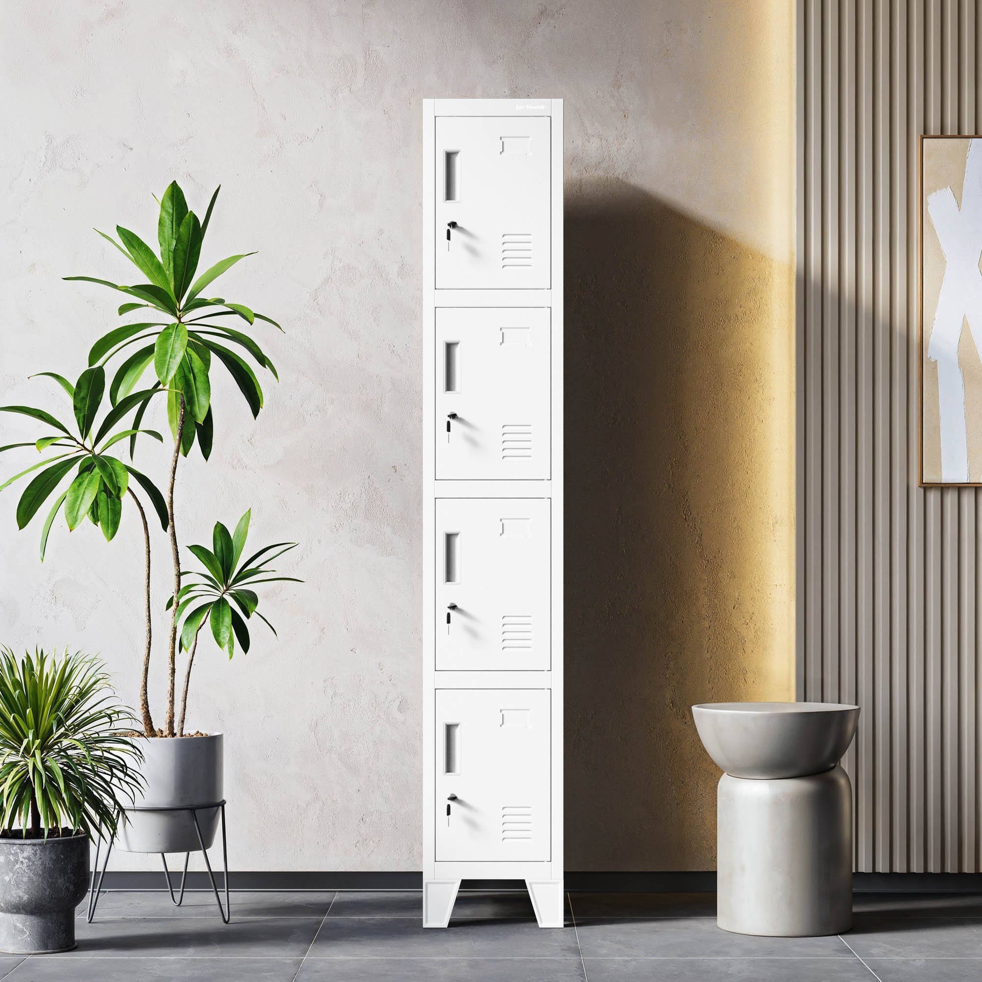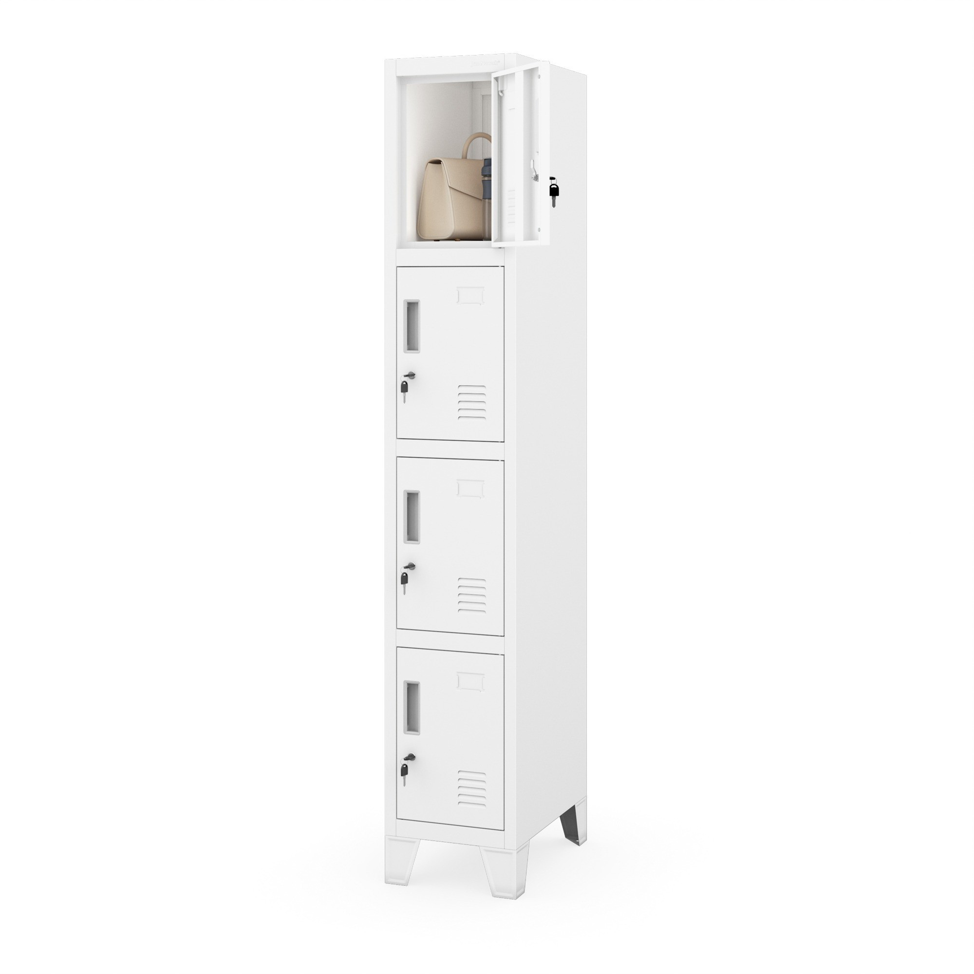 - Bezpečnost: Každá skříňka je vybavena kvalitním zámkem, který chrání osobní věci před neoprávněným přístupem.